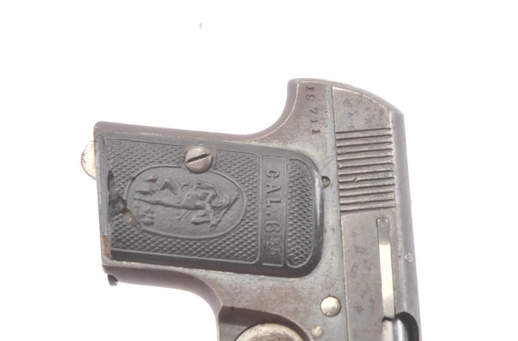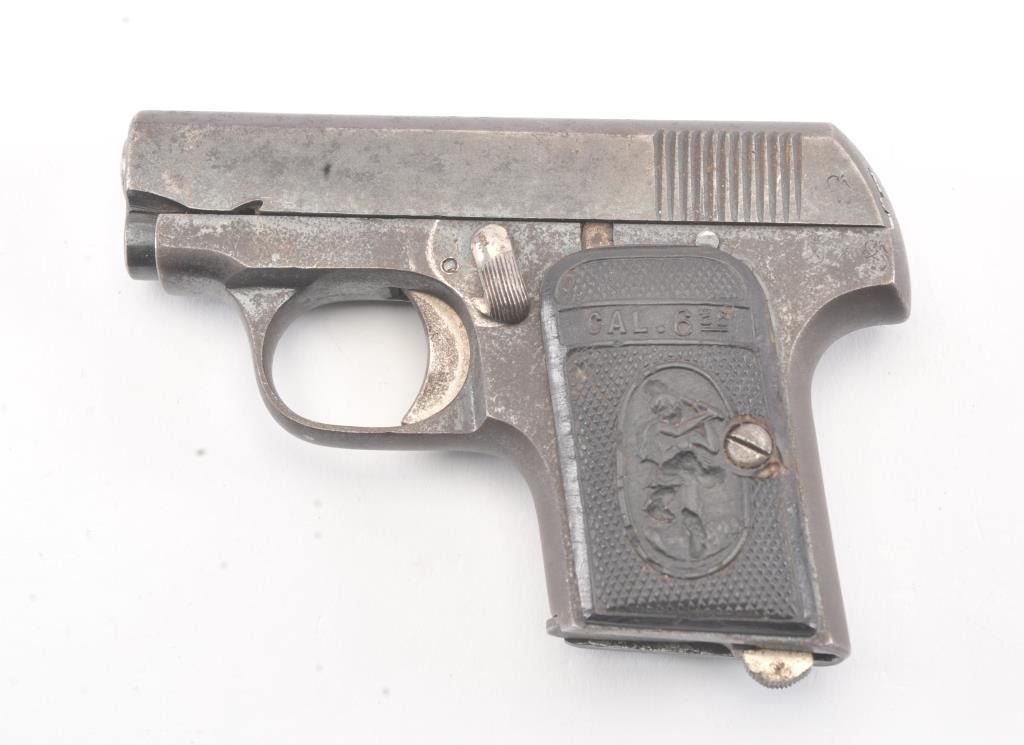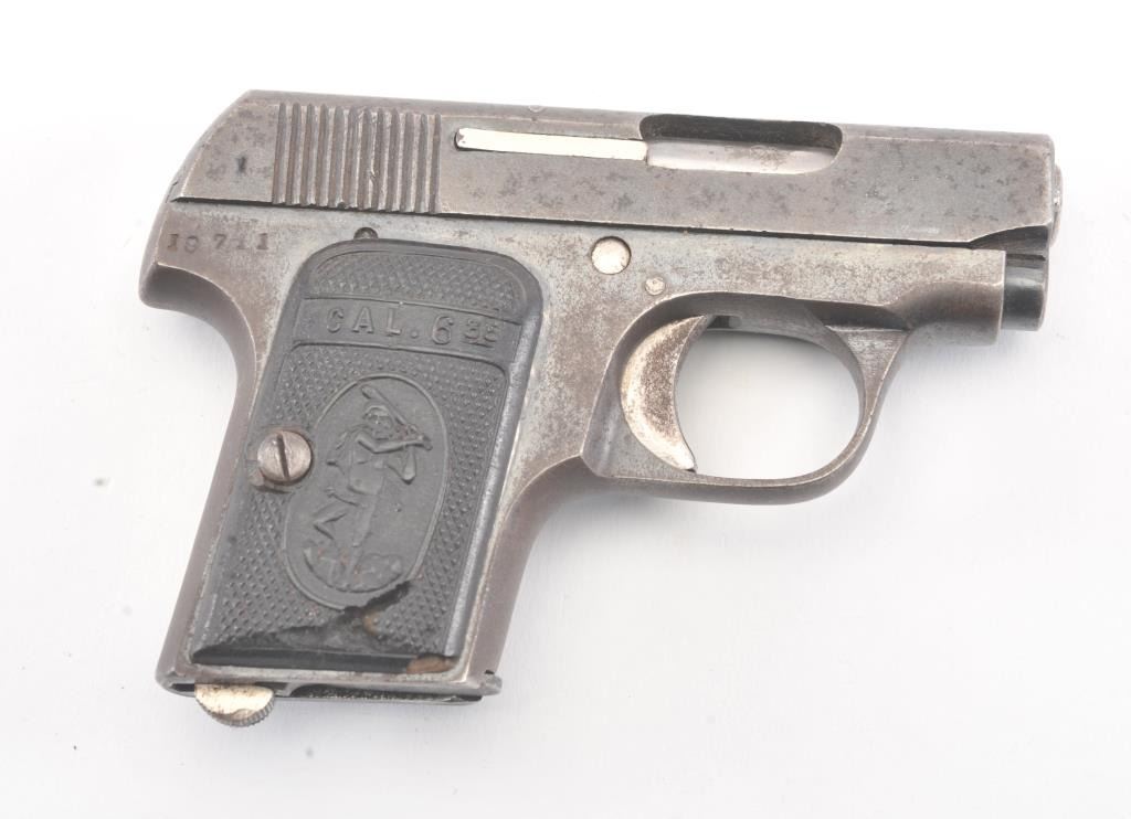 Spanish made .25 ACP caliber “Hercules” Semi-Auto pocket pistol circa about 1920s-30s, S/N 10711. Pressed horn died grips showing losses on the right from “worming” in the horn. Fair condition with scratchingand erosion. From the Randolpho De Besslerini collection, count of Carson City casinos (Just joking!) (C&R/PPT) Est.: $100-$200