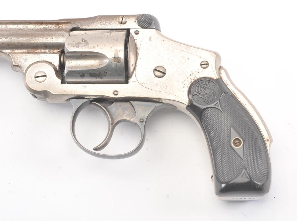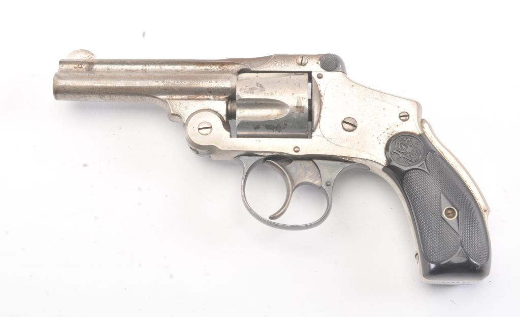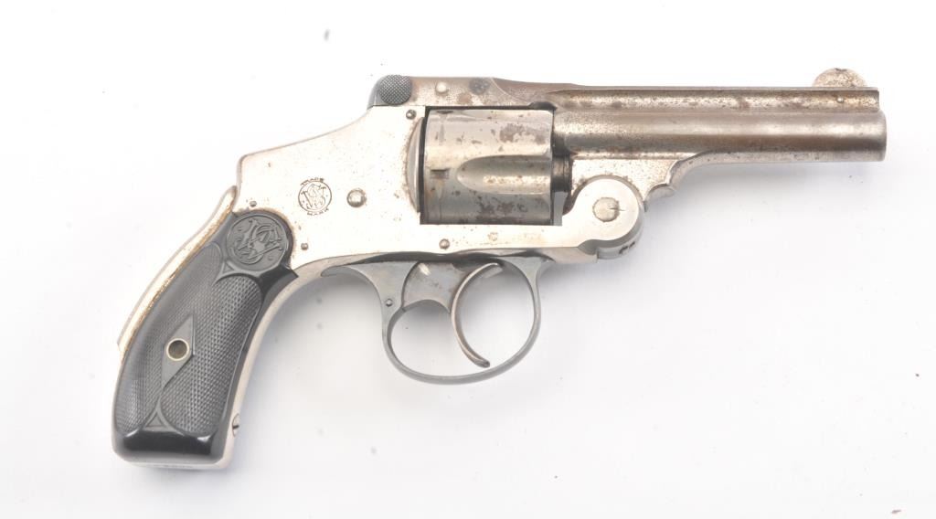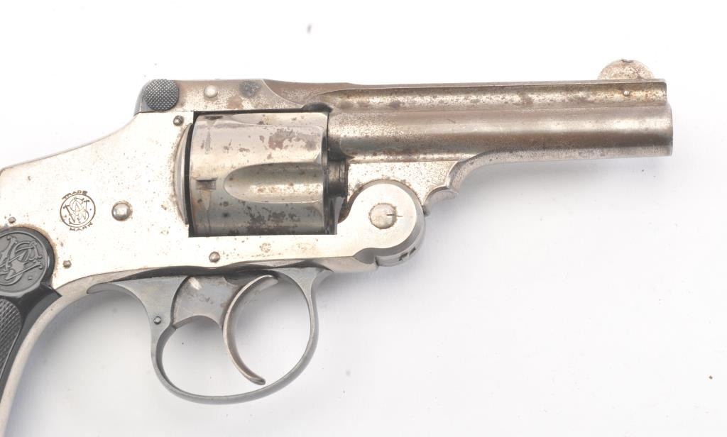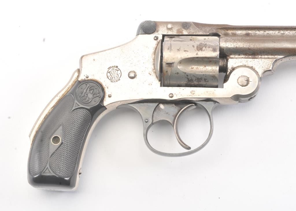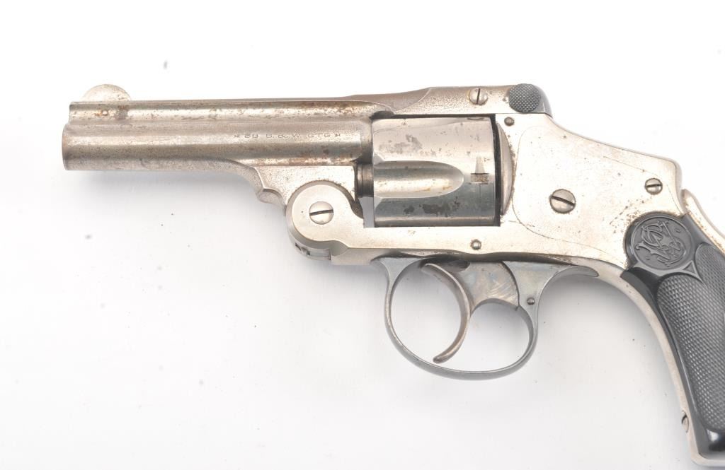Smith & Wesson New Departure .38 caliber double Action Revolver with hard rubber grips and nickel plated, S/N 163000. 40%-60% nickel remaining with minor pitting and erosion. Grips are very good and the actionis good. The bore is fair to good. (C&R/No PPT) Est.: $175-$350