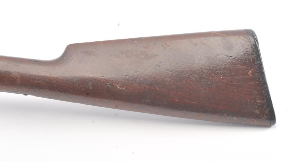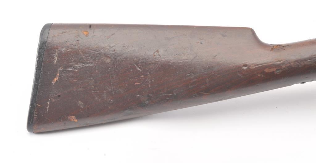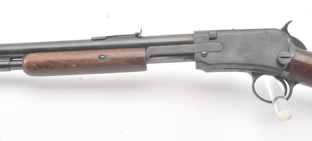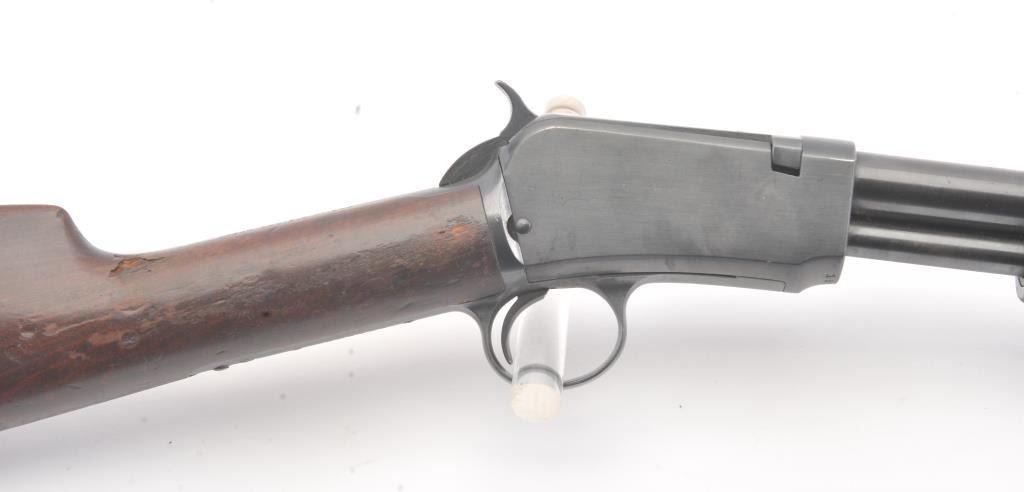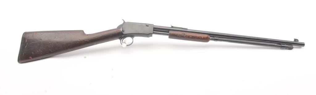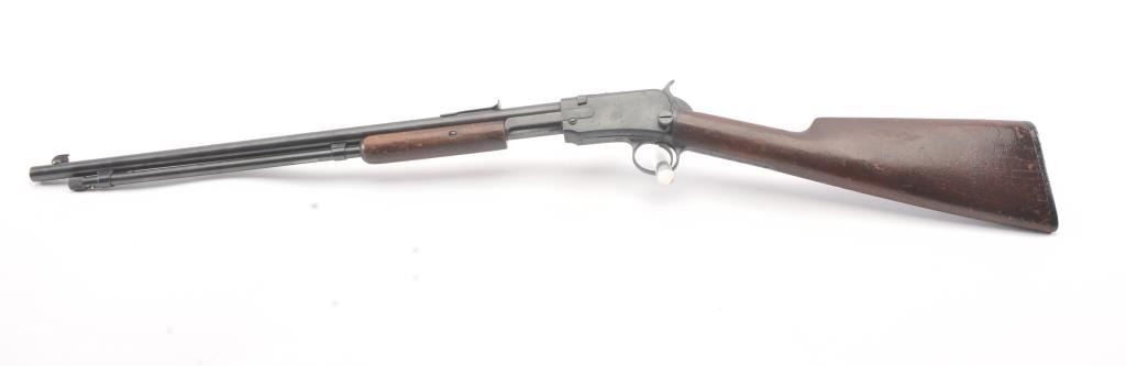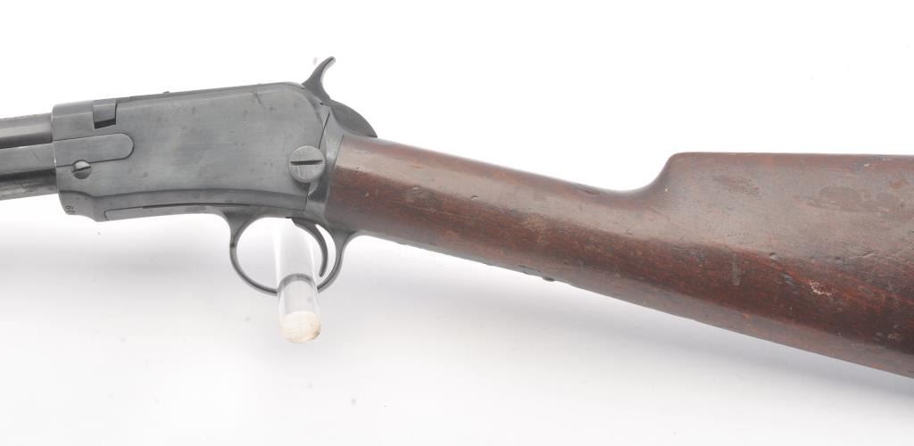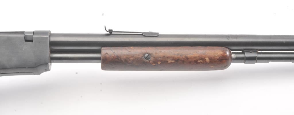 Winchester Model 1906 Pump Action Rifle in .22 S, L, LR, S/N 199909. 85%-95% original blue remaining with spotting mostly on the left side of the frame which has affected the blue. Sharp and crisp markings. 1901 markedpatent rear sight and marble blade style front sight in original base. Non-grooved marksman type fore end and hard rubber shows wear and a grooved section by top screw. Many areas of nicking and heat affecting stockfinish that could be improved considerably. The action is good and the bore is very good. (C&R) Est.: $250-$500