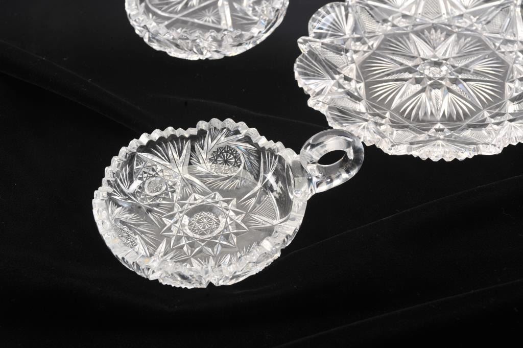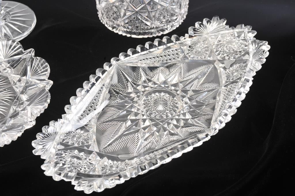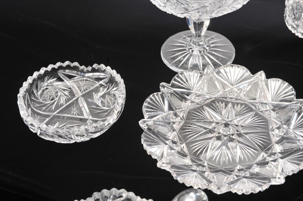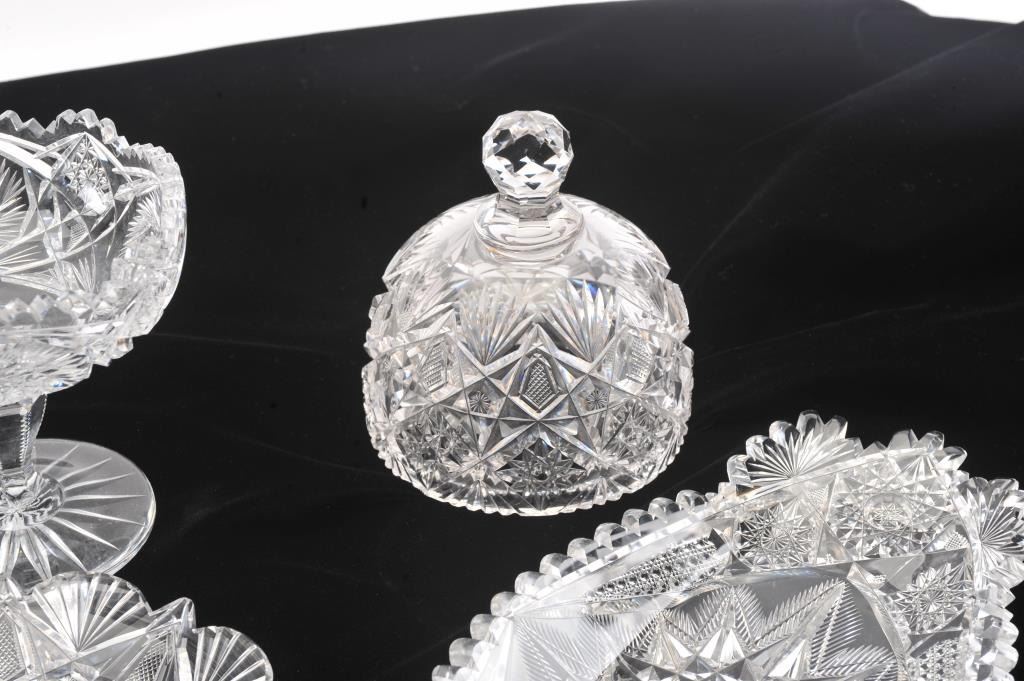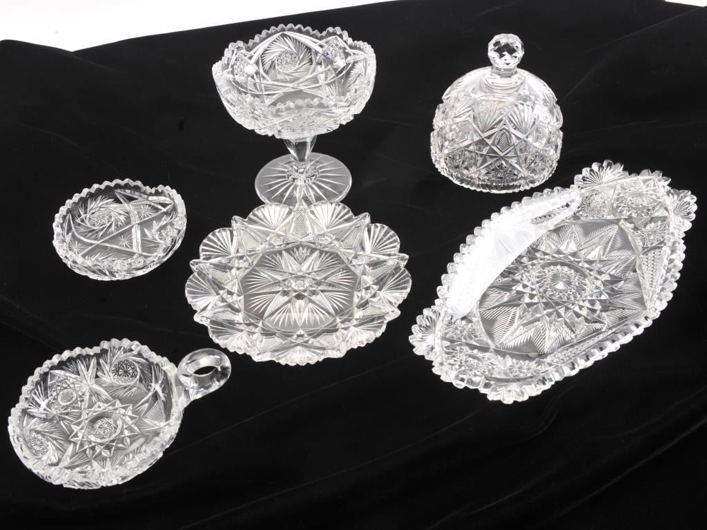 Lot of 6 pieces of American brilliant cut lead crystal from the estate of Maj. John Cable who was a WWII Officer and was gifted these pieces by his mother in the 1940s and were her mothers. Covered butter dish isoutstanding. All in very good condition. 1 noticeable chip on compote. Others seem pristine. Est.: $175-$350++