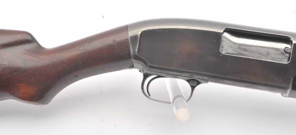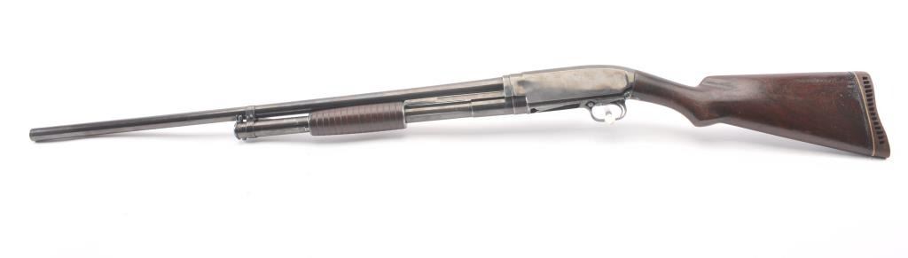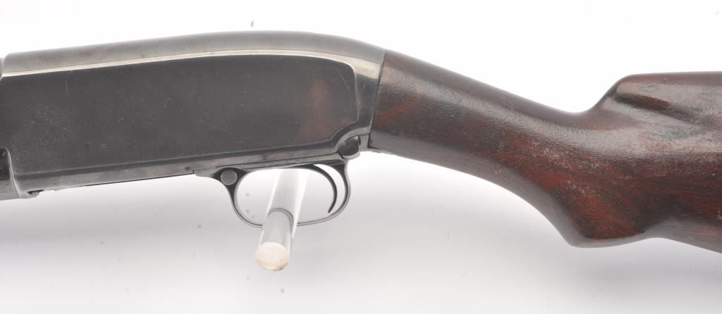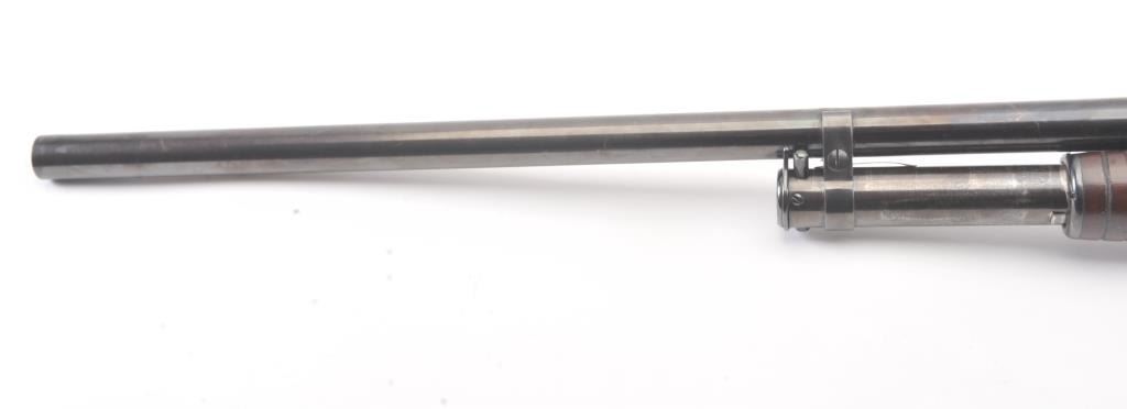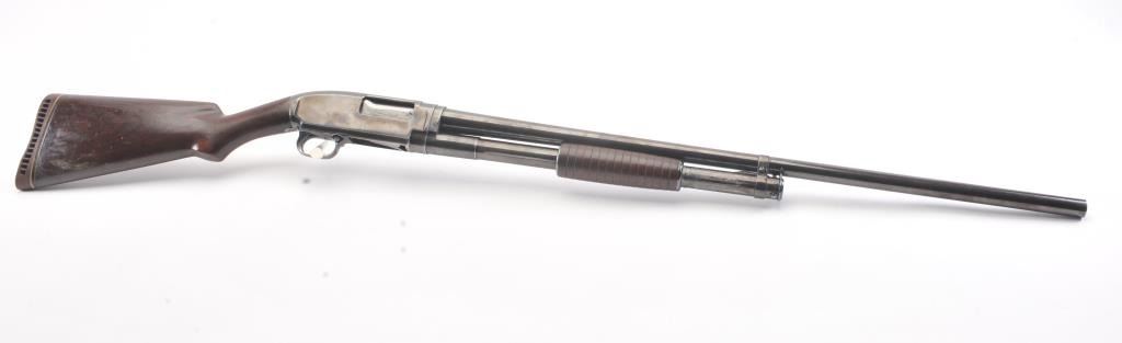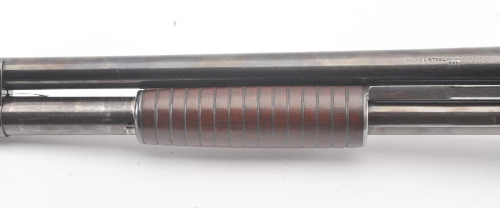 Winchester Model 1912 Pump Action shotgun in 12 GA with early nickel steel with 30" full choked barrel, S/N 77592. Shows 70%-80% old professional or factory quality re-blued finish that is drifting at the high pointsand edges with good markings and patent dates on the right rear of the barrel. The wood shows reapplication of later shellac or varnish but generally good. Rubber pad added. Measures 14 1/4" to the end of the pad. Theaction is good and the bore is bright. A classic that most likely outlined 3-4 owners over its 100 year life! (C&R) Est.: $175-$350