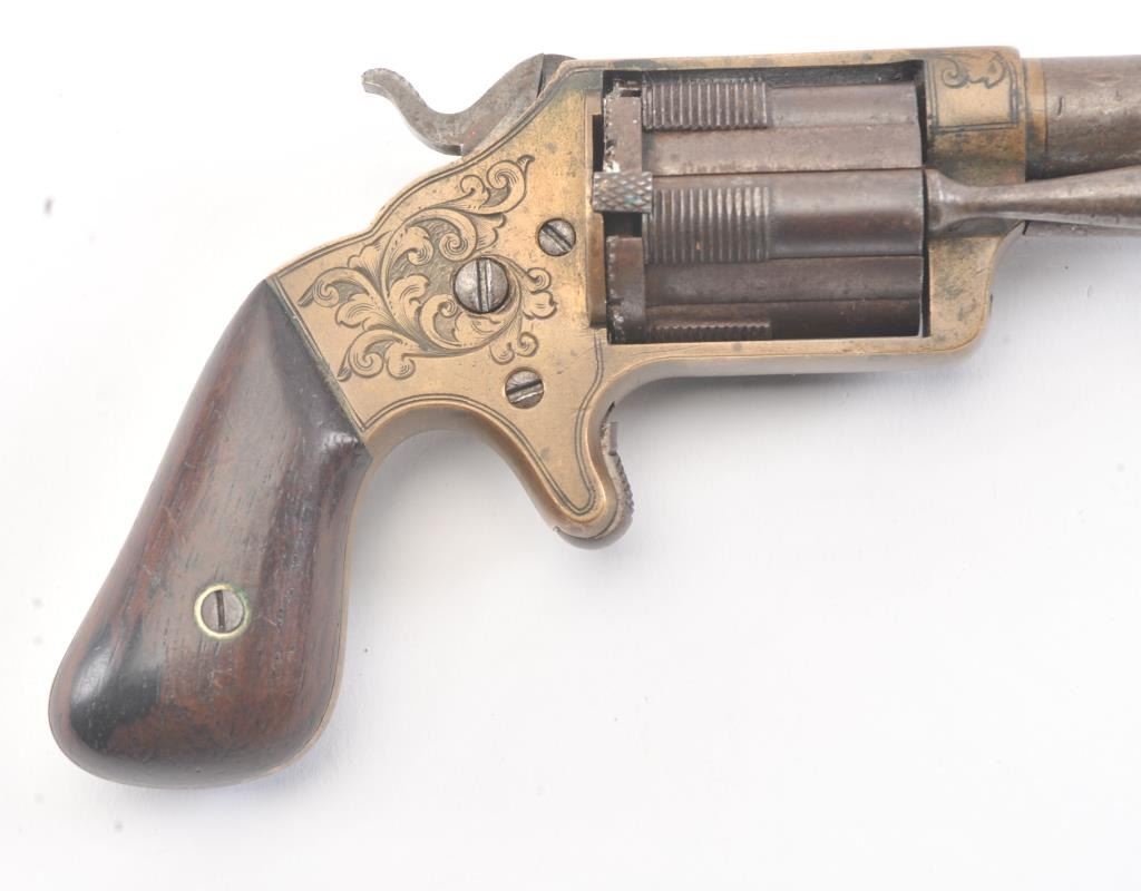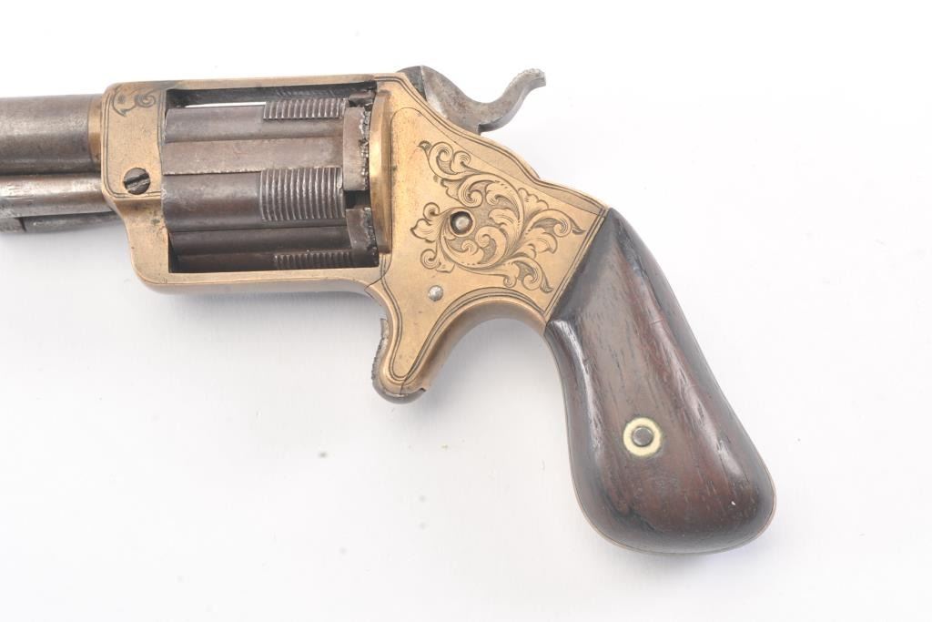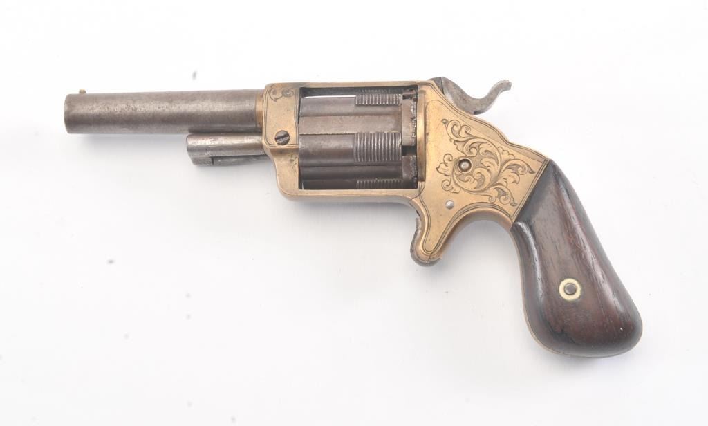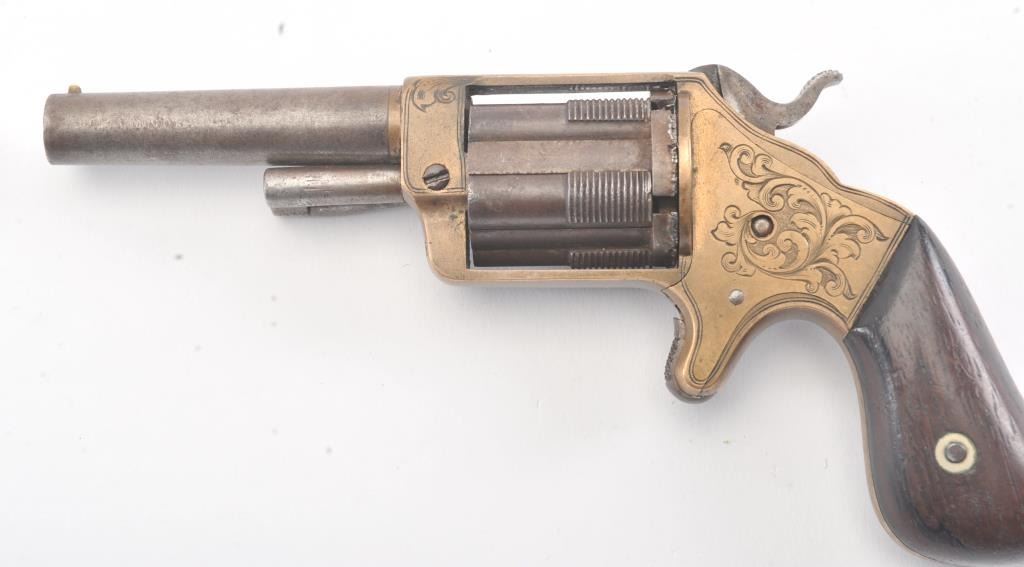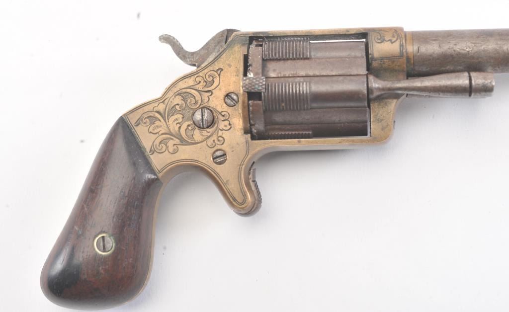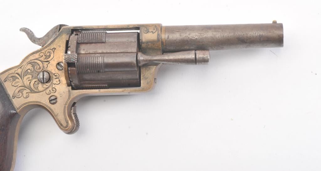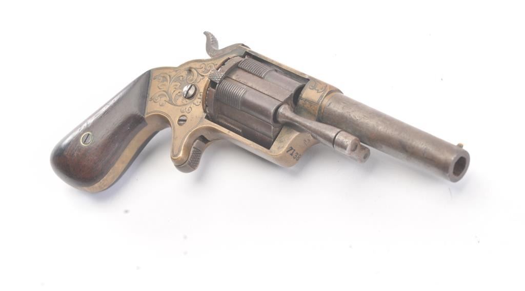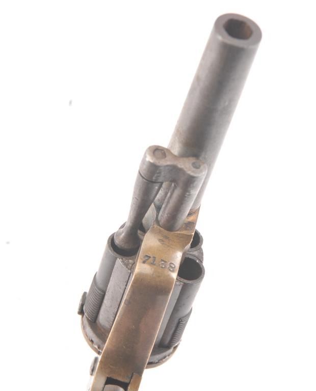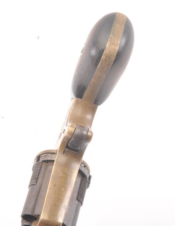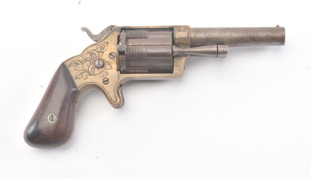 Slocum “Sliding sleeve” Civil War era teat fire revolver by Brooklyn Arms Co., S/N 7138. Uncleaned patina finish with nicely engraved brass frame. The action needs repair. The grips are good. (Antique) Est.: $300-$600
