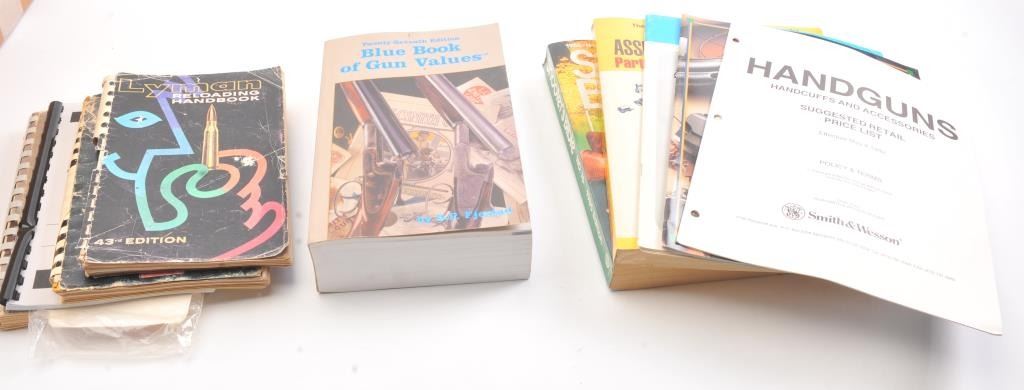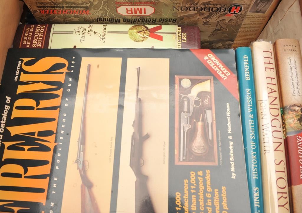 Large book lot consisting of firearms and reloading books and manuals, including The History of Smith & Wesson by Roy Jinks, several Firearms Assembly and Disassembly guides, numerous hand loading data books byLyman, Hornady and others. 2 full boxes. Est. $100-200