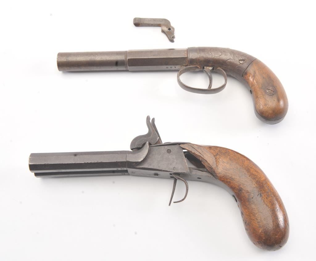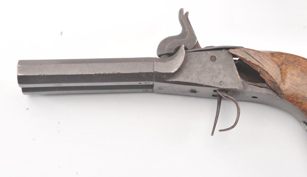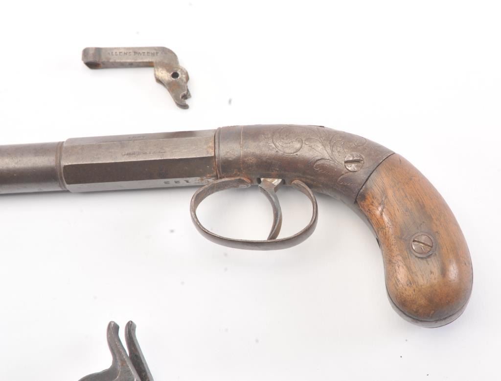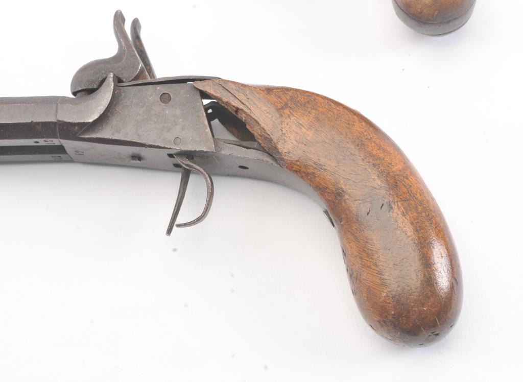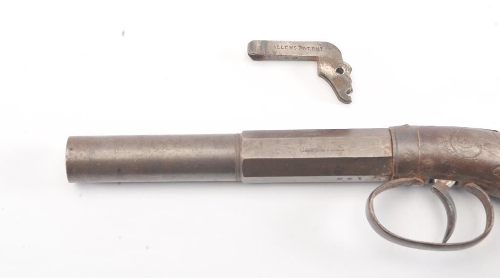 Patented 1837 marked bar hammer single shot pistol marked “Cast steel” and numbered 122. Good metal condition and grips. Allens patent on the hammer which is detached and needs repair. .36 caliber with a 5” barrel. Alongwith a double barrel percussion European “Snake Eyes” pistol circa Civil War era. Missing guard. Large chip on grips. Needs repairs and restorations. Both as is. (Antique) Est.: $150-$300
