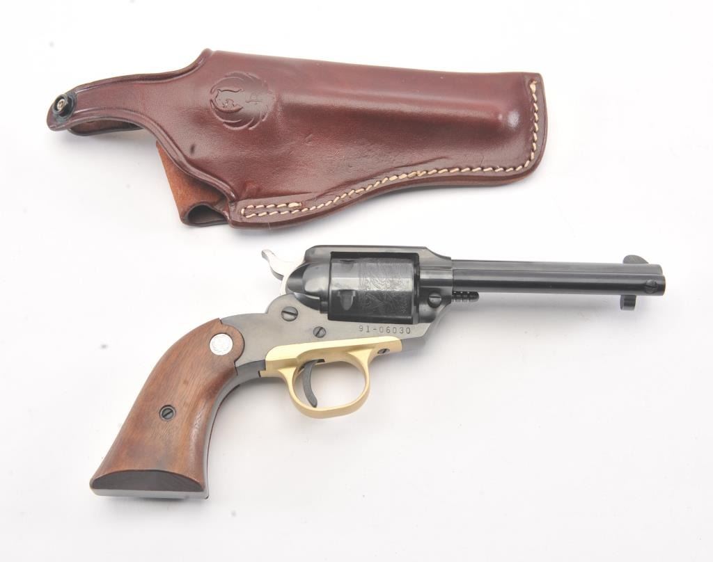 Ruger single Shot Bearcat revolver in .22 caliber with brass trigger guard and rolled cylinder scene, S/N 91-06030. Fine to excellent condition showing minor operation and handling. 98%-99%. With a Ruger leatherholster in plastic. (Modern/No PPT) Est.: $300-$600