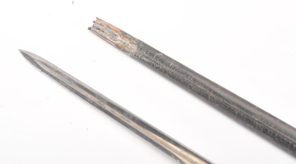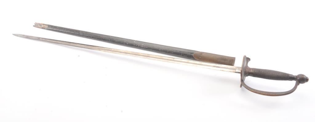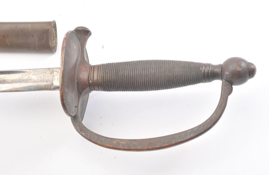 1860 N.C.O. sword by Ames dated 1864 with U.S. marking and “C.S.L.” inspection. The blade is in near fine condition sowing most bright polish and pristine markings. Pleasing patina on the hilt and throat. The scabbardis missing its tip and shows damage at the bottom end. Very hard to improve on this blade. Est.: $250-$500