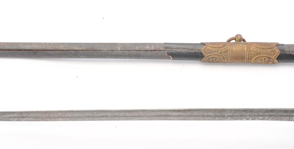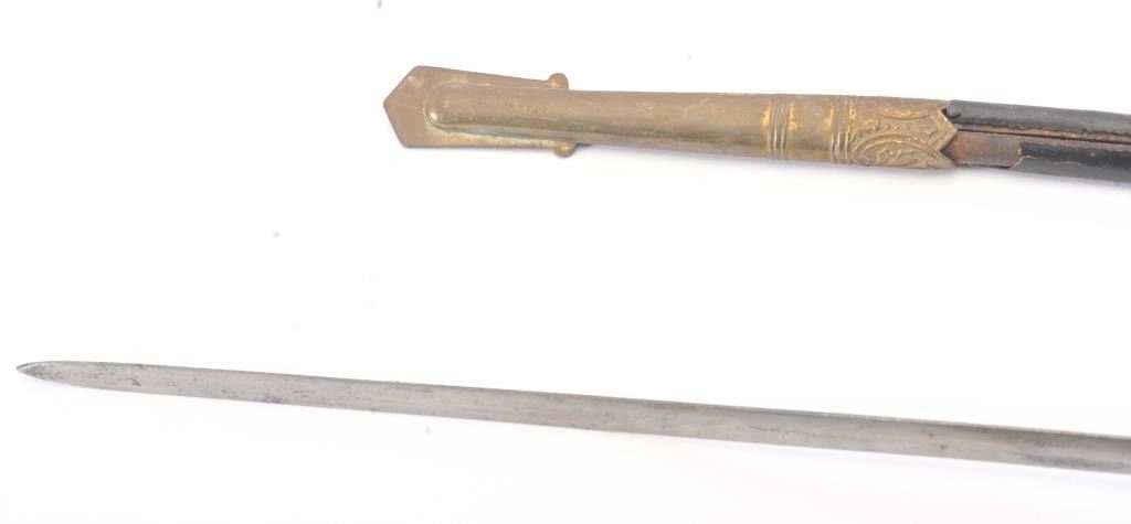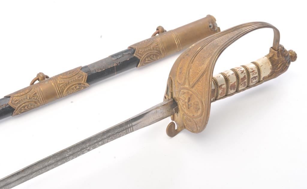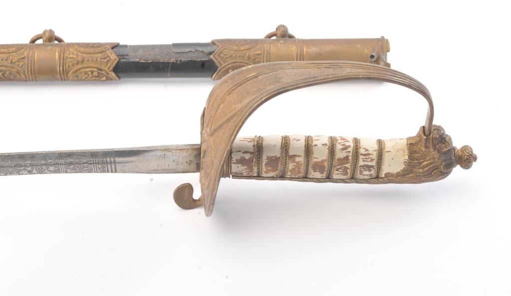 German or Austrian style Navy sword with lion head pommel circa 1900 to WWI era. No identifiable initials on cyphers on etched blade. The scabbard shows losses of most of the leather over metal covering. The grip has worn through the faux painted white grip to resemble ivory otherwise good to very good with crisp etched blade and toned gilt on the hilt. Est.: $175-$350