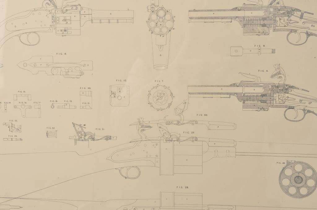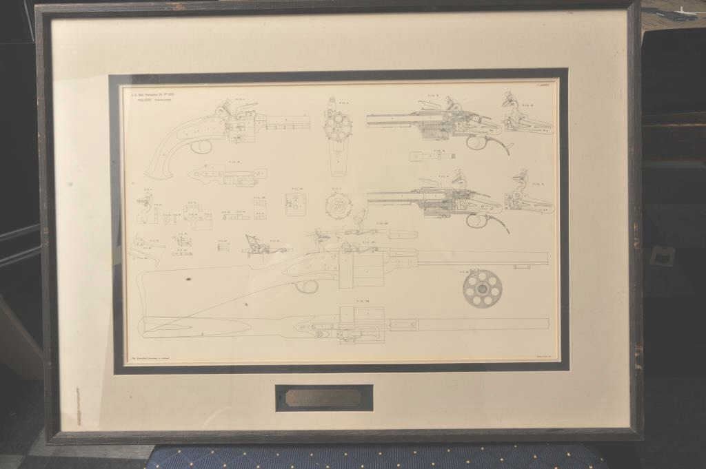 Framed and matted specification for the Collyer’s revolving flintlock pistol and rifle; approximately 21” x 28” overall and with printed notation in upper left hand corner of document “A.D. 1818. November 24.No. 4315”; “(1 sheet)” in upper right hand corner; “The Enrolled Drawing is colored” in lower left corner and “Malby & Sons Lith” in lower right corner; very good condition overall. Est.: $250-$350.