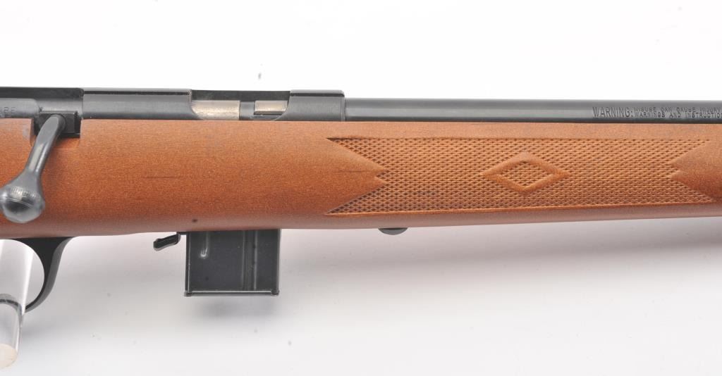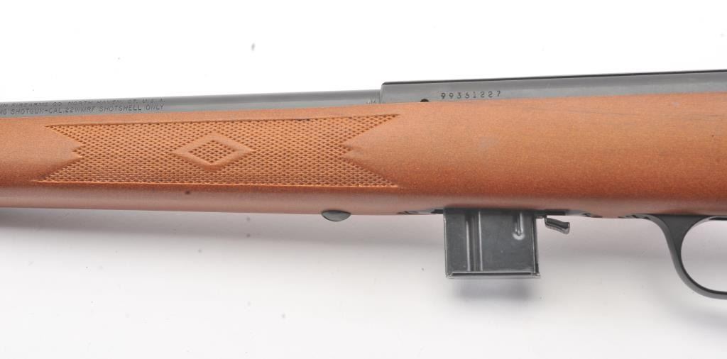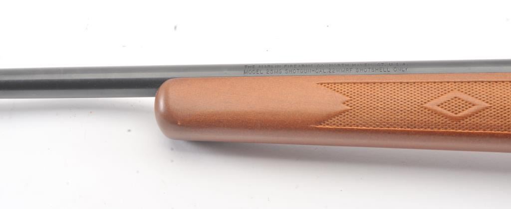 Marlin 25MG .22 Mag Shot Shell only bolt action, S/N 99361227 with 22” smoothbore. In fine to excellent used condition. Minor handling and use. 97%-99% overall. A few light storage marks. Scarce and well regarded for small game and snakes. (Modern) Est.: $175-$350