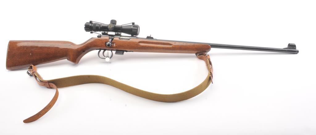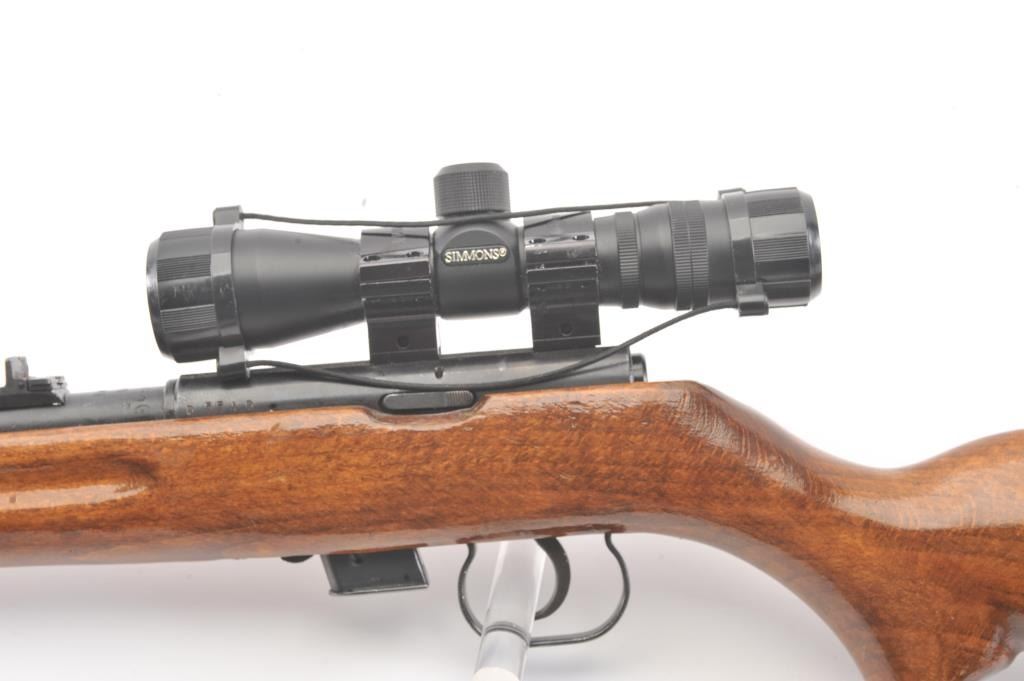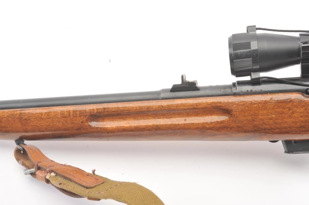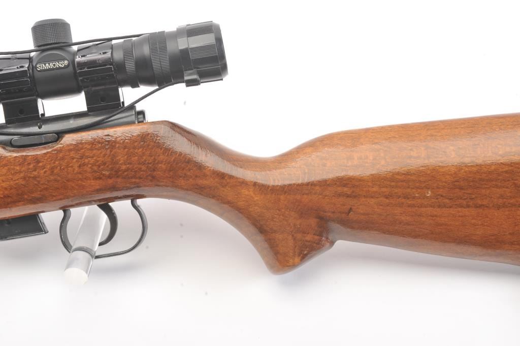 Romanian M-1969 training rifle, #D5540, .22 LR cal., 23 1/4" barrel, blued finish, open sights, smooth walnut stock with lanyard loops, canvas sling and Simmons .22 Mag 4x28 scope. Rifle is in near fine condition,retaining approximately 95% original finish, bright bore and crisp action. 3 mags included. (Modern/PPT) Est. $175-350