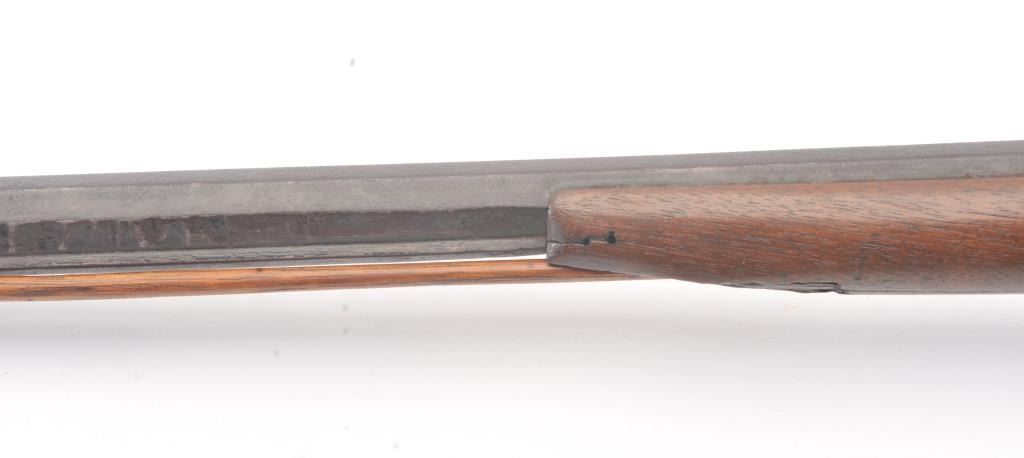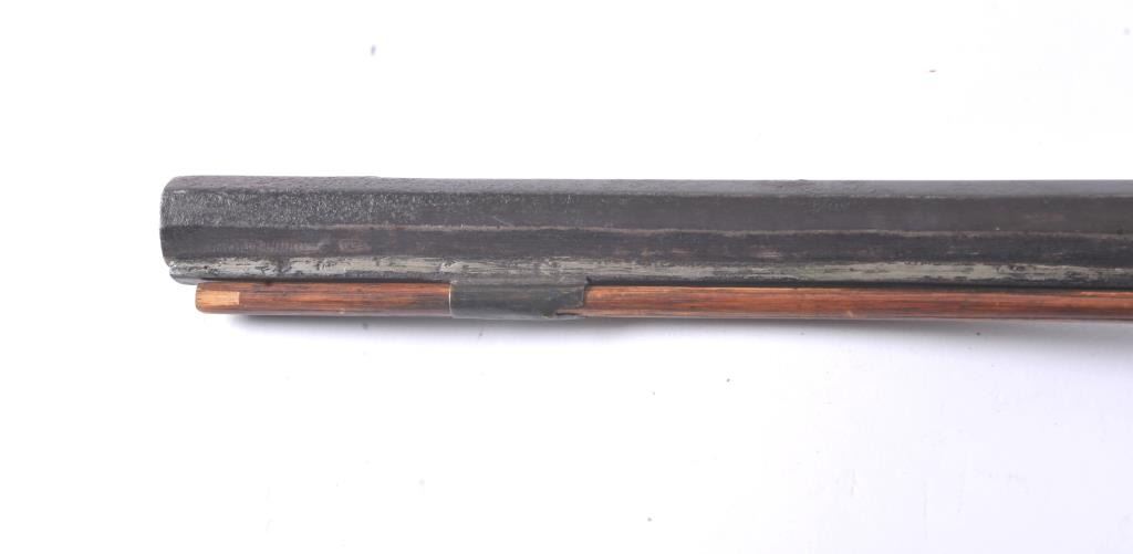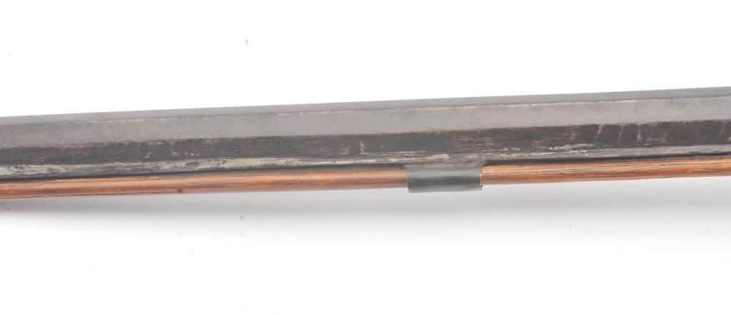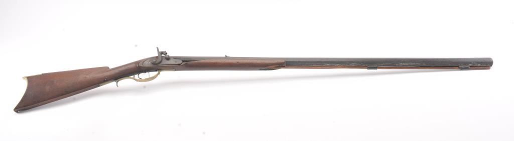 Half stocked American Plain Rifle on Indian trade or treaty style in .40-.42 caliber percussion with 40” octagon barrel, brass mounts, and lock marked with “H” crossed by an arrow at the center of the lock. Darkbrown patina with light to moderate rust and erosion. Some minor pitting. The lock is working and the trigger’s set. The stock shows breaks and losses at the front of the fore end and in front of the lock with largepieces of wood missing. Several screws replaced. Period handmade rod of the same era with original sights retained. Small brass tear drop escutcheon missing around single lock screw. Just the type that was traded and went west in the 1840s-50s era and California gold rush. Badly soldered and added rib beneath the barrel. (Antique) Est.: $175-$350