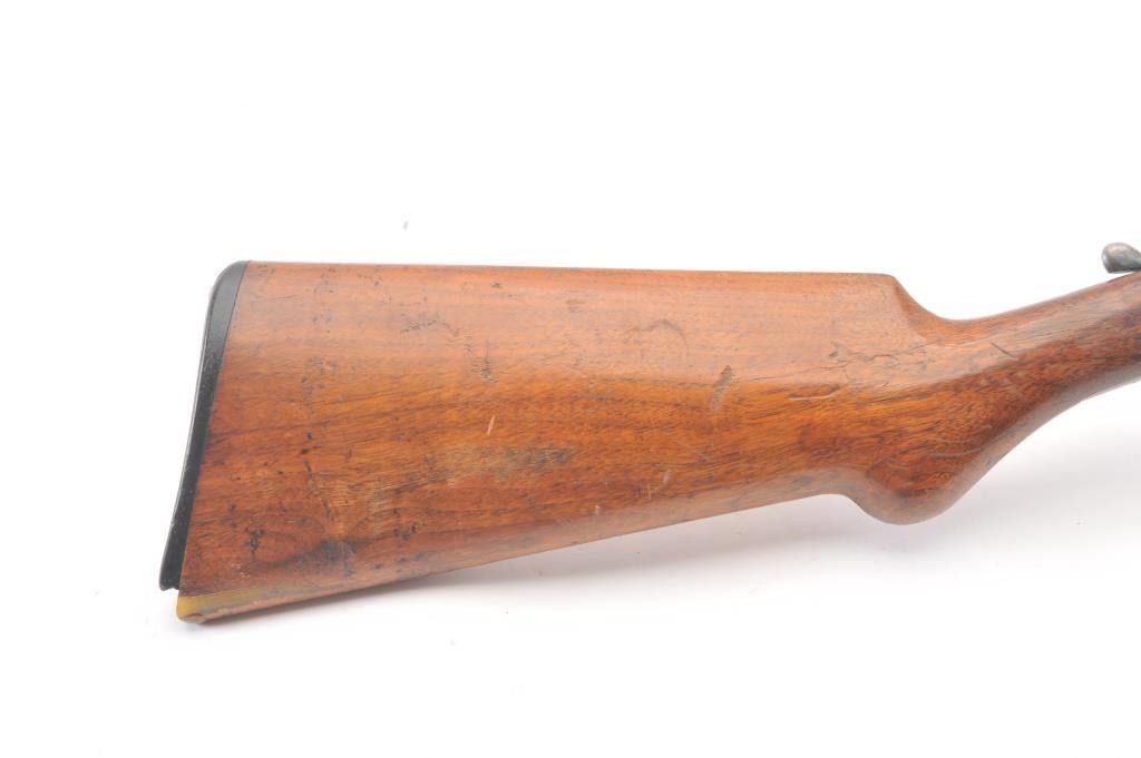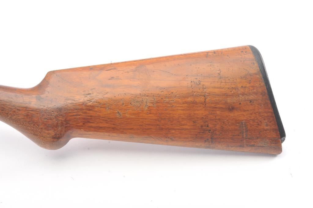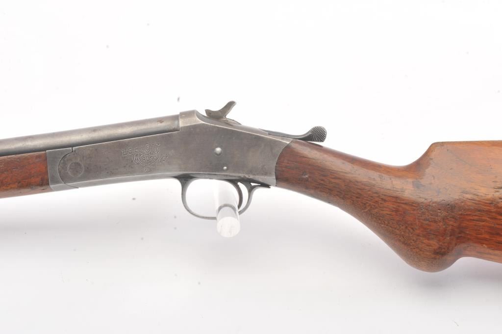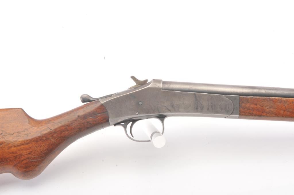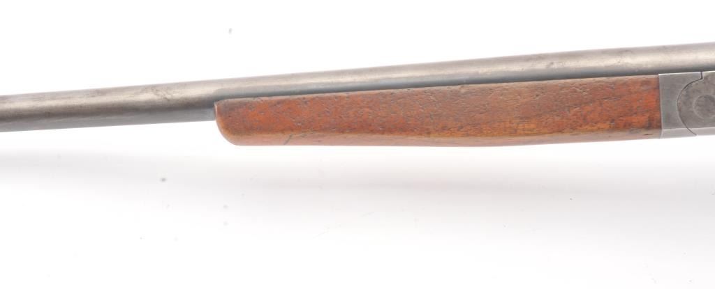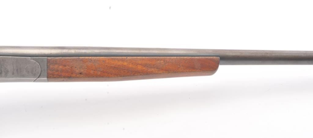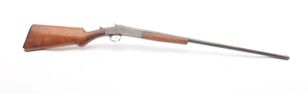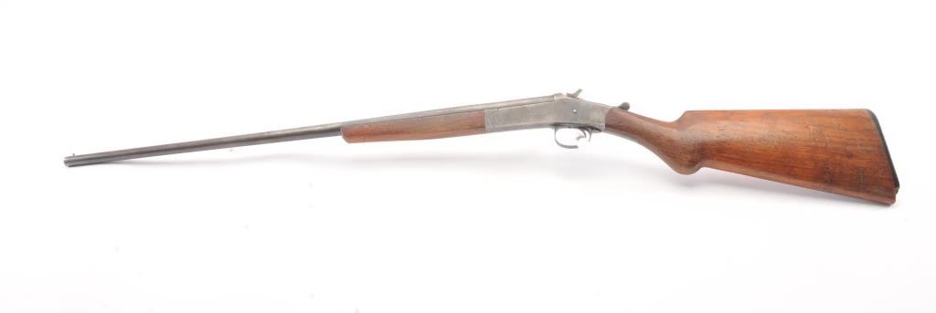 Hibbard, Spencer, Bartlett and Co. Chicago (Big ally to Colt and distributor of firearms) 410-44 shot marked single shot hammer shotgun circa about 1900-1915. The barrel measures 26” choked about cylinder.S/N 11704. Smooth patina with traces of blue and case colors. Good marking. Good action and bore. The wood shows little marks and scratches mostly in the finish and not deep. The butt plate is chipped and missing toe ofplate. (C&R) Est.: $150-$300