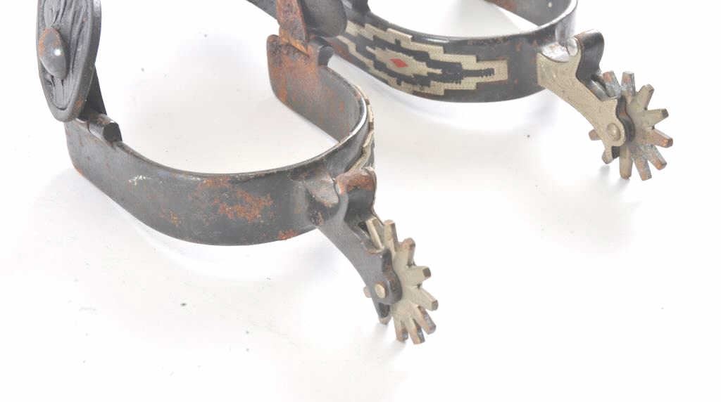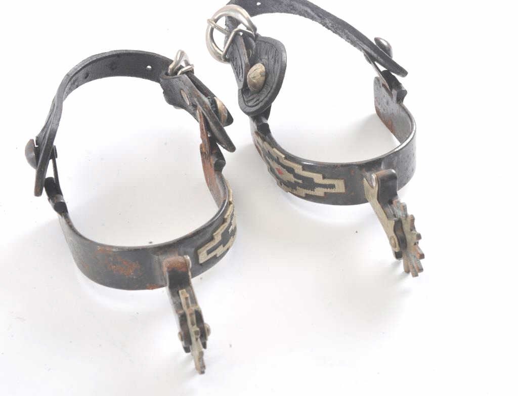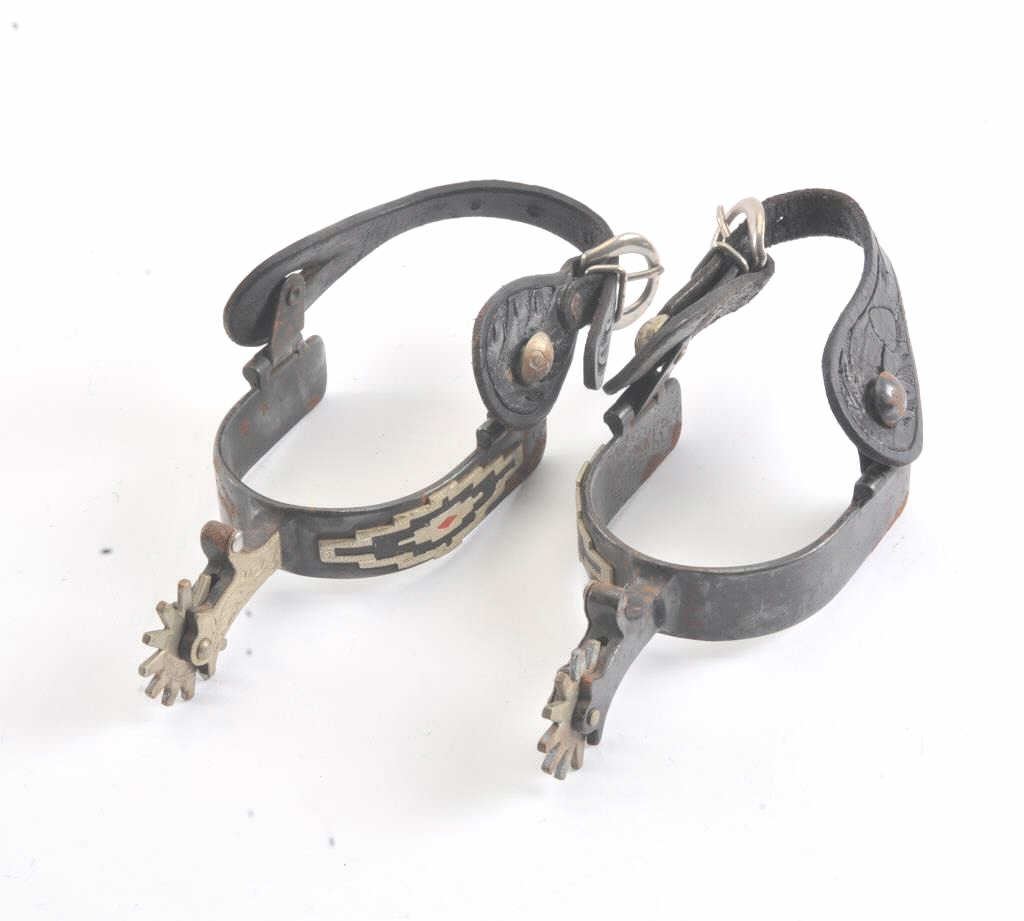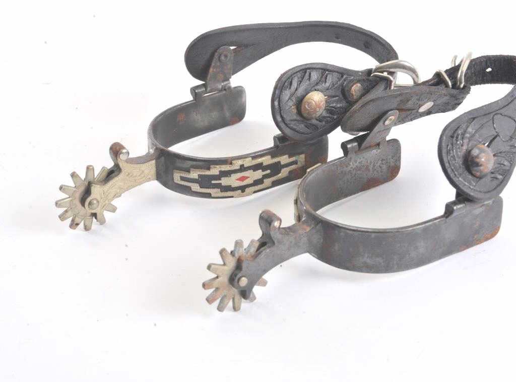 Pair of silver mounted spurs marked “Colorado” with tooled leather straps and buckles, ca. 1950’s; some scattered areas of rust; would benefit from a careful cleaning. Est.: $60-$120.