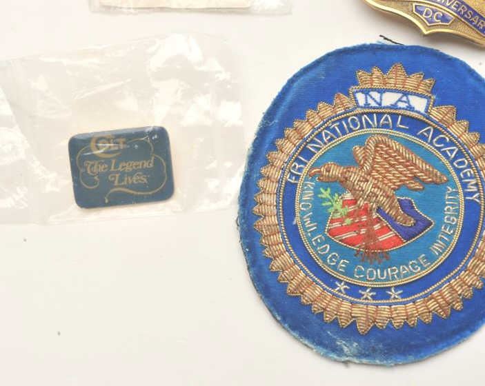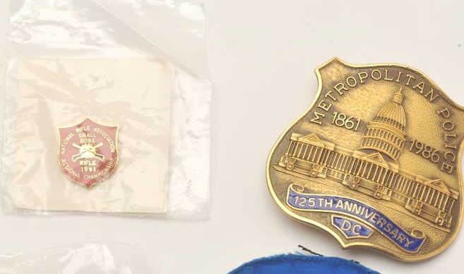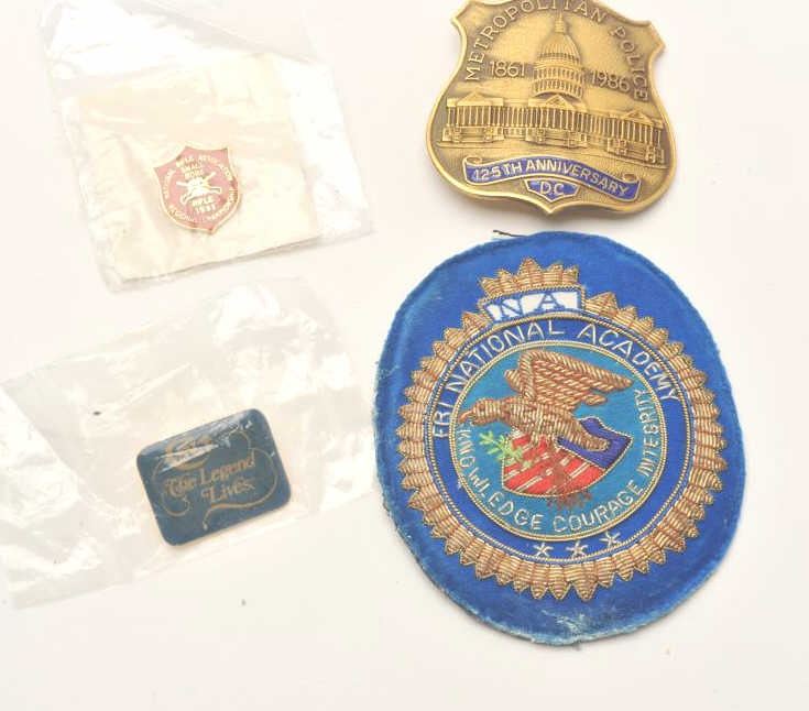 Lot consisting of a D.C. Metropolitan Police 125th Anniversary badge (numbered 3210 on the reverse and hallmarked “Blackinton”), an FBI National Academy patch and two firearm-related pins. Est.: $75-150