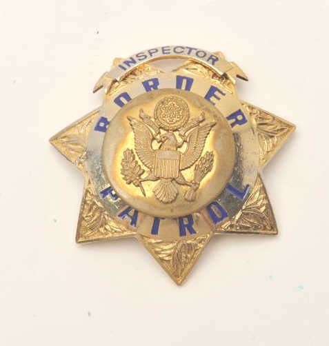 7 point Border Patrol Inspector badge (reverse side retainer for center U.S. eagle is stamped “KREW/G-I”). Est.: $100-200