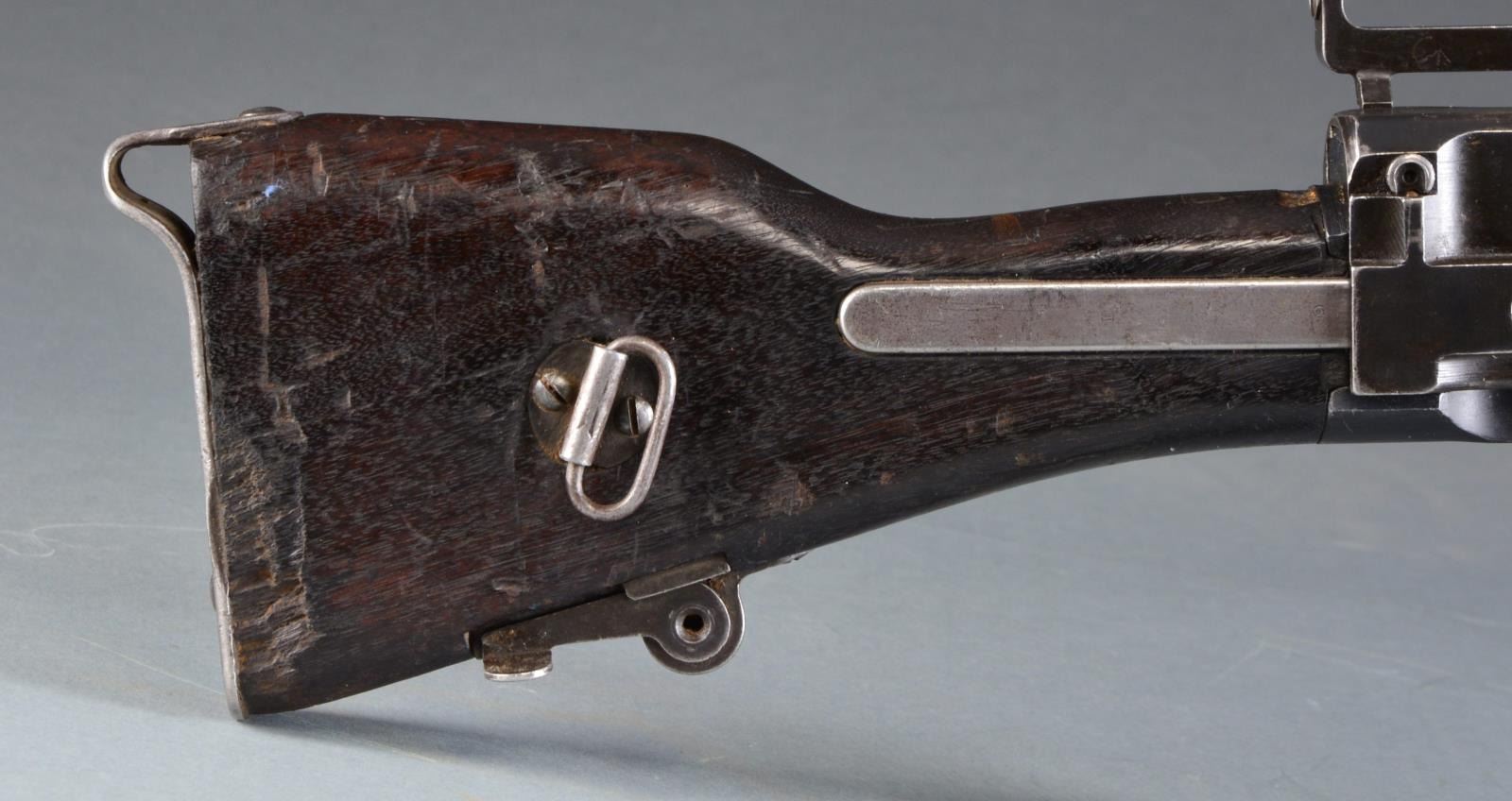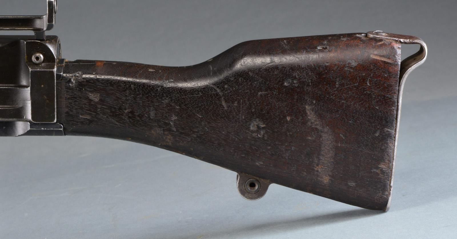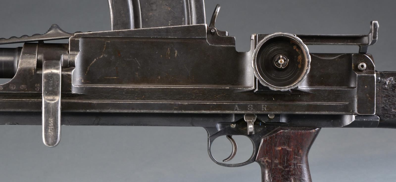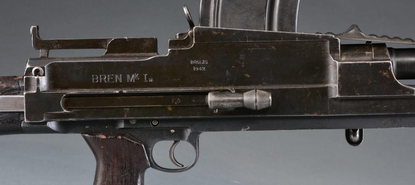 Cal. 303 British. S# 2T3225. Bbl. 25". Finish appears to be original. Marked on right side receiver "BREN Mk I M" & "INLIS 1942". Receiver is marked on left side w/ broad arrow & British proof marks & again w/ "42" date. Bbl. marked "CB2" where gun feeds from mag. directly above receiver, sights are offset several degrees to the left. Front sight protected blade, rear peep sight adj. in elevation from 200-2,000m. Left side selector marked "A" full-auto, "S" safe & "R" semi. Bipod mounted below bbl. at termination point of gas system. Folding carry handle above gas system forward of receiver. Paperwork indicates model as MKII though the receiver markings show it is clearly an MKI. MAGS: 1-20 rd. CONDITION: external metal surfaces still enjoy complete coverage of original finish aside from scratches & thinning on high points. Rear sight adjustment knob has earned gentle patina which appears to have been brought under control long ago. Carry handle rotates effortlessly & wood free from major defect. Stock & pistol grip match in both color & condition w/ heavy gouging sporadically. Rear stock retains lock unit for use w/ option monopod & sling swivel on right side. Fire control mechanism appears to function correctly when cycled by hand & is extremely smooth. Bore is clean w/ strong rifling. PROVENANCE: Evergreen Aviation & Space Museum Collection. NATIONAL FIREARMS ACT MG REQUIRING BATF TRANSFER BEFORE TAKING POSSESSION. FULLY TRANSFERABLE. (03-1454/JZ). MODERN CLASS III. $25,000-29,000.