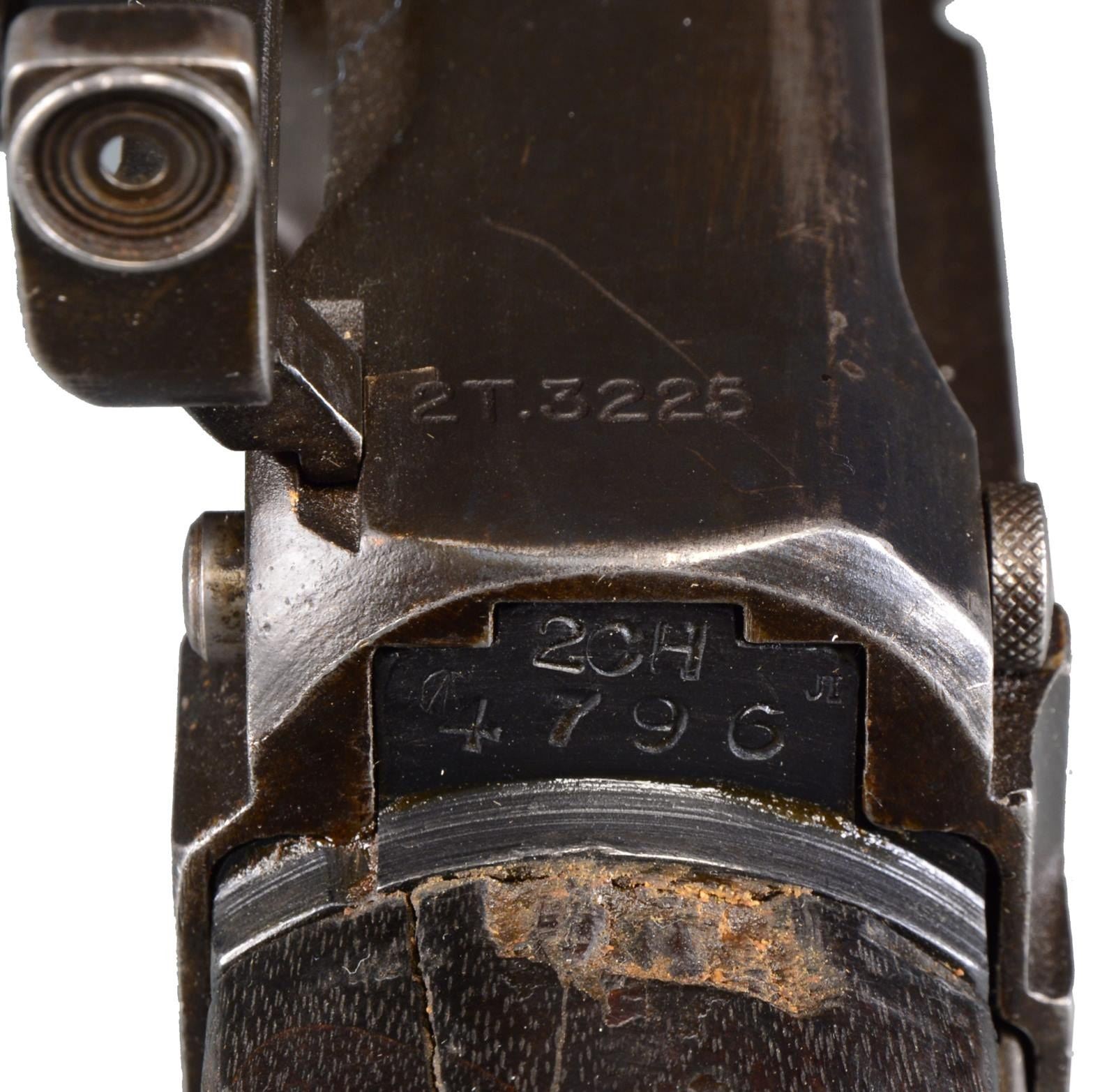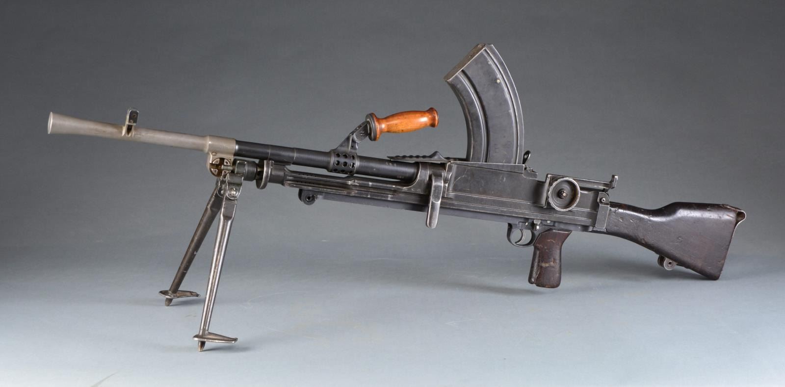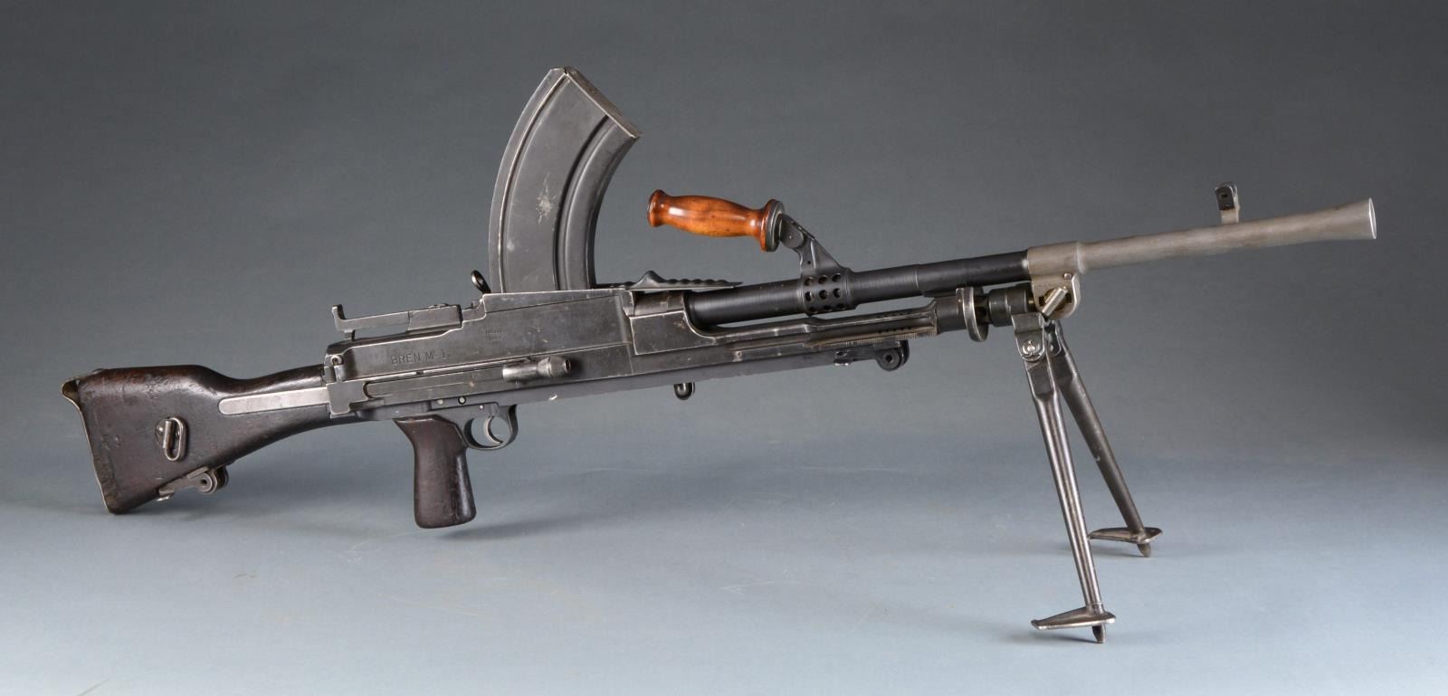 Cal. 303 British. S# 2T3225. Bbl. 25". Finish appears to be original. Marked on right side receiver "BREN Mk I M" & "INLIS 1942". Receiver is marked on left side w/ broad arrow & British proof marks & again w/ "42" date. Bbl. marked "CB2" where gun feeds from mag. directly above receiver, sights are offset several degrees to the left. Front sight protected blade, rear peep sight adj. in elevation from 200-2,000m. Left side selector marked "A" full-auto, "S" safe & "R" semi. Bipod mounted below bbl. at termination point of gas system. Folding carry handle above gas system forward of receiver. Paperwork indicates model as MKII though the receiver markings show it is clearly an MKI. MAGS: 1-20 rd. CONDITION: external metal surfaces still enjoy complete coverage of original finish aside from scratches & thinning on high points. Rear sight adjustment knob has earned gentle patina which appears to have been brought under control long ago. Carry handle rotates effortlessly & wood free from major defect. Stock & pistol grip match in both color & condition w/ heavy gouging sporadically. Rear stock retains lock unit for use w/ option monopod & sling swivel on right side. Fire control mechanism appears to function correctly when cycled by hand & is extremely smooth. Bore is clean w/ strong rifling. PROVENANCE: Evergreen Aviation & Space Museum Collection. NATIONAL FIREARMS ACT MG REQUIRING BATF TRANSFER BEFORE TAKING POSSESSION. FULLY TRANSFERABLE. (03-1454/JZ). MODERN CLASS III. $25,000-29,000.