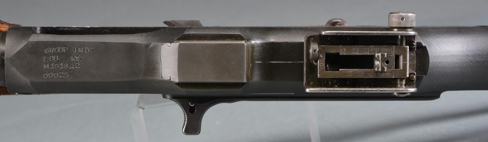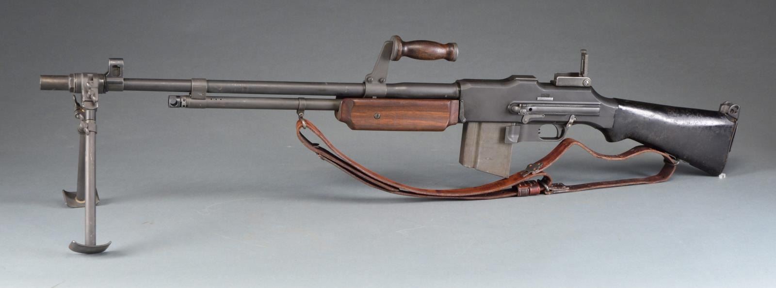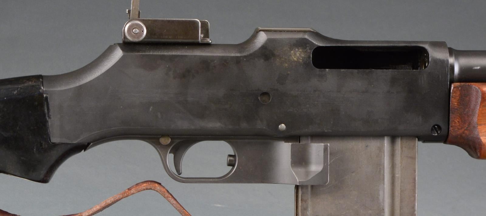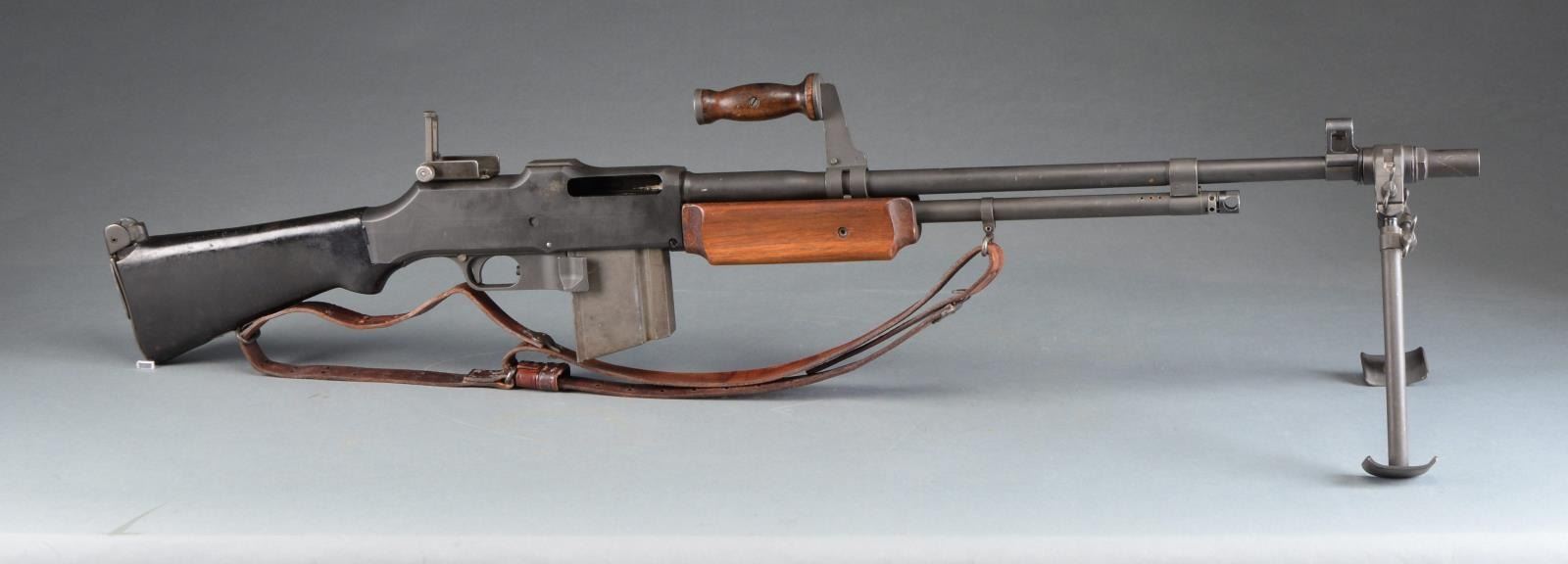 Cal. 3006. S# 00025. Bbl. 27". The BAR was designed by John Browning in 1917 to fulfill a role for an automatic rifle in WWI. Early variants were made by Colt, Winchester & Marlin Rockwell. Approximately 85,000 were built prior to the Armistice though there were several configurations, the 1918A2 wasn"t adopted until just prior to WWII. It utilized a bipod, a short hinged shoulder support & a shorter forend than those prior. Like others before it, it feeds from a 20 rd. staggered, detachable box mag. & is chambered in 3006. It is a gas operated open bolt mechanism & this particular example is select fire instead of full auto only w/ a fast & slow setting. Parkerized finish on exposed metal surfaces. Wooden forend & composite rear stock. Left side nonreciprocating charging handle. Carry handle that swivels 90 degrees to the right. Hooded post front sight, rear peep sight adj. in elevation from 100-1500 yards. Mag. release is opposite the trigger inside the trigger guard. Leather sling. MAGS: 1-20 rd. CONDITION: finish coverage is complete w/ only light handling marks; wooden forend has a few mild impressions but overall very good condition. Black composite rear stock shows hairline crack where it meets receiver on left side continuing rearward less than 2". Fire control mechanism appears to function correctly when cycled by hand. Dark bore w/ very strong rifling. NATIONAL FIREARMS ACT MG REQUIRING BATF TRANSFER BEFORE TAKING POSSESSION. FULLY TRANSFERABLE. (03-1458/JZ). MODERN. CLASS III. $15,000-20,000.