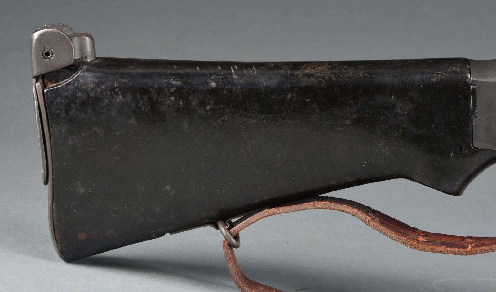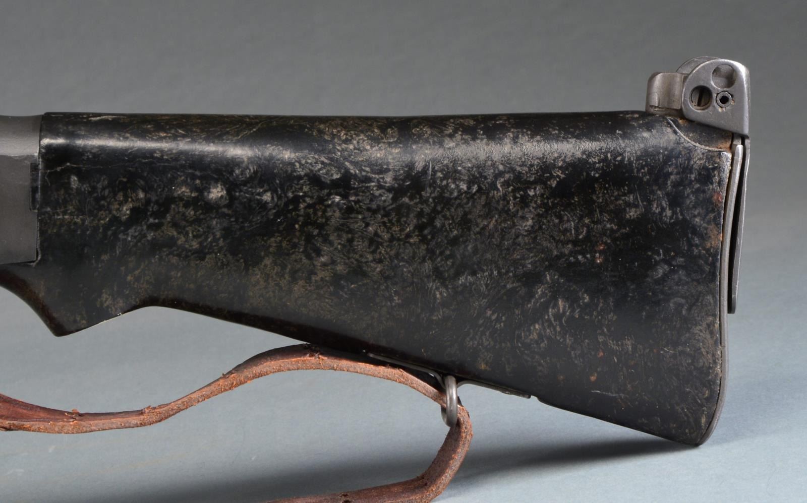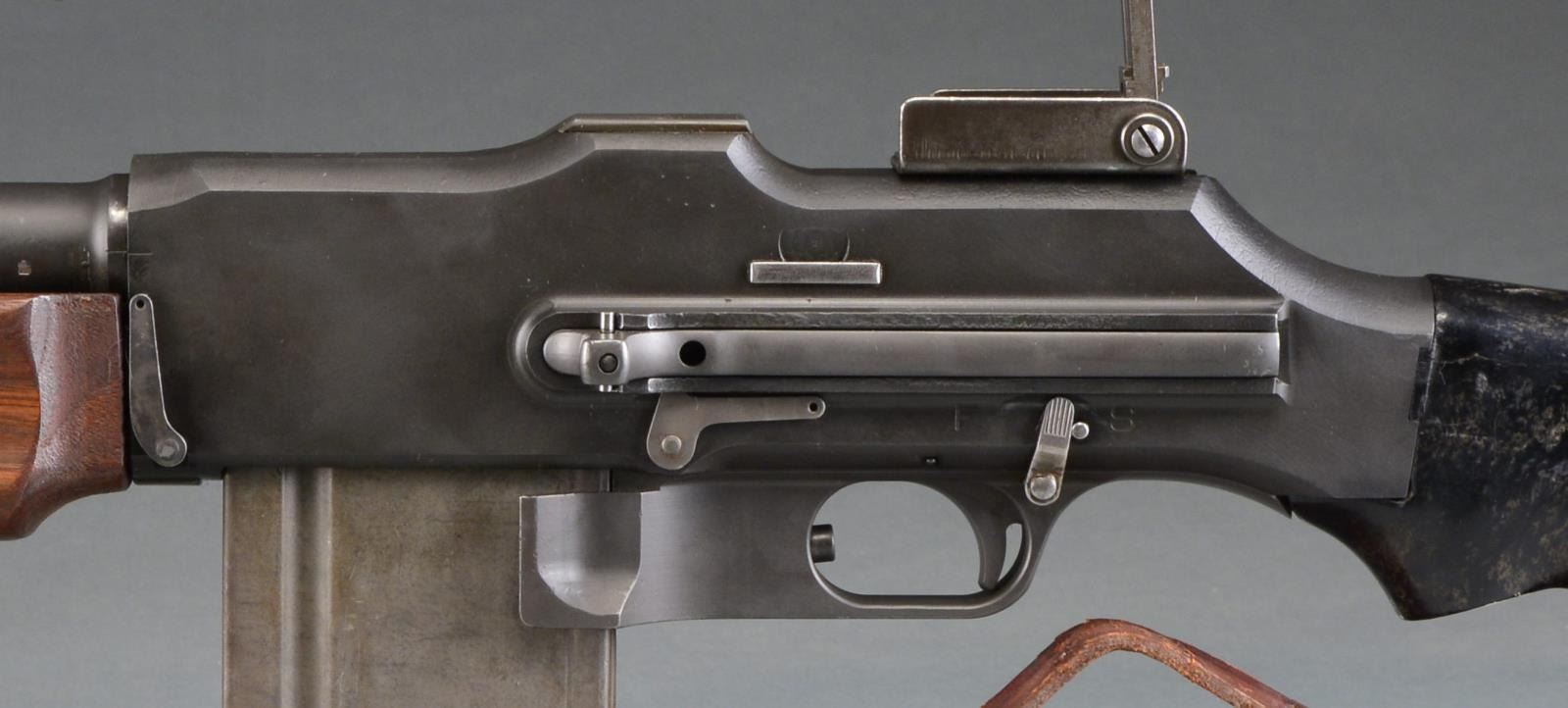 Cal. 3006. S# 00025. Bbl. 27". The BAR was designed by John Browning in 1917 to fulfill a role for an automatic rifle in WWI. Early variants were made by Colt, Winchester & Marlin Rockwell. Approximately 85,000 were built prior to the Armistice though there were several configurations, the 1918A2 wasn"t adopted until just prior to WWII. It utilized a bipod, a short hinged shoulder support & a shorter forend than those prior. Like others before it, it feeds from a 20 rd. staggered, detachable box mag. & is chambered in 3006. It is a gas operated open bolt mechanism & this particular example is select fire instead of full auto only w/ a fast & slow setting. Parkerized finish on exposed metal surfaces. Wooden forend & composite rear stock. Left side nonreciprocating charging handle. Carry handle that swivels 90 degrees to the right. Hooded post front sight, rear peep sight adj. in elevation from 100-1500 yards. Mag. release is opposite the trigger inside the trigger guard. Leather sling. MAGS: 1-20 rd. CONDITION: finish coverage is complete w/ only light handling marks; wooden forend has a few mild impressions but overall very good condition. Black composite rear stock shows hairline crack where it meets receiver on left side continuing rearward less than 2". Fire control mechanism appears to function correctly when cycled by hand. Dark bore w/ very strong rifling. NATIONAL FIREARMS ACT MG REQUIRING BATF TRANSFER BEFORE TAKING POSSESSION. FULLY TRANSFERABLE. (03-1458/JZ). MODERN. CLASS III. $15,000-20,000.