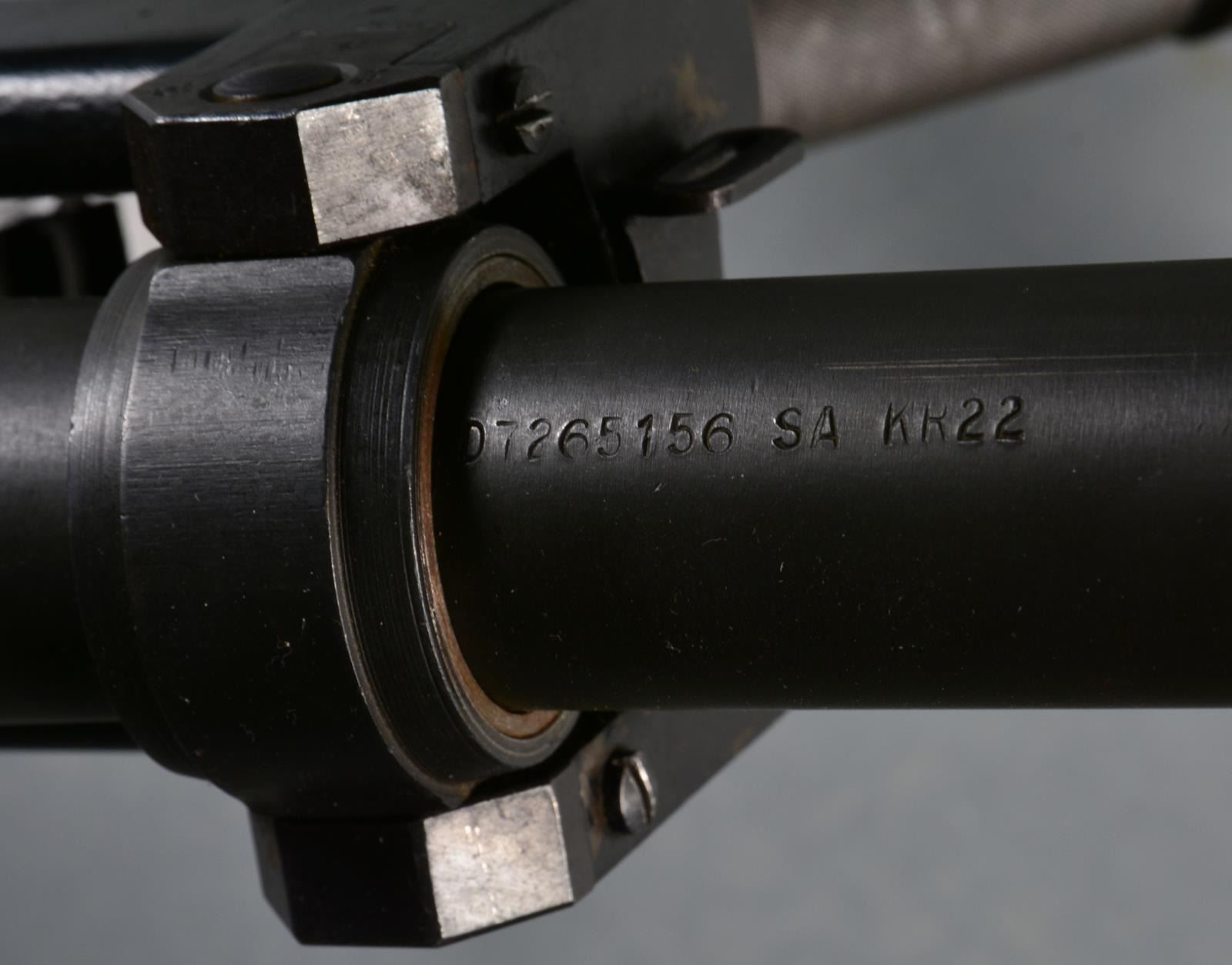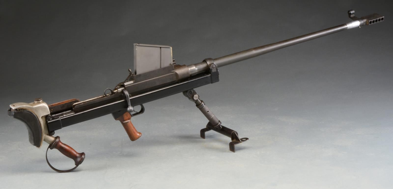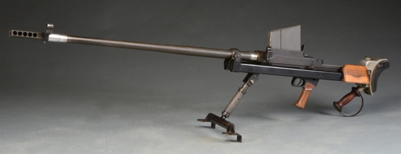 RIFLE. Cal. 50 BMG. S# 2T9305. Bbl. 36". The original .55" MKI antitank rifle was developed in 1930 in Britain w/ one of the lead designers being Capt. Boys. The original code name for this rifle was "Stanchion" & because Capt. Boys passed shortly after development had been wrapped up, it was given his name out of respect. It is a top mounted mag. fed bolt action rifle designed w/ a heavy muzzle brake & recoiling bbl. used in conjunction w/ a heavily padded buttplate in an attempt to tame the massive forces while firing. This particular example marked on the left side receiver "US GOVT PROPERTY / R. B. MKI / INGLIS 1948" has been rechambered in the popular, still powerful, US 50 BMG (12.7x99). Due to the center placement of the mag., the sights are extended far to the left side of the receiver & a wooden cheekpiece has been added to aid in aiming. While this example utilizes an aftermarket muzzle device measuring 3.5x2x0.75, attached via an unknown left handed thread, it still retains the factory adj. heavy-duty bipod & rear pistol grip for added control. Bipod is micro adj. by turning w/ the support hand so the control hand never has to leave the action. Front sight is a hooded post w/ a rear peep sight. Overall length is 64". Shoulder piece still retains original oil brush. MAGS: 1-5 rd. metal. CONDITION: most exposed metal surfaces enjoy a combination of bluing & or parkerizing; bbl., chamber & muzzle area both unfinished, receiver covered w/ a light patina that appears to have been brought under control long ago, shoulder pad remains firmly in place w/ leather torn at top, having succumb to dry rot, exposing the pad, bipod functions effortlessly, bore is bright w/ extremely strong rifling, fire control mechanism appears to function correctly when cycled by hand. (20-913/JZ). CURIO. $5,000-7,000.