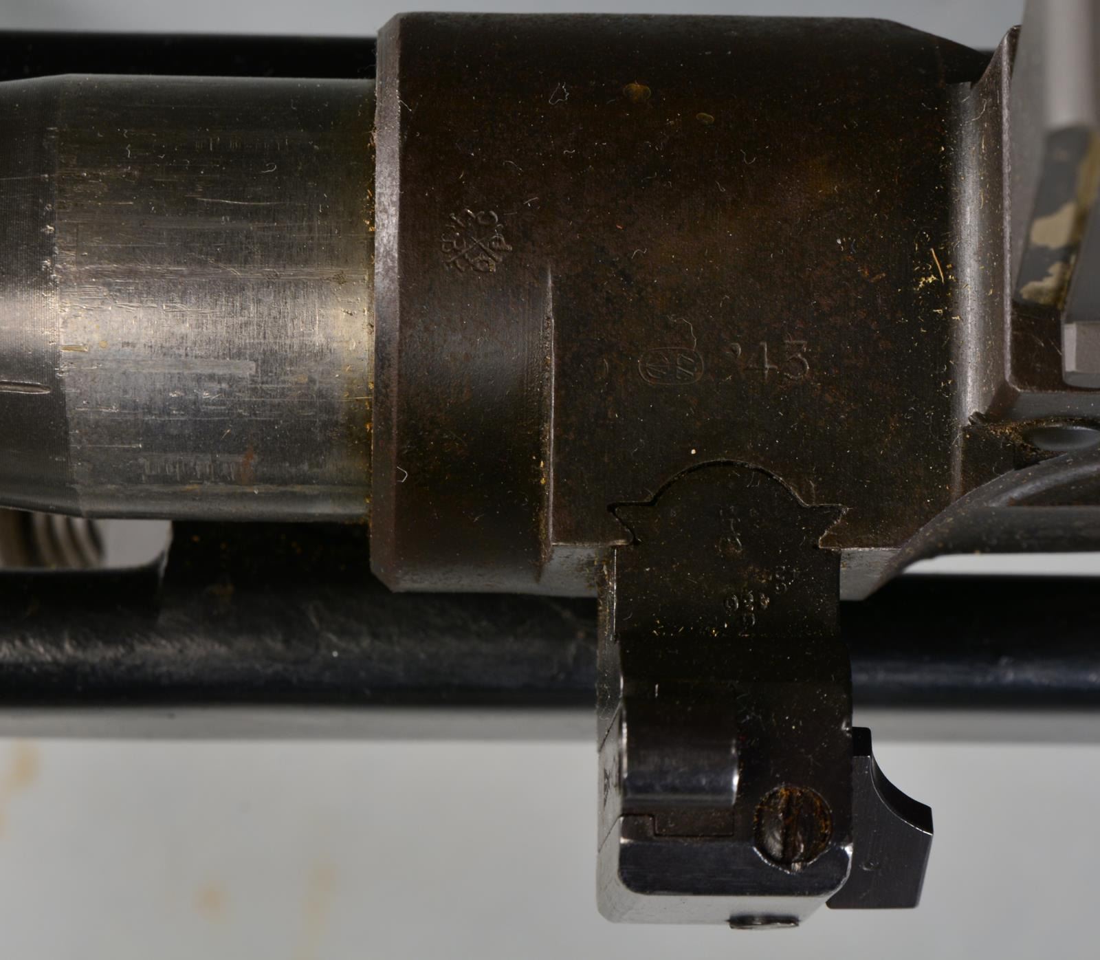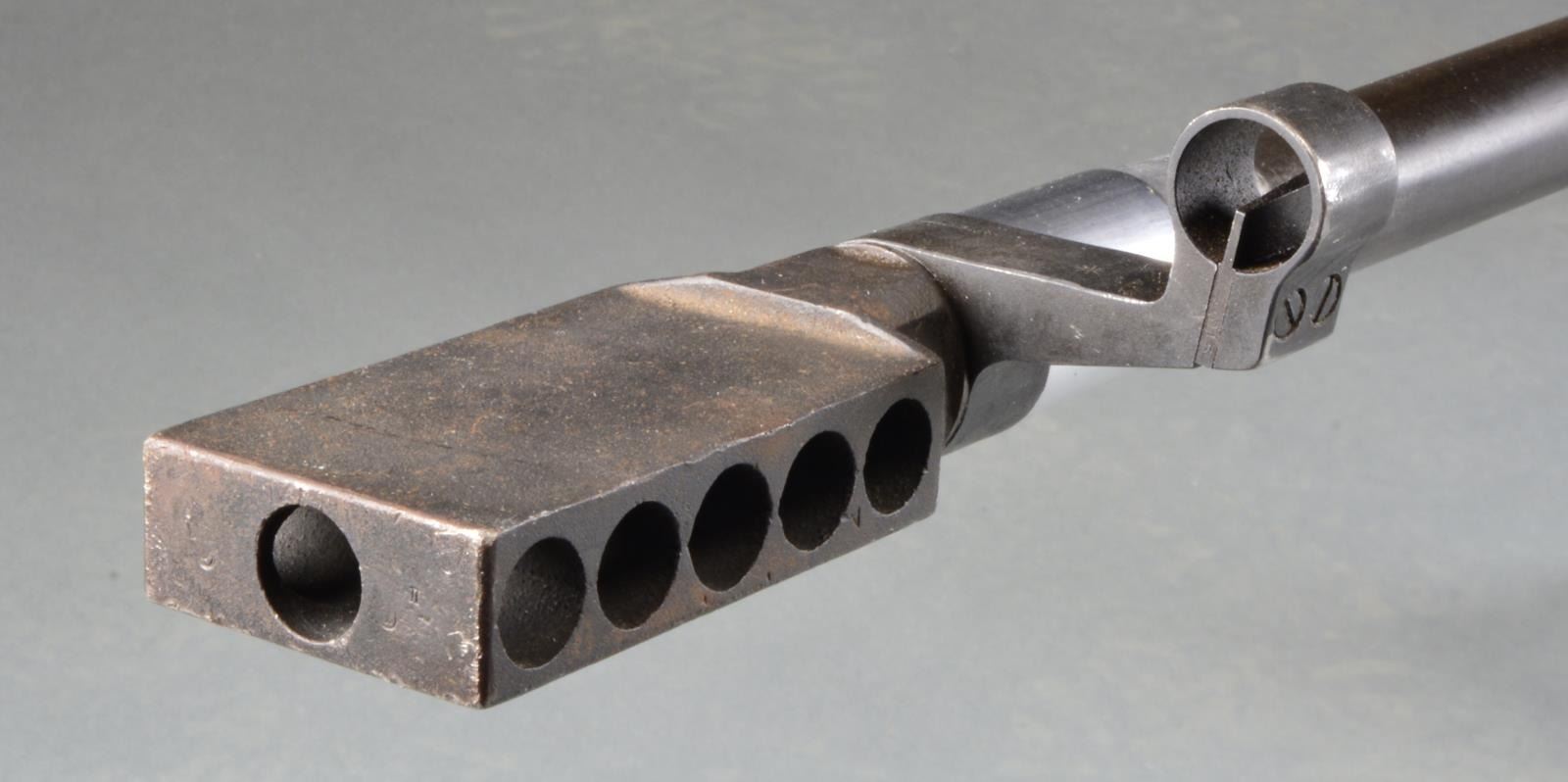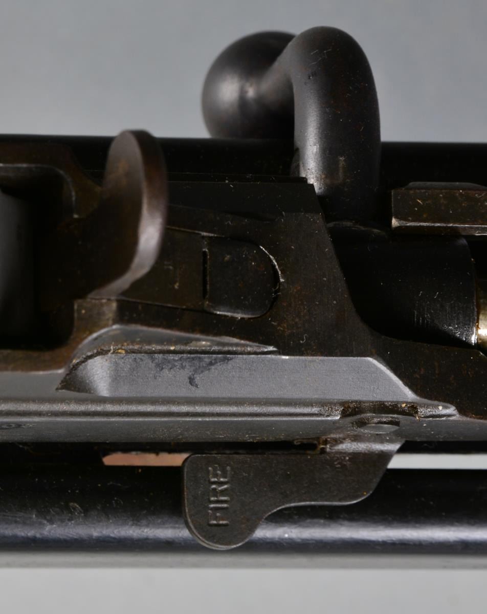 RIFLE. Cal. 50 BMG. S# 2T9305. Bbl. 36". The original .55" MKI antitank rifle was developed in 1930 in Britain w/ one of the lead designers being Capt. Boys. The original code name for this rifle was "Stanchion" & because Capt. Boys passed shortly after development had been wrapped up, it was given his name out of respect. It is a top mounted mag. fed bolt action rifle designed w/ a heavy muzzle brake & recoiling bbl. used in conjunction w/ a heavily padded buttplate in an attempt to tame the massive forces while firing. This particular example marked on the left side receiver "US GOVT PROPERTY / R. B. MKI / INGLIS 1948" has been rechambered in the popular, still powerful, US 50 BMG (12.7x99). Due to the center placement of the mag., the sights are extended far to the left side of the receiver & a wooden cheekpiece has been added to aid in aiming. While this example utilizes an aftermarket muzzle device measuring 3.5x2x0.75, attached via an unknown left handed thread, it still retains the factory adj. heavy-duty bipod & rear pistol grip for added control. Bipod is micro adj. by turning w/ the support hand so the control hand never has to leave the action. Front sight is a hooded post w/ a rear peep sight. Overall length is 64". Shoulder piece still retains original oil brush. MAGS: 1-5 rd. metal. CONDITION: most exposed metal surfaces enjoy a combination of bluing & or parkerizing; bbl., chamber & muzzle area both unfinished, receiver covered w/ a light patina that appears to have been brought under control long ago, shoulder pad remains firmly in place w/ leather torn at top, having succumb to dry rot, exposing the pad, bipod functions effortlessly, bore is bright w/ extremely strong rifling, fire control mechanism appears to function correctly when cycled by hand. (20-913/JZ). CURIO. $5,000-7,000.