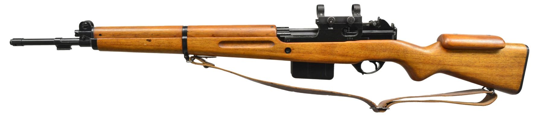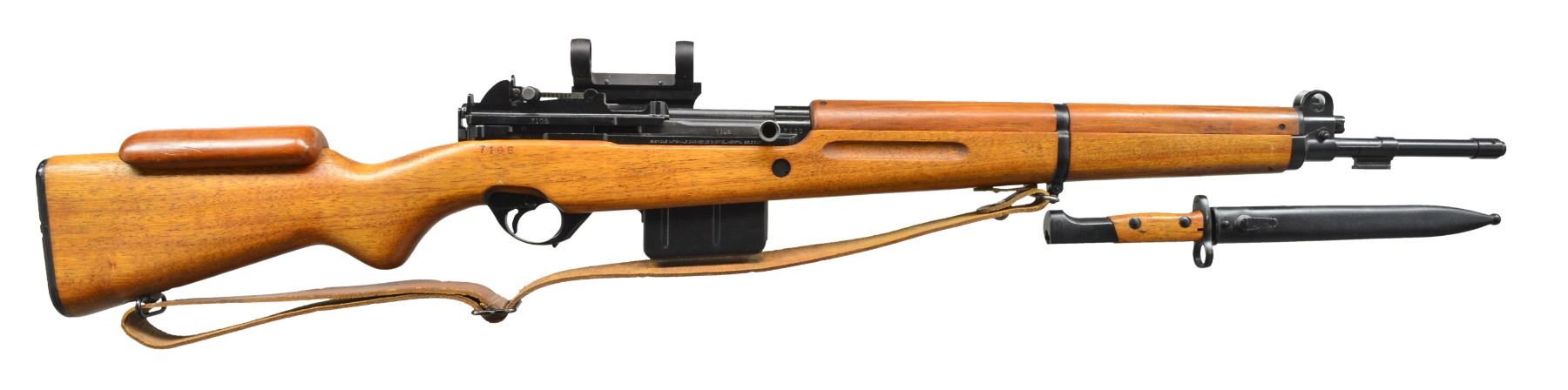 Cal. 30-06. S# 7106. Bbl. 23". Matching S# rifle w/ "AL" on top front of receiver indicating Luxembourg issue. Matching numbered stock w/ sling. Added higher comb for scope use. Receiver has scope mt. numbered "054" at bottom rear with flaming bomb "0" at bottom front. Top of base has an Echo adapter mt. for 7/8" diameter scope. Fixed 10 rd. mag. UNATTACHED ACCESSORIES: plus unmarked type1 bayonet w/ wooden grips. Metal sheath w/ metal hook. CONDITION: all aspects near excellent w/ sling being good to very good. PROVENANCE: Formerly on loan to the Evergreen Aviation & Space Museum. (20-887/NW). CURIO. $2,500-4,000.