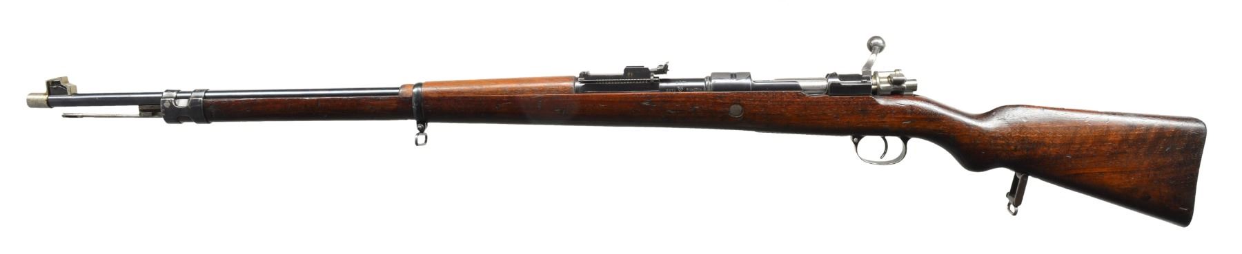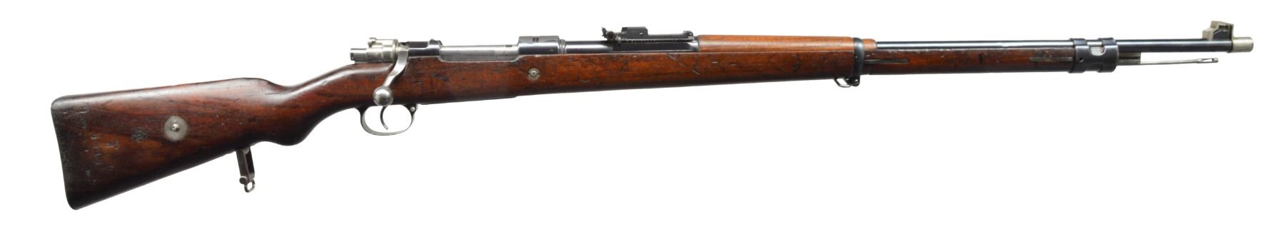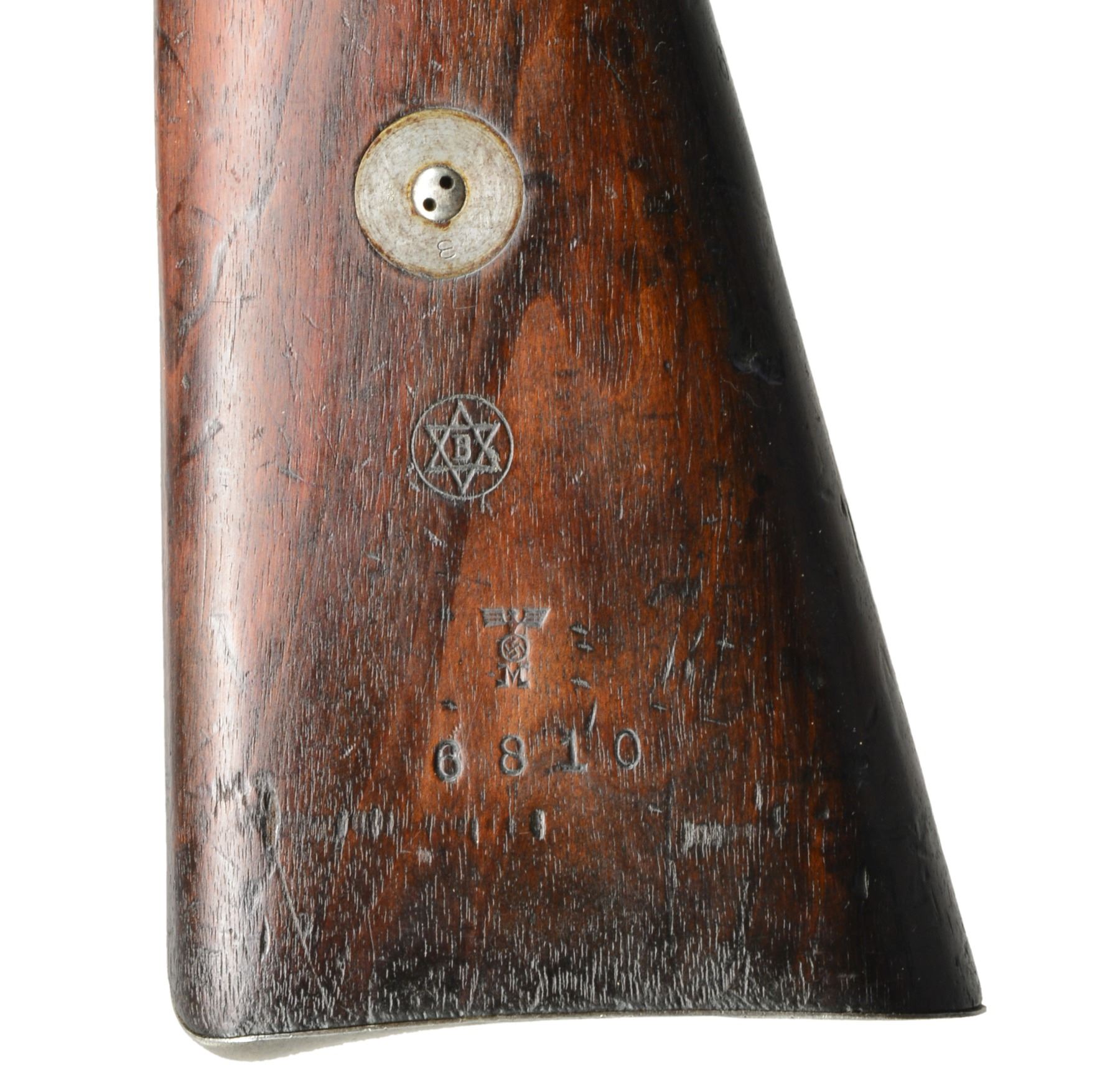ANSCHUTZ. Cal. 8.15 X 46R. S# 6810. Bbls. 29 1/2" Military profile marked "Bohler Stahl" on top rear. Left rear stamped w/ imperial German nitro proofs. S#, caliber & makers mark "U. A." over "Z" in a shield (Udo Anschutz, highly regarded maker of target rifles & pistols from town: Zella " St. Blassii). Bottom of bbl. stamped w/ BUG proofs, caliber & date code (11.34). Lange sight base has been fitted w/ new locked down slide holding windage & elevation adj. V-notch rear sight. Front sight is typical military style under protective nickel plated cover. Large ring Model 98 Mauser action of unknown origin (no maker markings) has stippled receiver ring top w/ unstippled area engraved "Wehrmannbuchse". Bottom of action stamped w/ S# & "UA" in oval. Bolt w/ special rimmed cartridge extractor has had handle lowered & swept for scope use. Cartridge follower appears to be specially made w/ rounded top tray to feed 8.15 x 46R cartridge. No numbers present. Bottom metal does not match & is numbered "B2504". Floorplate is marked "70". Typical military stock of lightly figured dark European walnut has unusual markings on right side of butt, including a circular mark around a dbl. triangle star of David w/ central B (Bohler?), matching S# to action & a Kriegsmarine waffenampt. The toeline stamped w/ "6204" & "S. WEISS". Bbl. bands have liberty cap stamp as found on the 1909 Argentine model. CONDITION: good to fine. Bbl. & action retain nearly all of their original blue w/ some minor sharp edge wear. Stock & action are cut to accept lowered bolt. Bolt is polished bright. Stock has original finish w/ numerous marks, dings & bumps. Markings are clear. Bore is fine, bright, sharp & shiny. (20-787/MGM103). CURIO. $800-1,200.