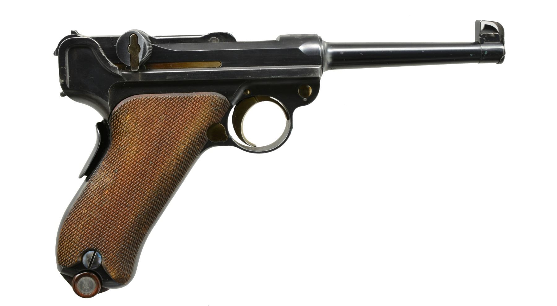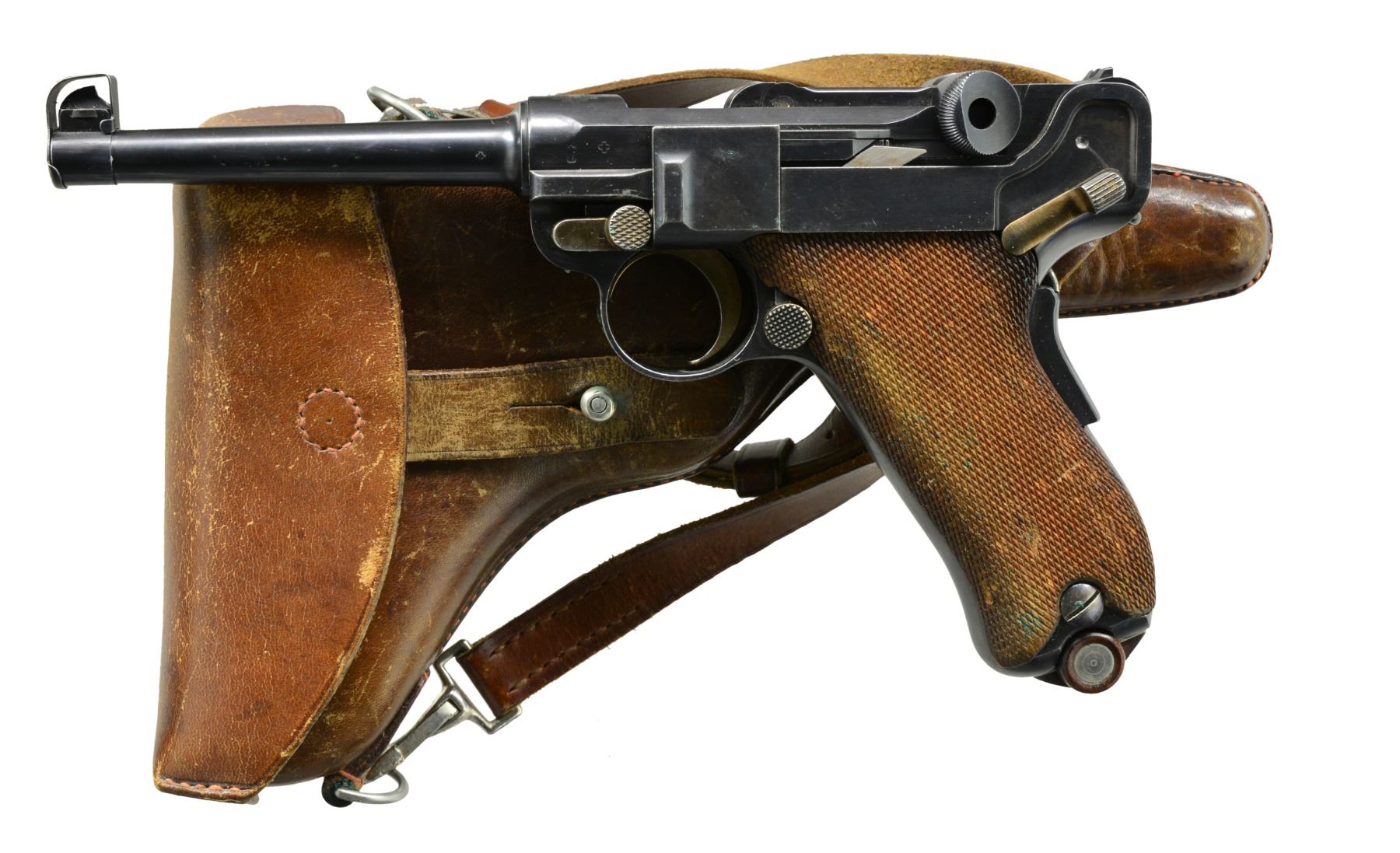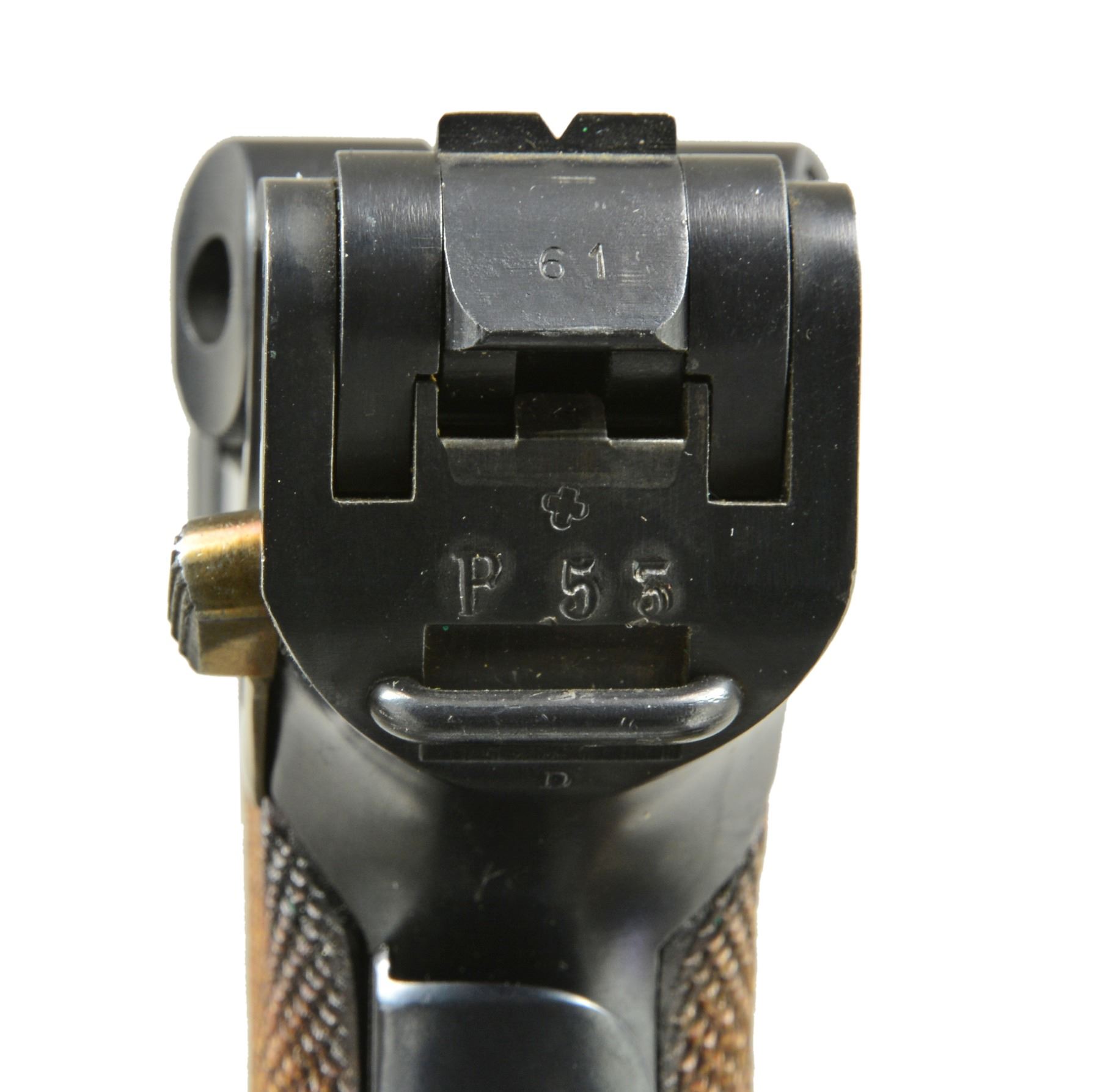 MUZZLE CAP, HOLSTER. Cal. 7.65mm Luger. S# 5061A. An extraordinarily rare Swiss military Luger, one of only 100 such pistols, in the serial range 5001A-5100A. In 1914, DWM suspended Luger deliveries to Switzerland in favor of arming its own military. That left the Swiss with a weapons shortage. To supply pistols to newly graduating officers, a number of instructional pistols in the "E." series were recalled and forwarded to the Bern arsenal for reconditioning. Part of the process included a renumbering, whereby the E.xxx number was removed and replaced with a serial starting from 5001 so as to continue the range of the previously issued M1900s. However, as by that time the M1906s had been issued with serial numbers starting with 5001, these guns were distinguished by adding an "A" suffix. The pistol has standard M1900 characteristics, with a 4.75" bbl., a drift adjustable front sight, and a "V" notch rear sight. Swiss Cross over chamber. Dished toggle with upgraded, reinforced extractor, anti-rebound lock, DWM on middle link, thin trigger, broad grip safety, fluted thumb safety. "P53" release at rear of frame. Major components rust blued. Trigger, takedown lever, extractor, ejector, magazine release button are strawed. Fire blued front sight and grip screws. Finely checkered walnut panels. Front sight cover marked "H. LUTHY/ARMES/NEUCHATEL". Disassembly shows all matching parts except grips, each panel numbered "661". MAGS: correct military with flat button and wood base/metal discs. UNATTACHED ACCESSORIES: VG+ holster with supple leather and intact stitching. Brown leather with strap, manufacturer marked and dated "06" on obverse surface. CONDITION: crisp 98-99% blue, minimal sharp edge wear consistent with holstering, with a nice "blue" hue as usually found on original/non-reconditioned pistols. Discreetly import marked using a fine laser etching method in an unobtrusive area. Comparable condition straw and near excellent grips. Mirror bore and near excellent manual mechanics. A super nice example of what may be the rarest of the Swiss military pistols. PROVENANCE: From the esteemed collection of Paul Regnier, Switzerland. (20-1417/LA). CURIO. $12,500-18,500.