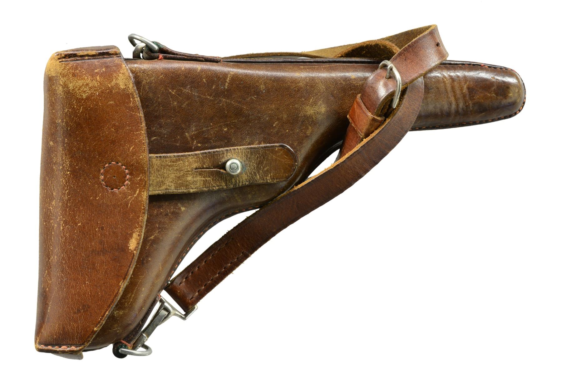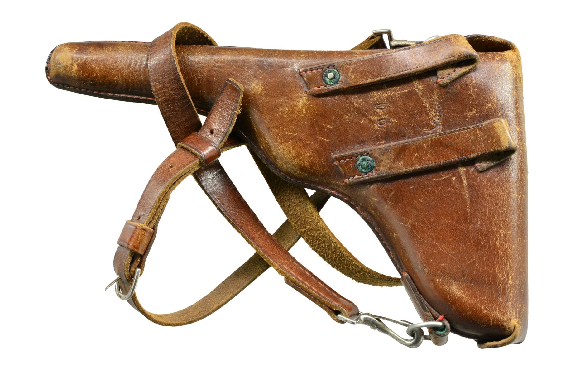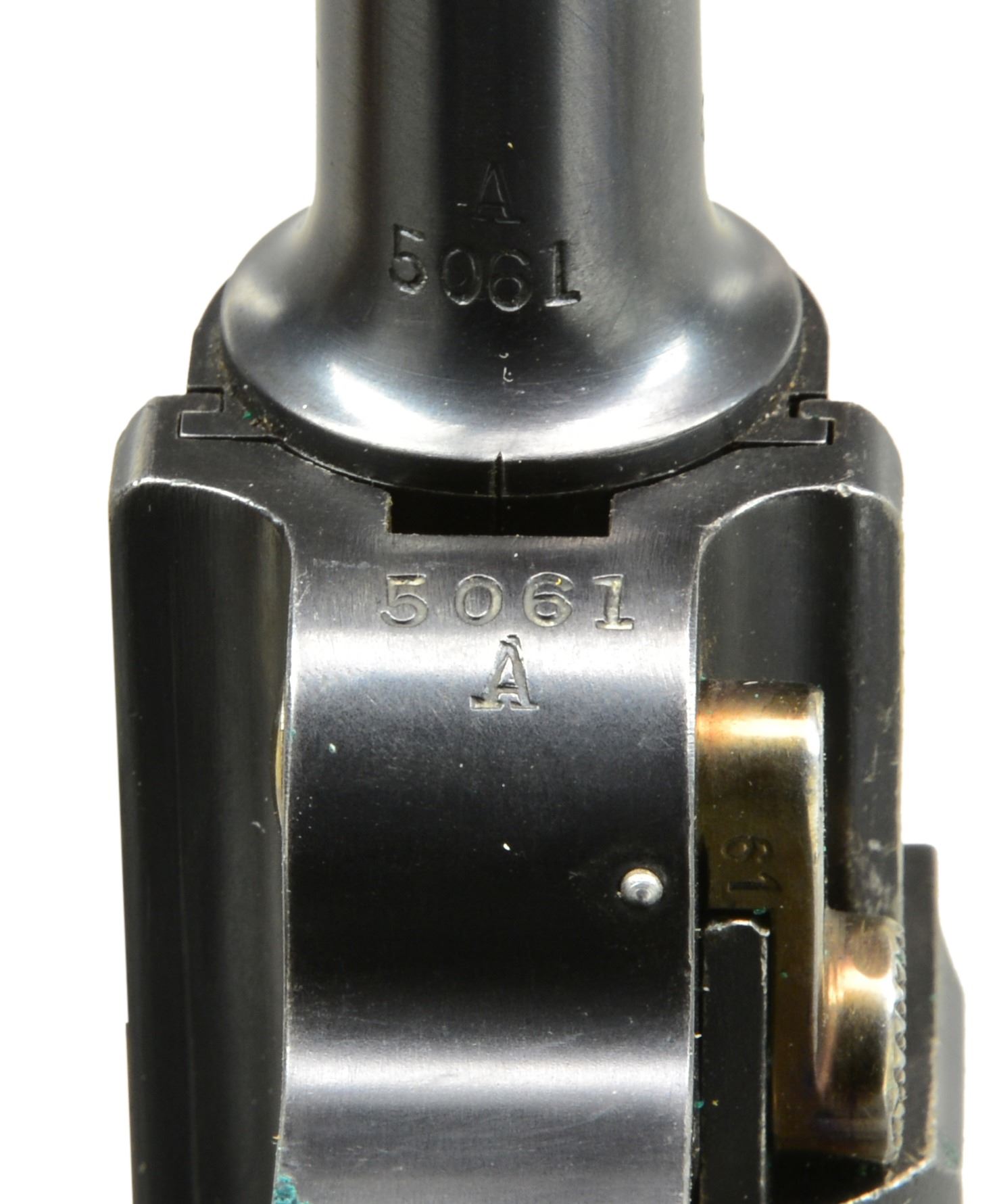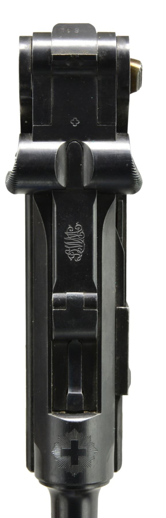 MUZZLE CAP, HOLSTER. Cal. 7.65mm Luger. S# 5061A. An extraordinarily rare Swiss military Luger, one of only 100 such pistols, in the serial range 5001A-5100A. In 1914, DWM suspended Luger deliveries to Switzerland in favor of arming its own military. That left the Swiss with a weapons shortage. To supply pistols to newly graduating officers, a number of instructional pistols in the "E." series were recalled and forwarded to the Bern arsenal for reconditioning. Part of the process included a renumbering, whereby the E.xxx number was removed and replaced with a serial starting from 5001 so as to continue the range of the previously issued M1900s. However, as by that time the M1906s had been issued with serial numbers starting with 5001, these guns were distinguished by adding an "A" suffix. The pistol has standard M1900 characteristics, with a 4.75" bbl., a drift adjustable front sight, and a "V" notch rear sight. Swiss Cross over chamber. Dished toggle with upgraded, reinforced extractor, anti-rebound lock, DWM on middle link, thin trigger, broad grip safety, fluted thumb safety. "P53" release at rear of frame. Major components rust blued. Trigger, takedown lever, extractor, ejector, magazine release button are strawed. Fire blued front sight and grip screws. Finely checkered walnut panels. Front sight cover marked "H. LUTHY/ARMES/NEUCHATEL". Disassembly shows all matching parts except grips, each panel numbered "661". MAGS: correct military with flat button and wood base/metal discs. UNATTACHED ACCESSORIES: VG+ holster with supple leather and intact stitching. Brown leather with strap, manufacturer marked and dated "06" on obverse surface. CONDITION: crisp 98-99% blue, minimal sharp edge wear consistent with holstering, with a nice "blue" hue as usually found on original/non-reconditioned pistols. Discreetly import marked using a fine laser etching method in an unobtrusive area. Comparable condition straw and near excellent grips. Mirror bore and near excellent manual mechanics. A super nice example of what may be the rarest of the Swiss military pistols. PROVENANCE: From the esteemed collection of Paul Regnier, Switzerland. (20-1417/LA). CURIO. $12,500-18,500.