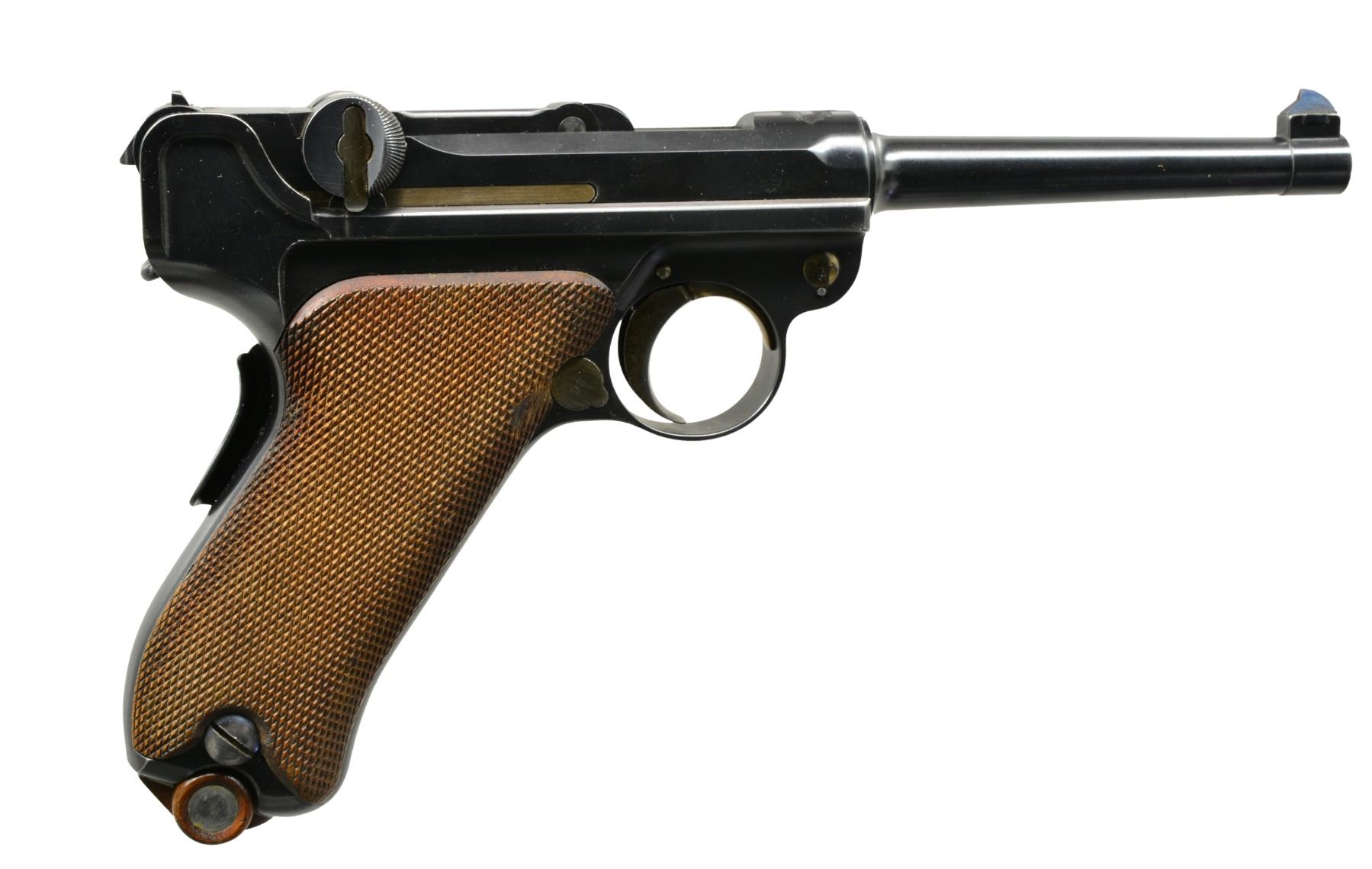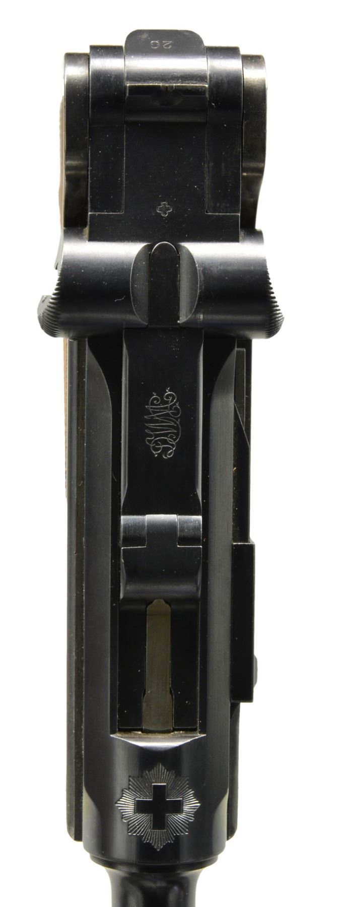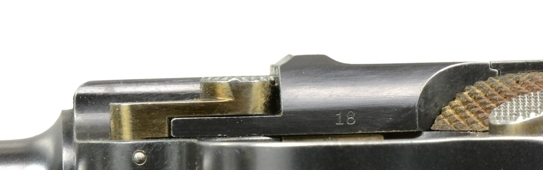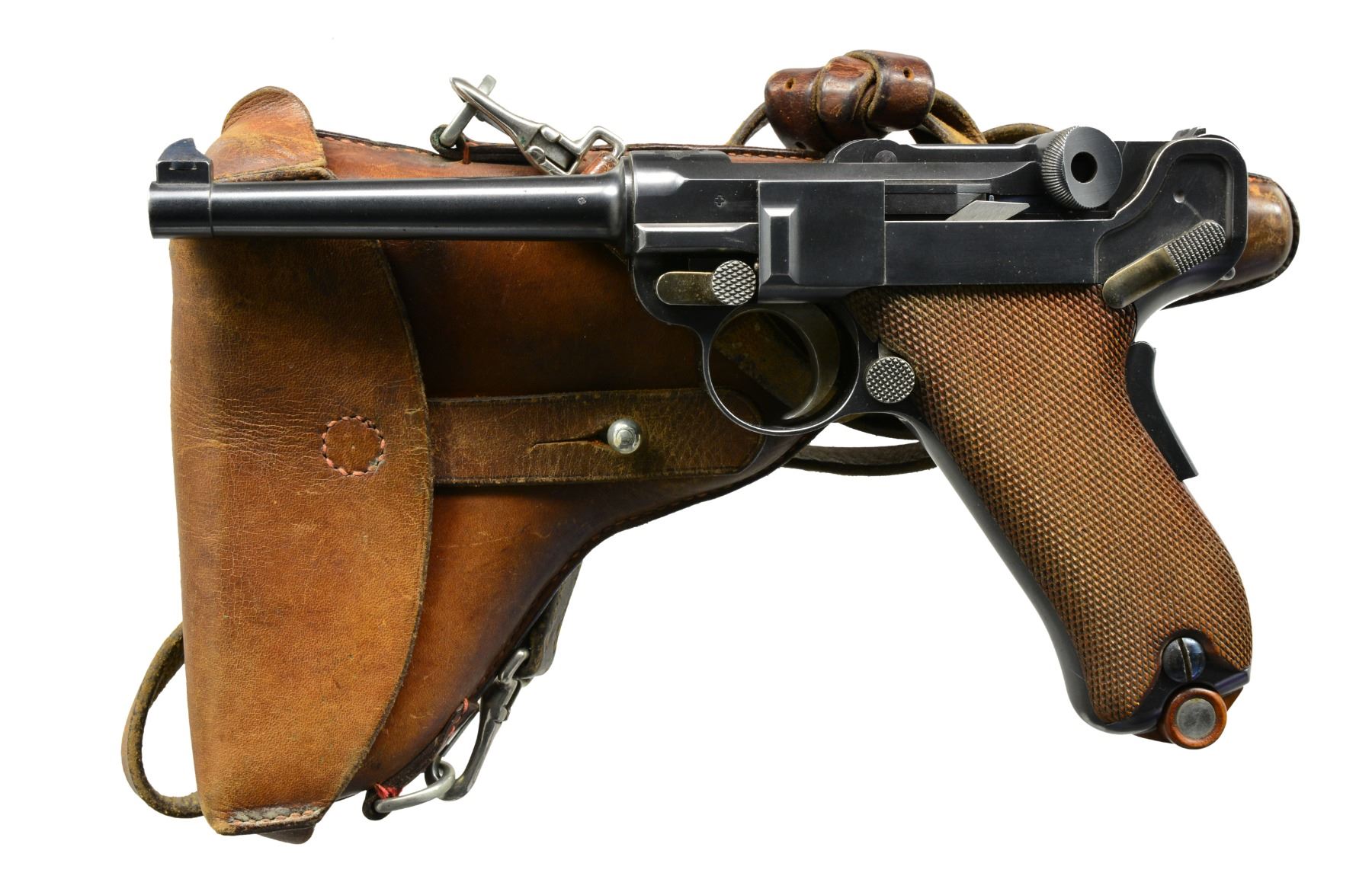 MILITARY HOLSTER. Cal. 7.65mm Luger. S# 426. This is a beautiful example of a very early Swiss Army Luger Model 1900, with relieved frame, update magazine and correctly dated military holster. As per all the Swiss M1900 Lugers, major parts are rust blued with strawed or fire blued small parts. The chamber area is roll marked with the Swiss Cross in Sunburst and the DWM monogram is on the toggle. Desirable, early features include the dished toggles with toggle lock, flat breech bolt, with the small spring extractor, fast taper 4.75" barrel and first pattern safety lever with the large checkered head. The relieved frame has the flat recoil springs, narrow trigger and narrow grip safety. The majority of components: barrel, barrel extension, rear of the frame and top of the toggle assembly all have small Swiss Army Cross inspector proofs. Fitted with checkered walnut grips. Disassembly shows all matching numbers except the sideplate that is numbered "18". MAGS: original military whose wood base has a metallic disc on each side. UNATTACHED ACCESSORIES: original leather holster with shoulder strap, stamped on the back side with the Swiss inspection proof of a boxed Swiss Cross/B proof and maker"s mark "G. LEHMANN/SATTLER/BERN 03". The holster is in fine condition with a light brown color overall with intact stitching showing general light scuffing overall with wear on top of the flap. It has clear distinct markings on the back. The lower toe shows some wrinkling of the leather with a heavier scuff mark on the back side. CONDITION: near excellent with 98% plus of the original blue finish overall with only a hint of edge and high spot wear overall with blue loss on the very front edge of the frame rails, edge of the sideplate and the lower front grip strap. The smaller parts retain comparable straw color with the majority of the loss on the face of the trigger. Discreetly import marked using a fine laser etching method in an unobtrusive area. The grips are near excellent with nice, sharp distinct checkering overall, a small pressure dent on the right side behind the magazine release button. It has a near excellent bore and hand cycles and dry fires correctly. A high condition, early Swiss Army M1900 with correctly dated military holster. PROVENANCE: From the esteemed collection of Paul Regnier, Switzerland. (20-1426/LA). CURIO. $5,500-7,500.