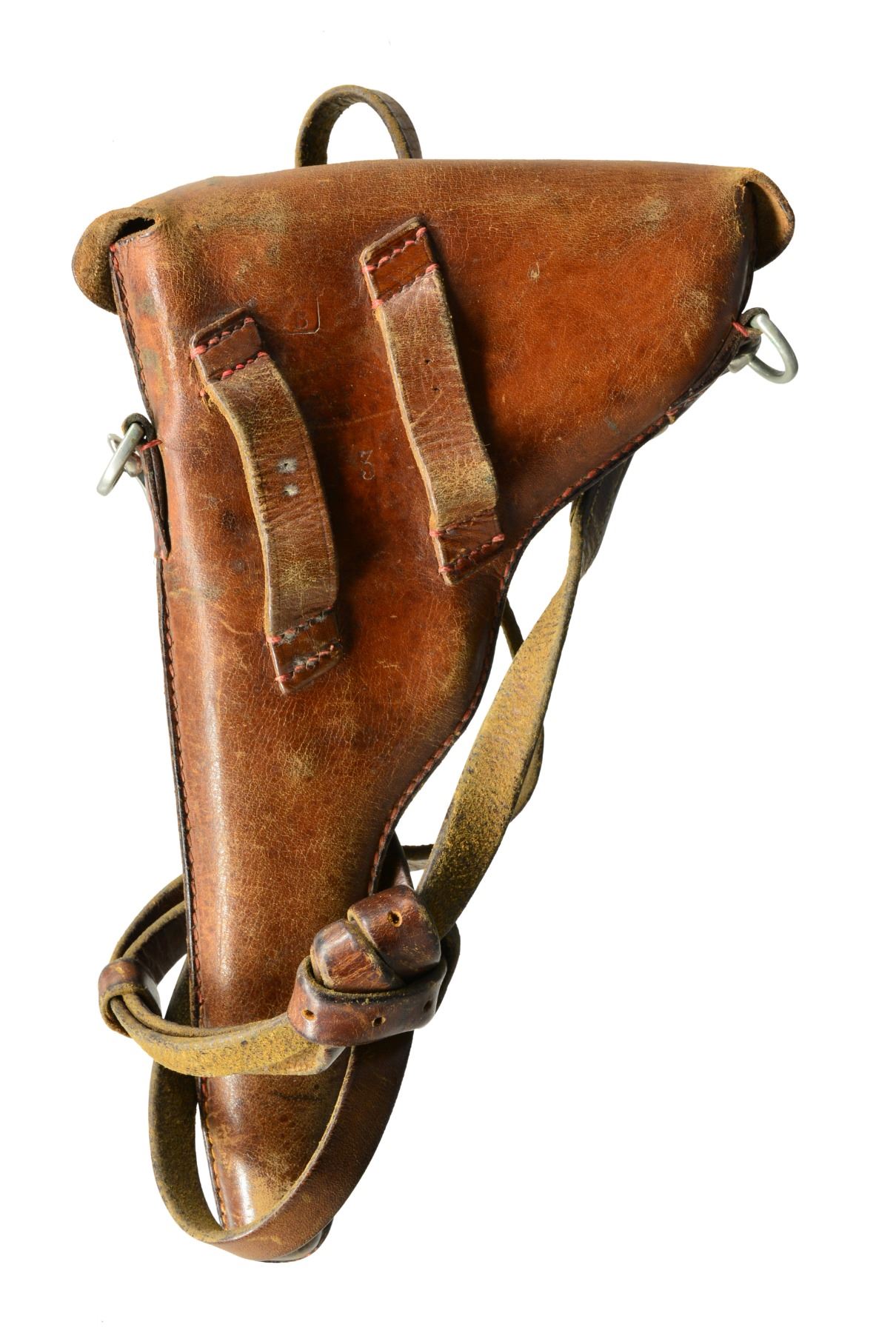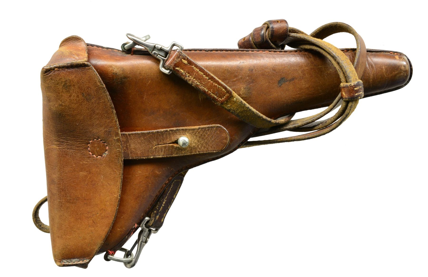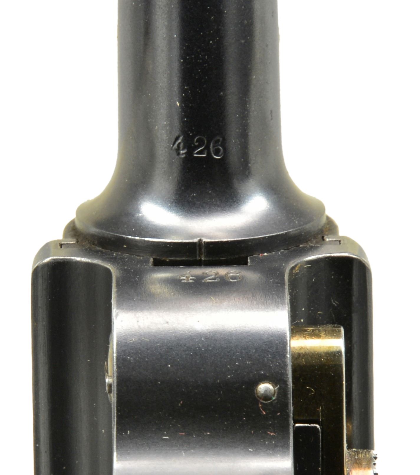 MILITARY HOLSTER. Cal. 7.65mm Luger. S# 426. This is a beautiful example of a very early Swiss Army Luger Model 1900, with relieved frame, update magazine and correctly dated military holster. As per all the Swiss M1900 Lugers, major parts are rust blued with strawed or fire blued small parts. The chamber area is roll marked with the Swiss Cross in Sunburst and the DWM monogram is on the toggle. Desirable, early features include the dished toggles with toggle lock, flat breech bolt, with the small spring extractor, fast taper 4.75" barrel and first pattern safety lever with the large checkered head. The relieved frame has the flat recoil springs, narrow trigger and narrow grip safety. The majority of components: barrel, barrel extension, rear of the frame and top of the toggle assembly all have small Swiss Army Cross inspector proofs. Fitted with checkered walnut grips. Disassembly shows all matching numbers except the sideplate that is numbered "18". MAGS: original military whose wood base has a metallic disc on each side. UNATTACHED ACCESSORIES: original leather holster with shoulder strap, stamped on the back side with the Swiss inspection proof of a boxed Swiss Cross/B proof and maker"s mark "G. LEHMANN/SATTLER/BERN 03". The holster is in fine condition with a light brown color overall with intact stitching showing general light scuffing overall with wear on top of the flap. It has clear distinct markings on the back. The lower toe shows some wrinkling of the leather with a heavier scuff mark on the back side. CONDITION: near excellent with 98% plus of the original blue finish overall with only a hint of edge and high spot wear overall with blue loss on the very front edge of the frame rails, edge of the sideplate and the lower front grip strap. The smaller parts retain comparable straw color with the majority of the loss on the face of the trigger. Discreetly import marked using a fine laser etching method in an unobtrusive area. The grips are near excellent with nice, sharp distinct checkering overall, a small pressure dent on the right side behind the magazine release button. It has a near excellent bore and hand cycles and dry fires correctly. A high condition, early Swiss Army M1900 with correctly dated military holster. PROVENANCE: From the esteemed collection of Paul Regnier, Switzerland. (20-1426/LA). CURIO. $5,500-7,500.