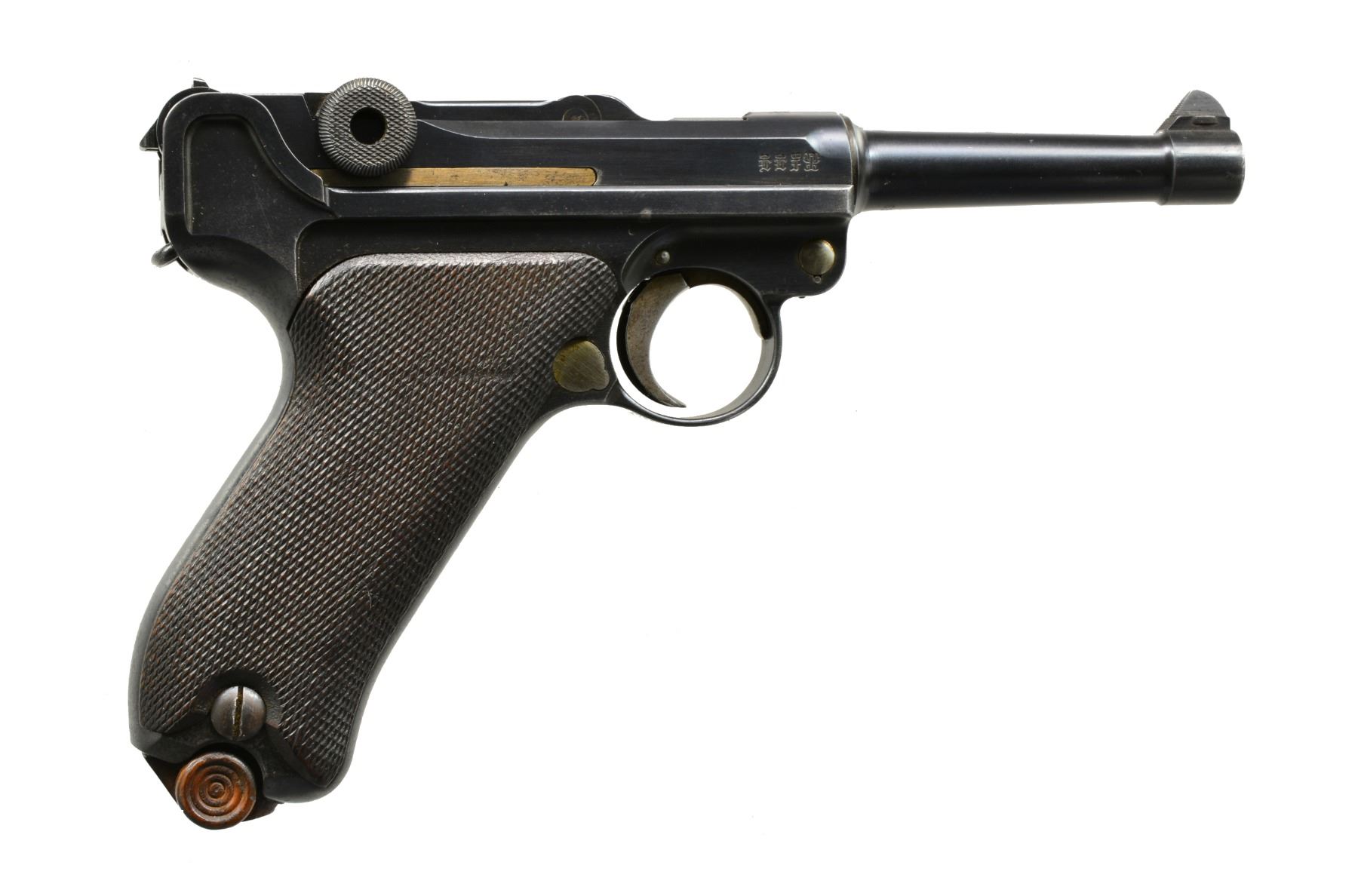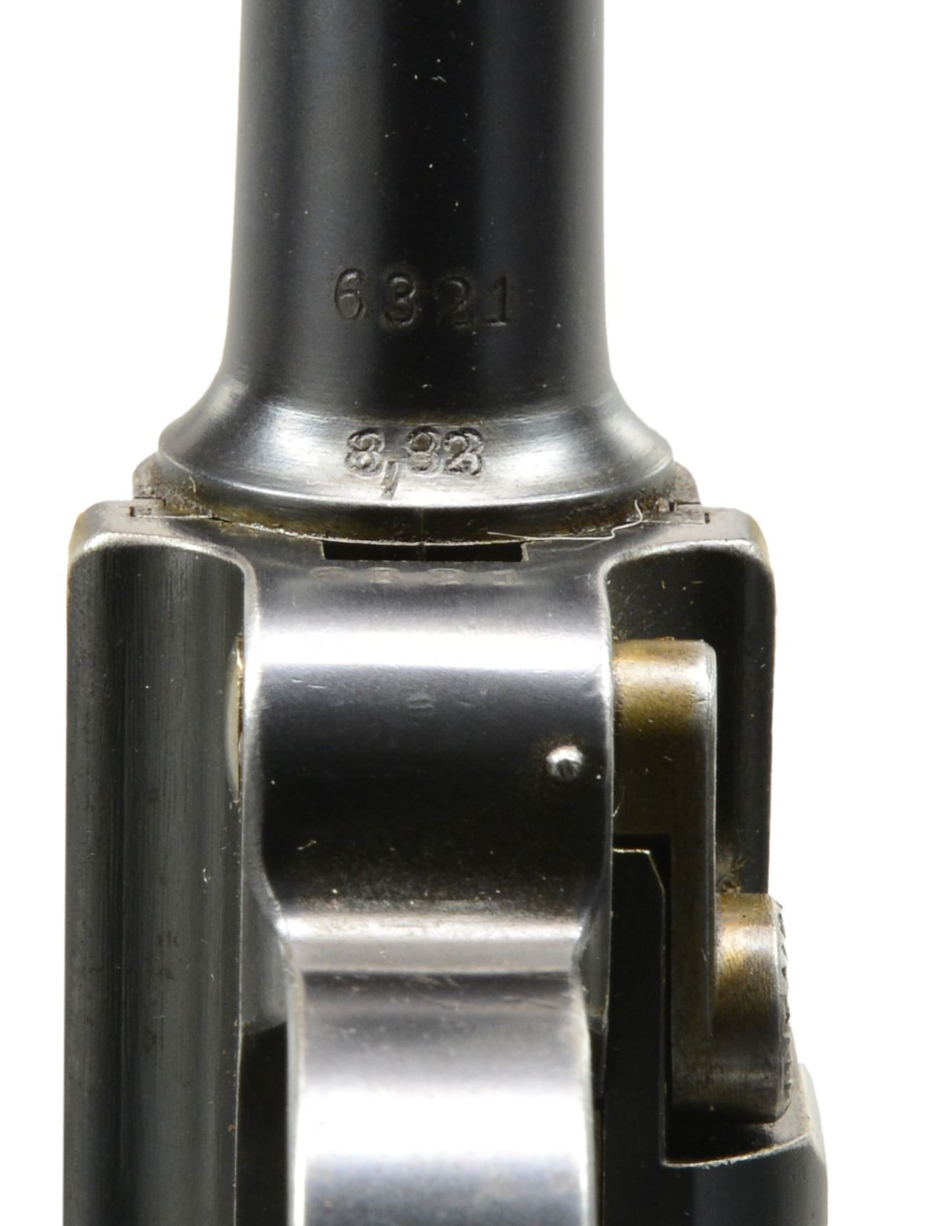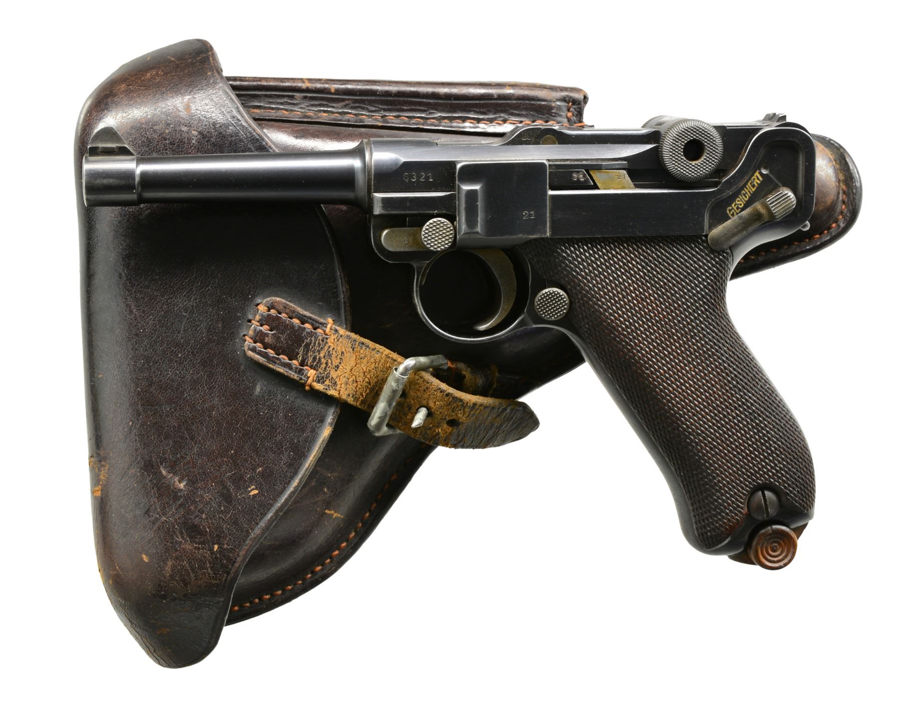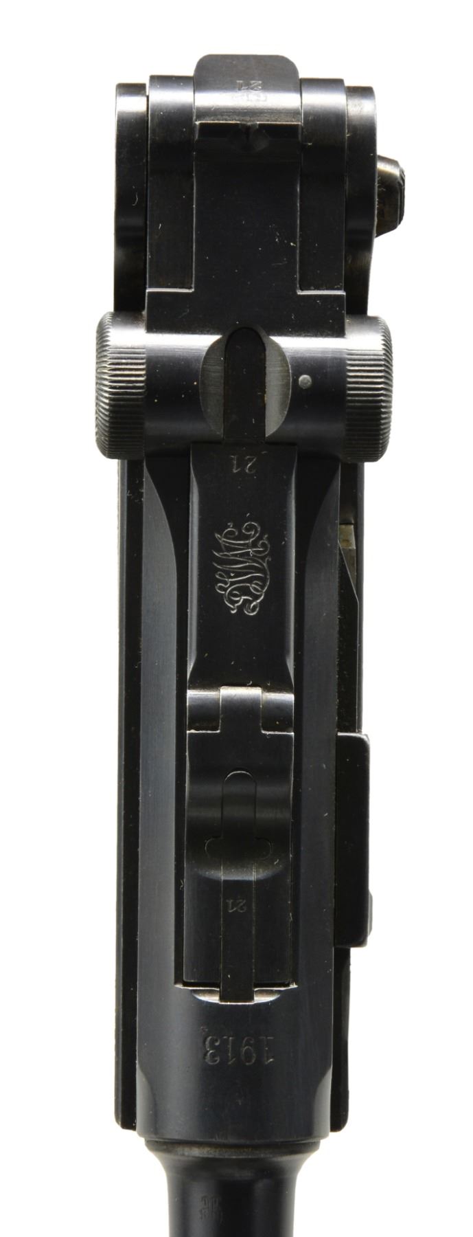 PISTOL. Cal. 9 mm Luger. S# 6321. Bbl. 4" w/ fin shaped front sight blade. Chamber dated 1913. All matching numbers including firing pin & grips. Strawed sm. parts plus appropriate interior areas are in the white. Mfg. w/out stock lug. MAGS: 2 very good blued 8 rd. w/ wood bases having concentric circles in dimples; numbered "5813" & "5182" reading perpendicular to dimples plus crown "M" proof. UNATTACHED ACCESSORIES: good flap holster w/ buckle strap retention; buckle has mottled oxidized appearance, typical scuffs, cracking of leather & light wear. Reddish tone to stitching resulting from prior polishing. Loading tool w/ crown "M" proof. CONDITION: generally very good appearance w/ light high point wear along w/ some light cleaned peppery oxidation being more concentrated on grip straps. Slightly faded straw colors w/ faint stained appearance except for very good mag. latch & slightly better ejector. Very good appearing left grip w/ only minimal hand wear. Right grip has slightly more wear including horizontal rub line about 1" from top. Fair to good bore w/ even cleaned light pitting. (20-471/NW). CURIO. $1,000-1,500.