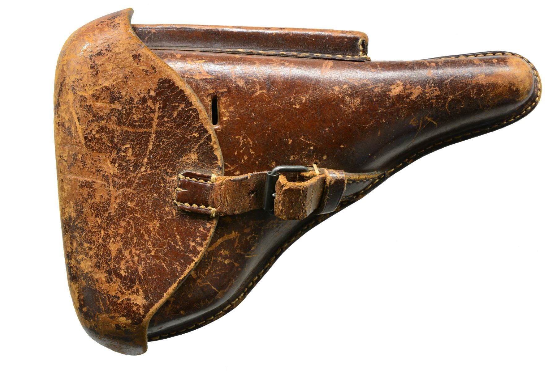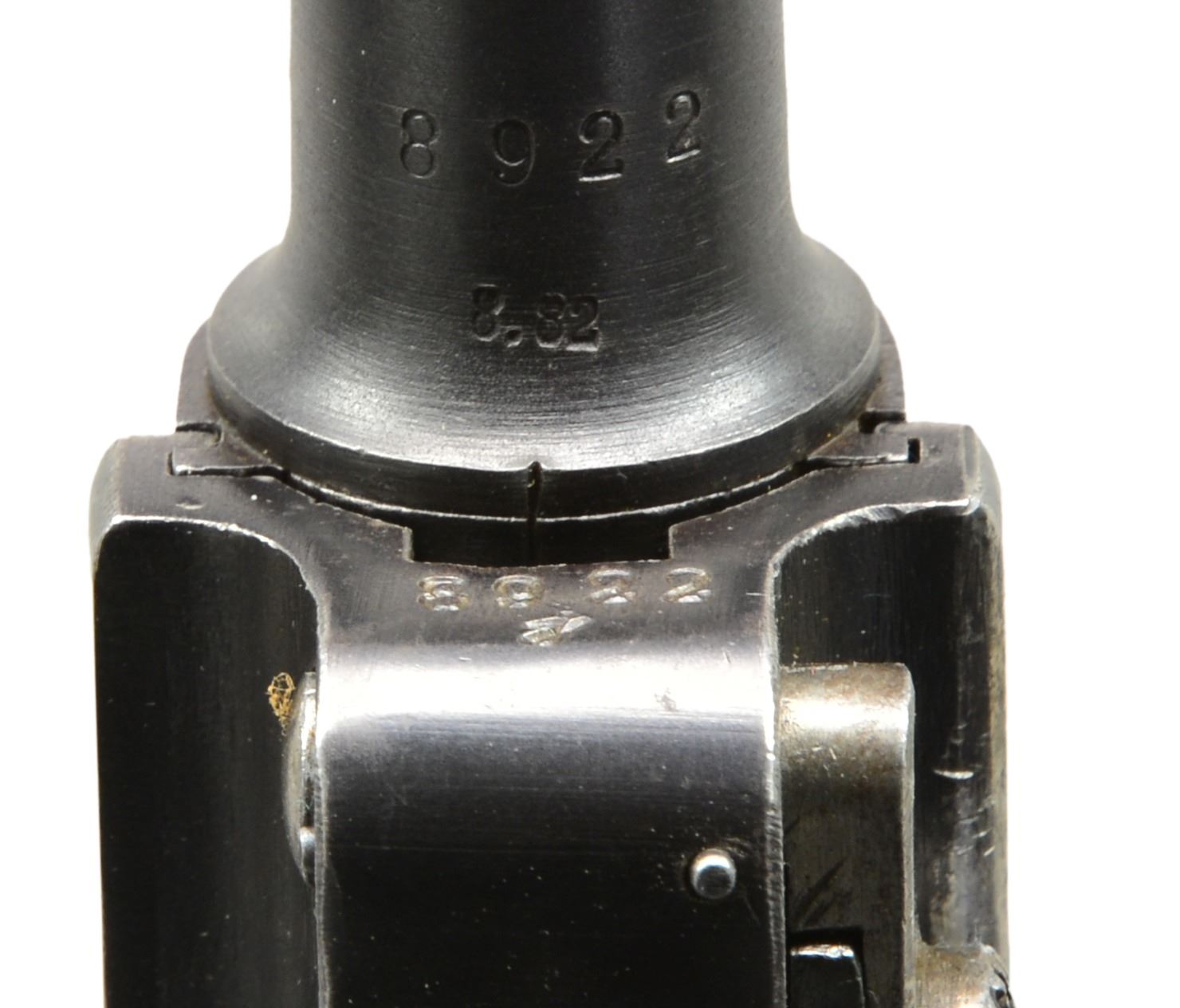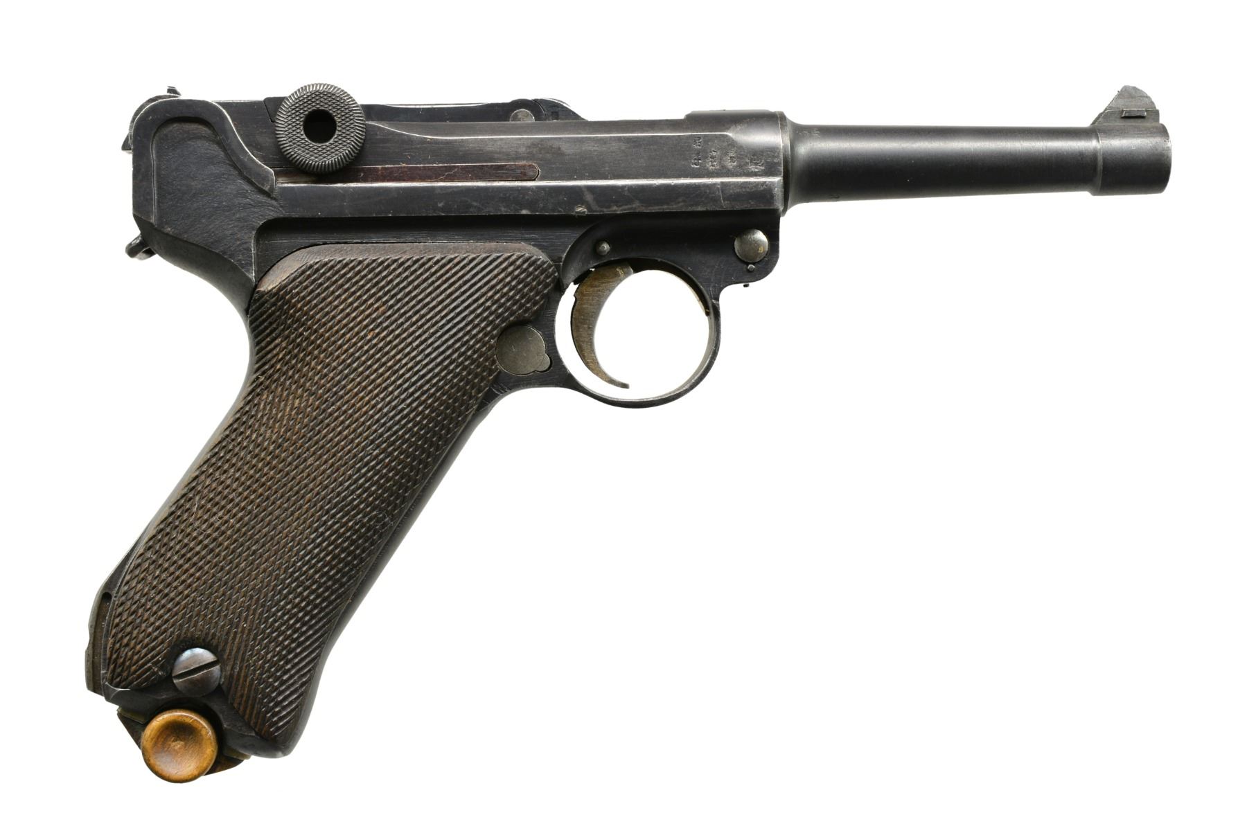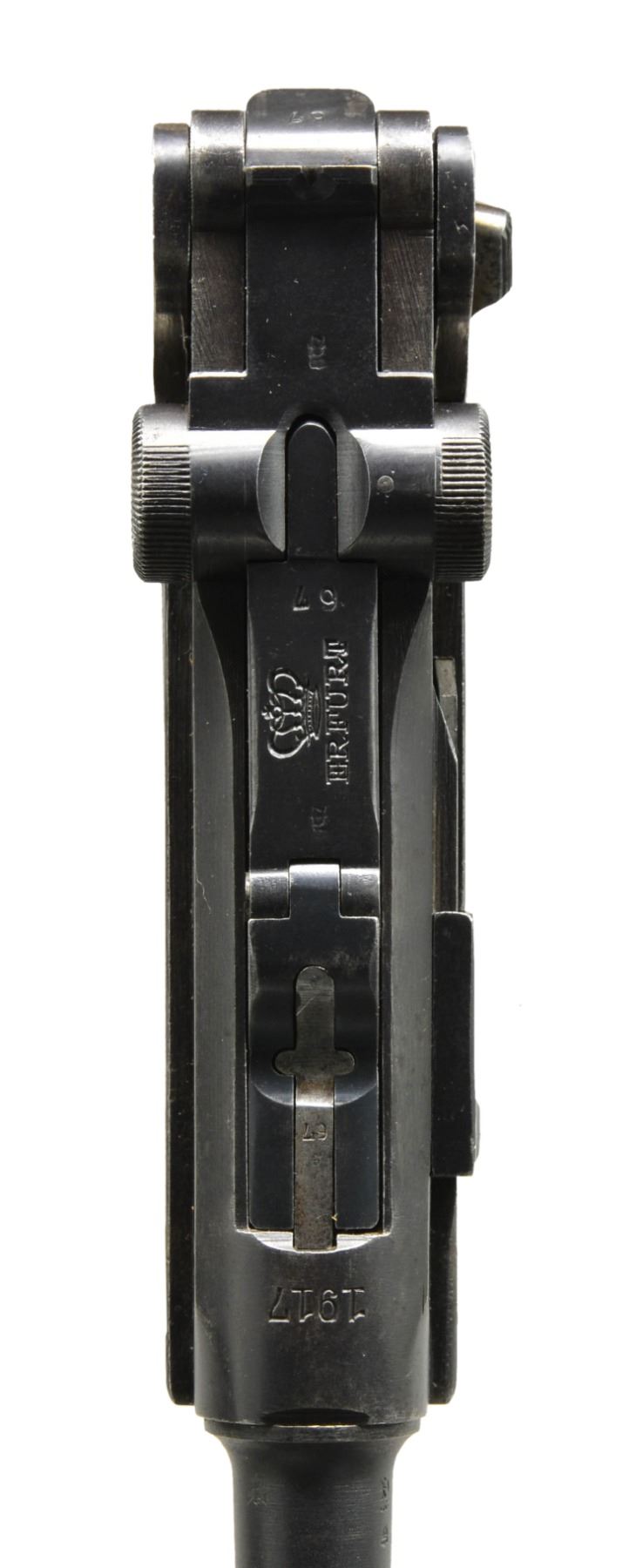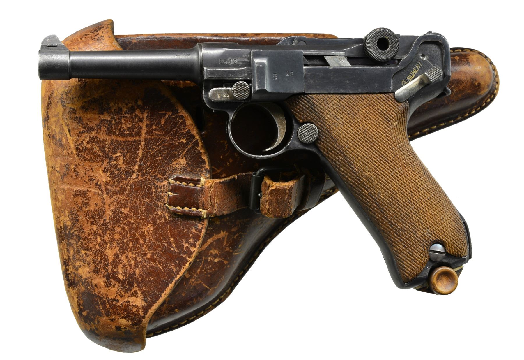 Cal. 9mm Luger. S# 8922j. Bbl. 4", chamber dated 1917. Entire toggle assembly numbered 67; remainder of firearm including grips numbered 22. Back of both grips also have crown U & "h". Appropriate interior areas in the white. Blued ejector, other sm. parts strawed. MAGS: 2-8 rd., very good dull plated w/ matching numbered wood base plus fair gray toned, stained as well as plated w/ wood base numbered 5207n & +. UNATTACHED ACCESSORIES: fair brown flap holster w/ buckle & strap retention plus dbl. belt loops. Underside of flap neatly inked w/ 8922 & "W". Makers stamp of "STEINMETZ / BRESLAU / 1917" under flap plus good Erfurt proofed tool. Numerous scuffs throughout holster especially on flap; missing top portion of lift strap. CONDITION: good overall arsenal like refinished appearance w/ scattered peppery oxidation. Best straw colors on trigger; others noticeably faded. Extractor w/ stained unfinished appearance & "S" proof marked. Very good grips w/ minimal wear; medium toned left; very dark right. Fair, worn & pitted bore. (19-5728/NW). CURIO. $800-1,200.