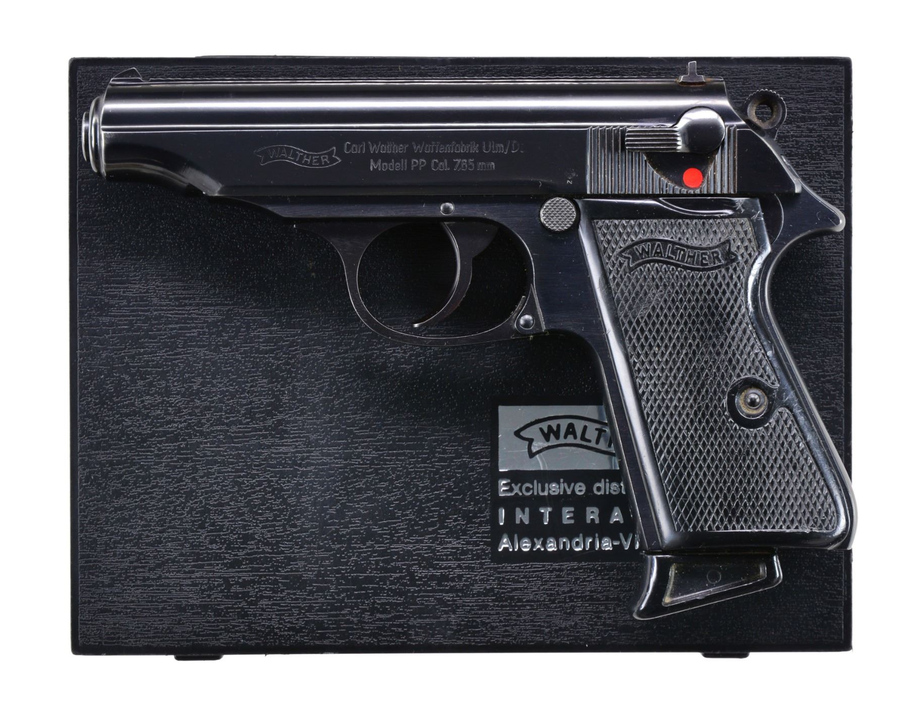 Cal. 7.65mm (32 ACP). S# 329435. Bbl. 3 7/8". Mfg. 1964 (imported 1963-2000) in Germany having blued finish w/ right side of matching numbered (internally marked) slide having 'Interarms/VA." & "NW 453". Shield in circle to right of frame S# plus eagle N proofs on frame, slide & bbl. Checkered Walther banner black plastic grips. MAGS: 2 factory numbered "453" blued 8 rd. TOTAL; finger extension base & flat base. UNATTACHED ACCESSORIES: Walther / Interarms black plastic box. CONDITION: minimal high point wear near front of pistol plus light wear & marks on grips; all other aspects including bore are near excellent. (19-4233/NW). CURIO. $400-550.