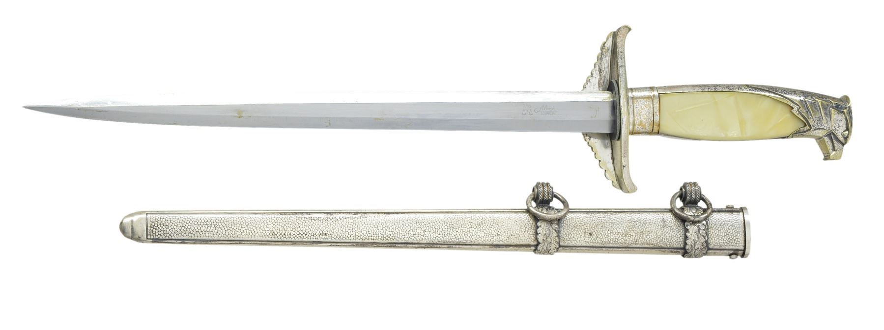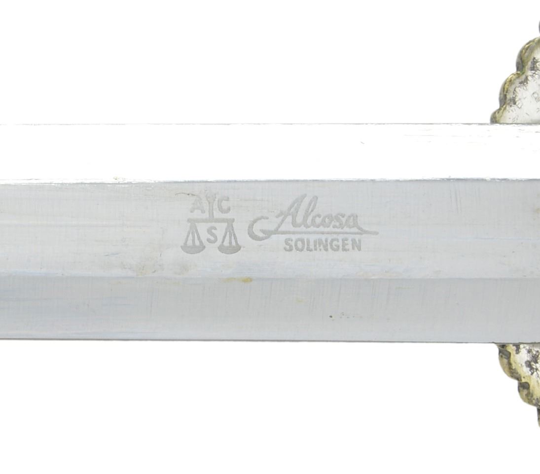 Overall length: 15 5/8". Blade is marked "A C (scales) S" & "ALCOSA SOLINGEN". Crossguard is represented by an eagle w/ slightly upturned wings facing to its right. Grips are mother of pearl like plastic. Pommel is a stylized eagle head. Plated scabbard w/ correct mounts & rings. CONDITION: blade shows primarily scabbard wear. Finish on hilt is better than 90%. Grips are undamaged. Spanner nut on top of the pommel is a bit scratched. Scabbard shows expected light wear. (02-13634/BF). $2,500-3,500.
