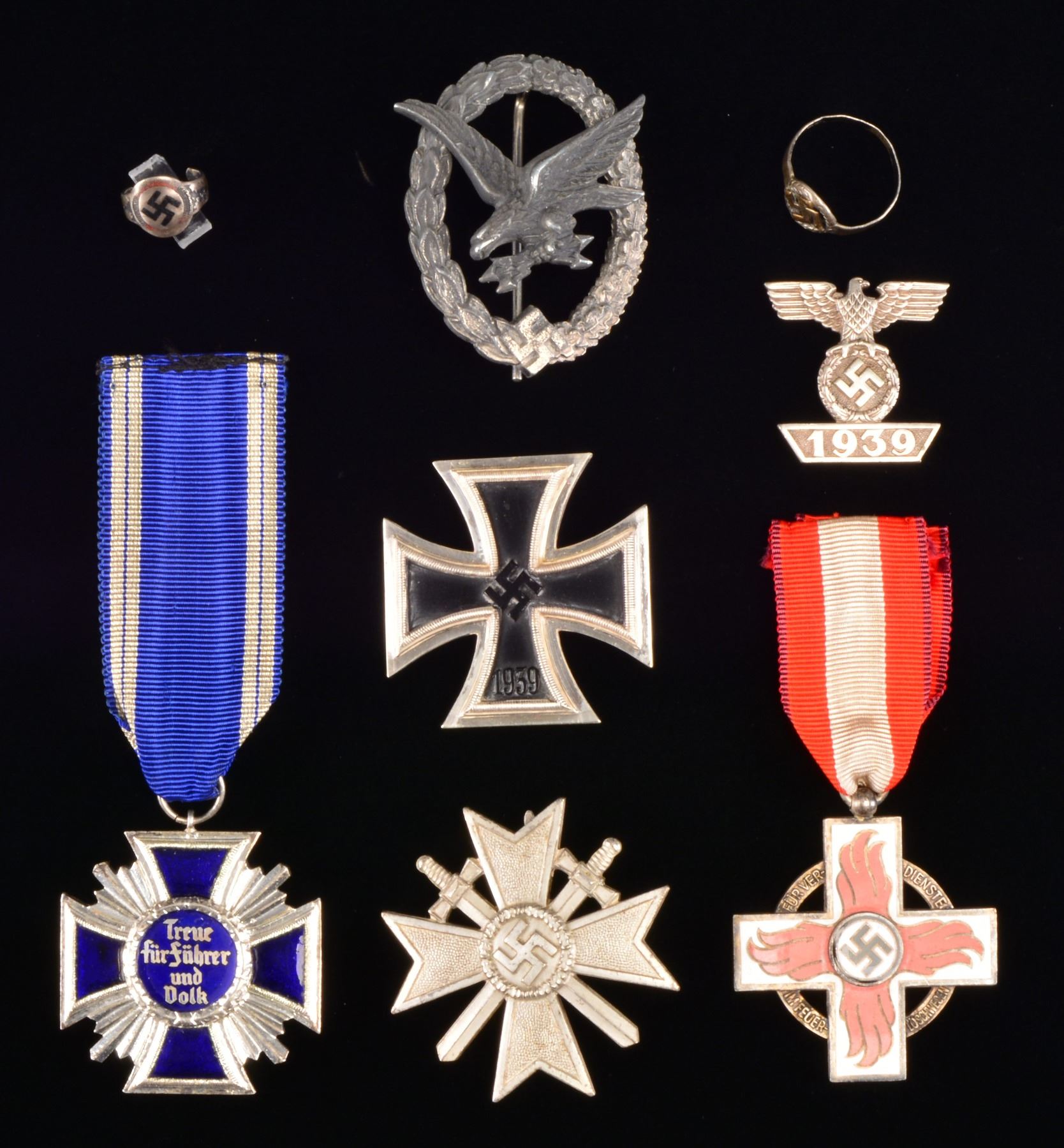 This exciting lot of original WWII German decorations include a First Class Iron Cross w/ wide pin, a First Class War Merit Cross w/ swords & wide pin, a 1939 Spange, a 15 year NSDAP Long Service medal w/ ribbon, Fire Brigade Cross Second Class, Wireless Operator/Arial Gunner badge, silver finger ring featuring a wreath w/ a central gold Party symbol, Child"s silver finger ring w/ a black enamel Party symbol in the center. CONDITION: all medals & badges show light wear commensurate w/ age. Wireless badge has some oxidation to finish. Child"s ring has been cut on the back. (02-13637/BF). $1,000-1,500.