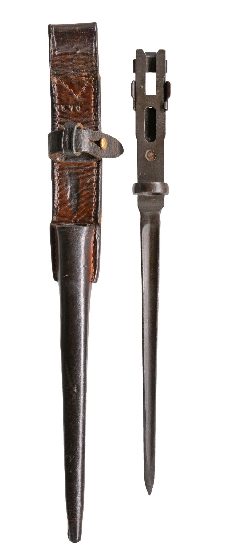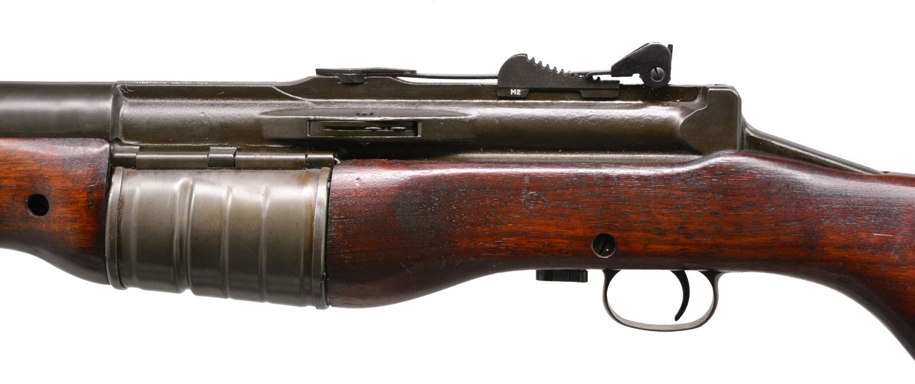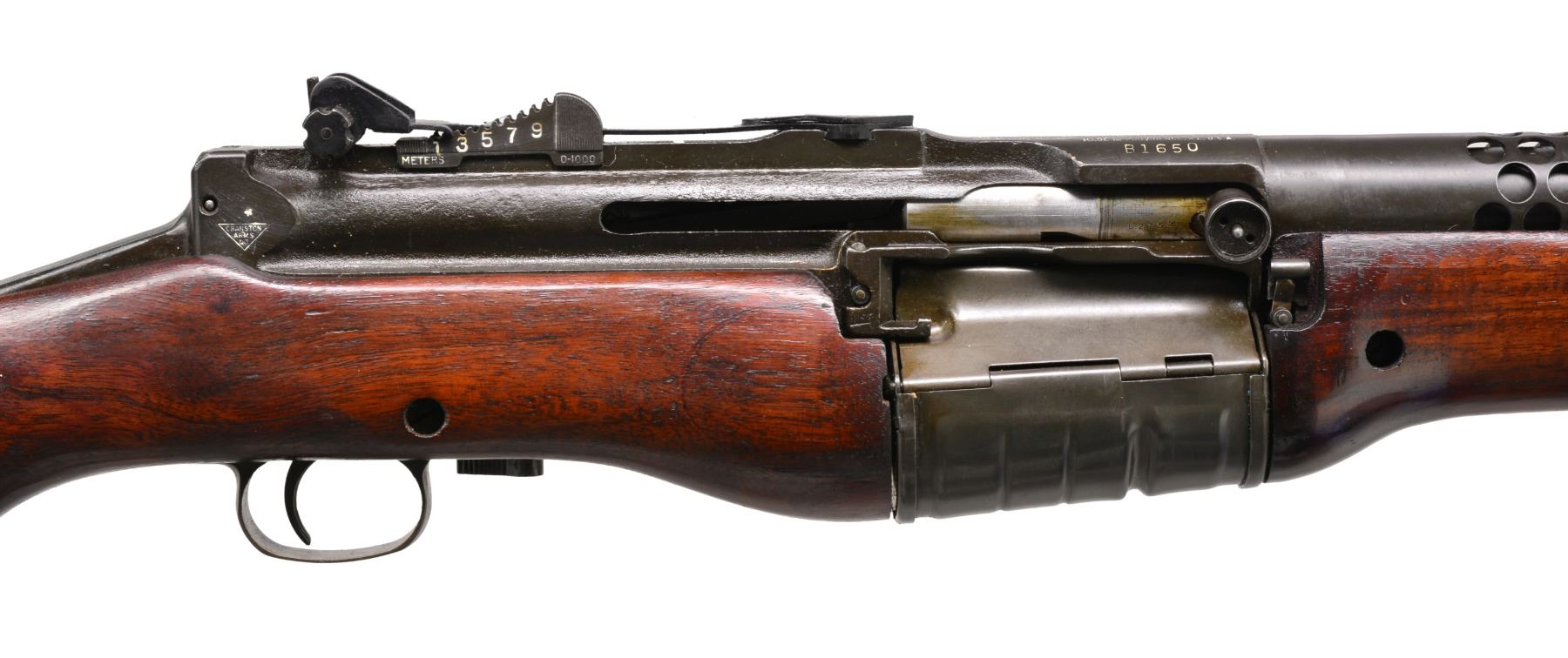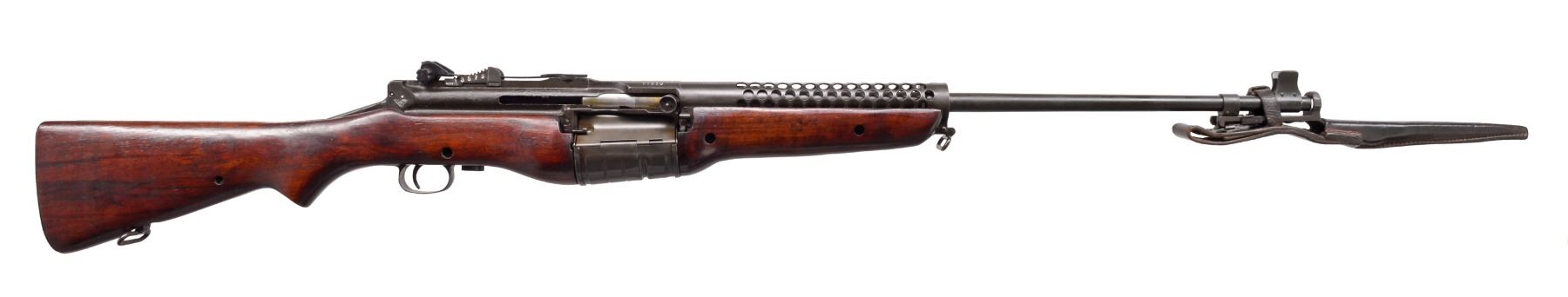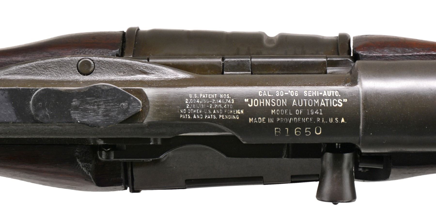 Cal. 30-06. S# B1650. Bbl. 21 3/4" w/ bayonet lug. Very nice example of a Johnson military rifle. Adj. aperture rear sight graduated to 1,000m. Blade front sight w/ protective ears. Receiver is marked on right rear w/ "CRANSTON ARMS CO" in triangle surmounted by star as Dutch contract acceptance mark. Receiver is additionally marked on top " "JOHNSON AUTOMATICS" Cal. 30-'06 SEMI AUTO MODEL OF 1941". Markings have been enhanced in white. Author Bruce N. Canfield states in "Johnson Rifles & Machine Guns", that parts numbers were not matched at factory during mfg. Bbl. is marked on top over chamber "J.A. 30-'06". Marked below chamber w/ S#. Bbl. is additionally marked w/ S#, Dutch proof mark & "J". Unmarked original walnut stock w/ checkered steel buttplate. UNATTACHED ACCESSORIES: unmarked 8" triangular bayonet. Original leather scabbard marked "370". Bayonet has lightly worn original finish. Scabbard has wear, scuffing & flexing, stitching appears tight. Unmarked vintage US Model 1907 style sling, sliding keepers not present. Sling has wear scuffing & flexing. CONDITION: original finish walnut stock. Buttstock has professionally repaired approx. 6" crack on left side extending forward from receiver tang. Stock has light wear & handling marks commensurate w/ careful service use. Metal has 90% original finish w/ light high point wear & scattered light handling marks. Very good shiny bore. (19-5968/RW). CURIO. $4,000-6,000.
