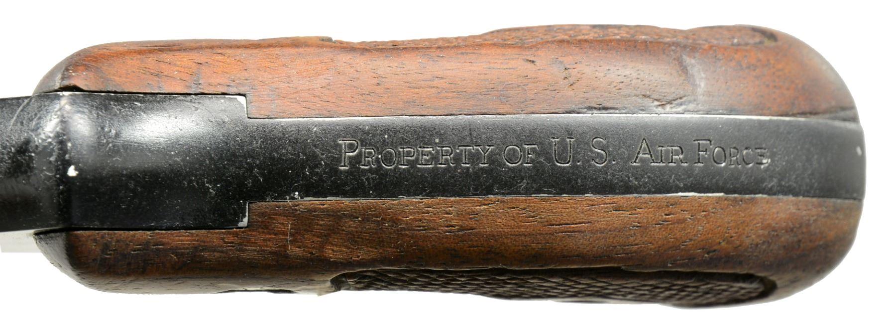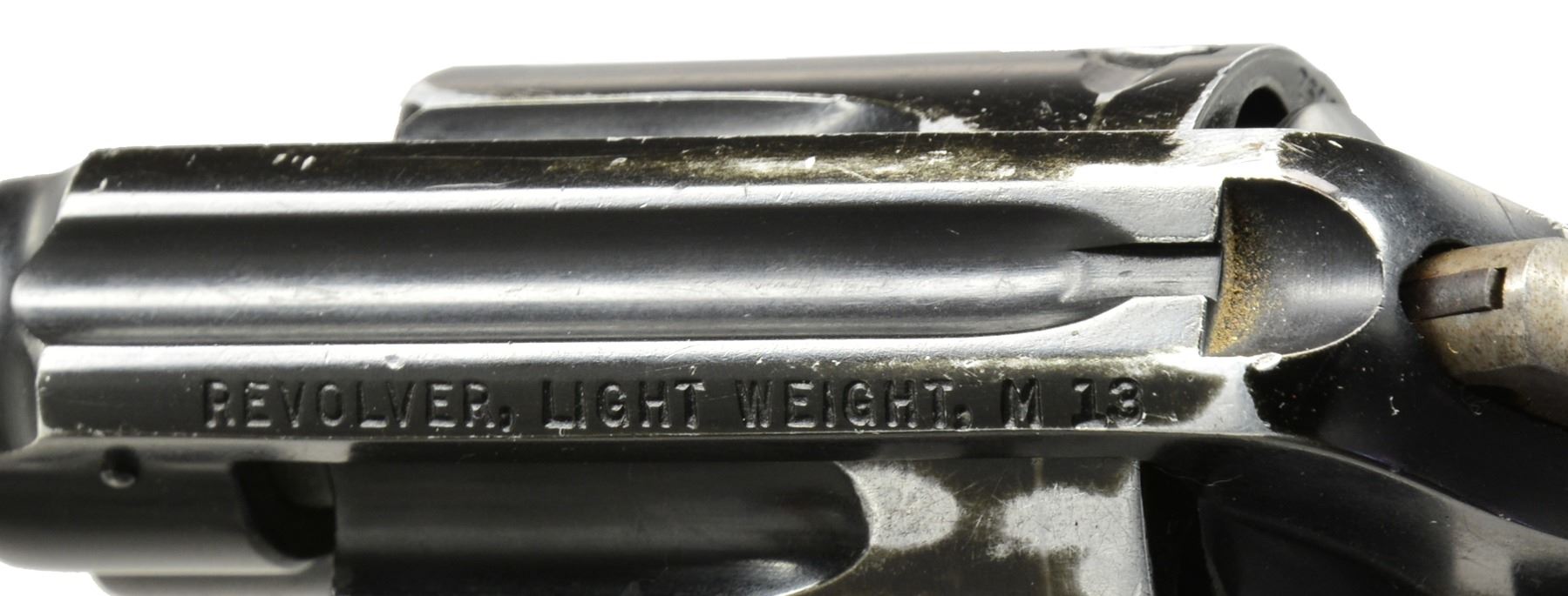 HOLSTER. Cal. 38 Spl. S# C261158. Bbl. 2" pinned w/ 1/10" serrated ramp sight plus frame notched rear. Mfg. 1953 (1951-1957) w/ alloy rnd. butt fame & cyl. for USAF. Colt produced similar revolver based on alloy framed Detective Special. Initial runs of both had "A.F." prefixed S#'s on butts; later S&W variants having regular S#'s beginning w/ "C". Some S&W J frames produced as well. Model 13's originally of 5 screw variation as is this one. All matching numbers of bbl., cyl., extractor & diamond center checkered Magna grips having S&W silver medallions. Approx. 40,000 units ordered, but most were destroyed after Air Force deemed them unsafe (1959) & ordered their destruction. Due to some stronger ammo being used in them, cyl.'s. split leading to unsafe declaration. Some pristine examples escaped destruction done by crushing or torching. Some were "salvaged" by fitting w/ steel replacement cyl.'s. This revolver has obviously been used & likely by USAF personnel. Cyl. latch is modified flat latch of steel believed to be second change having smooth edges. Left side of bbl. w/ "SMITH & WESSON"; right ".38 SPL. CTG.". 5392 assembly number on crane & yoke. Left side of top strap w/ "REVOLVER, LIGHT WEIGHT, M.13" plus "Property of U.S. Air Force" on backstrap. Standard case colored checkered hammer & grooved trigger. Face of recoil shield w/ steel bushing for extractor rod & extractor bearing surface. UNATTACHED ACCESSORIES: good plus matching black leather flap holster w/ "USAF" at top face of flap retained by 2 aluminum studs. White stitching w/ reinforcing rivets. Belt loop attached at rear in like fashion w/ two "Lift the Dot" snaps on front (1 missing base portion). CONDITION: fair to good appearance w/ noticeable holster wear; a used "survivor" w/ holster that missed the destruction program. Steel parts w/ light peppery oxidation. Fair to good grips w/ hand wear, light marks & weather checks at top of left. Near excellent bore. (20-900/NW). CURIO. $3,500-5,000.