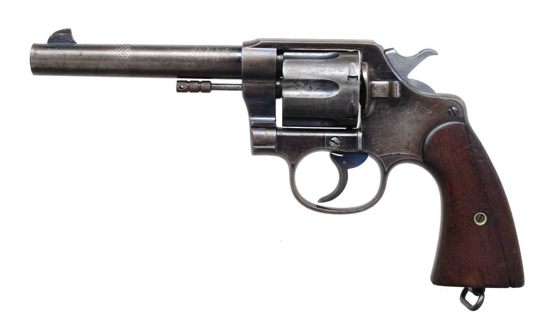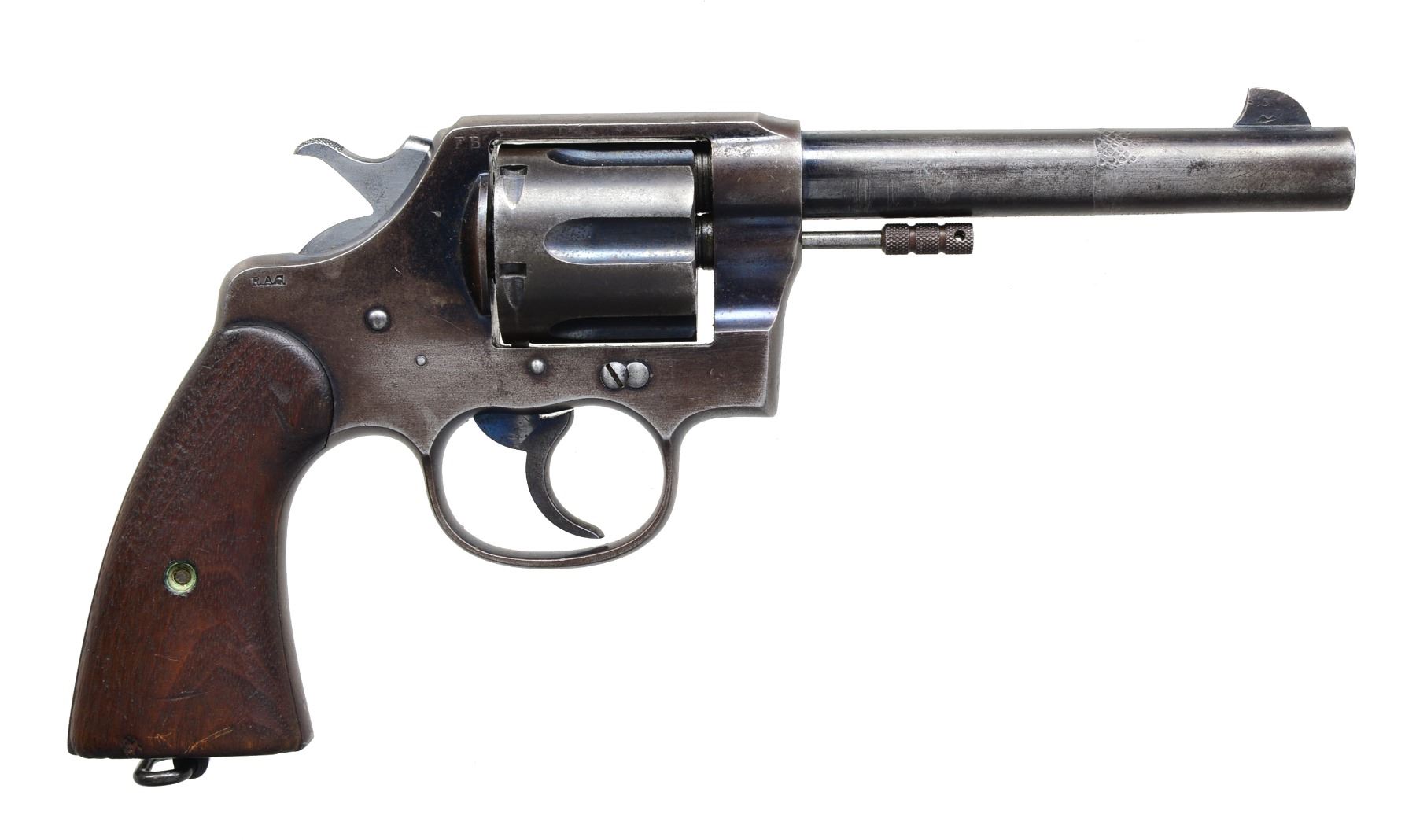 Cal. 45 Colt. S# 40843. Bbl. 5 1/2" w/ blade front sight & frame U notched rear. New Service Model for Army w/ smooth oiled walnut grips & blued finish. R.A.C. proofed bbl., cyl. & frame. Army info on butt w/ lanyard loop. Matching numbered early flat loading latch & grips. CONDITION: fair to good appearance w/ patina throughout. Sides of hammer cleaned to bright. Bbl. w/ 2 sets of clamp marks; 1 w/ cross hatch pattern. Repaired full length split at rear 1/4 of left grip. Traces of Niter blue on trigger. About good bore w/ strong rifling & occasional pitting areas. (20-798/NW). CURIO. $400-600.