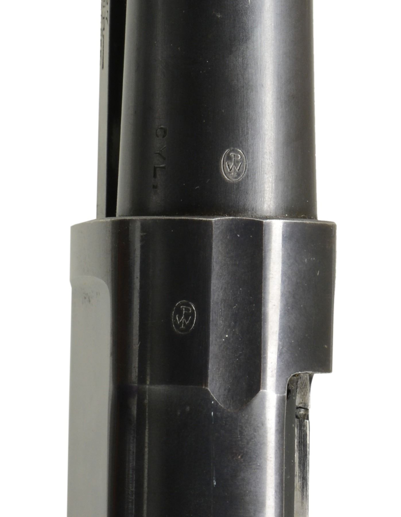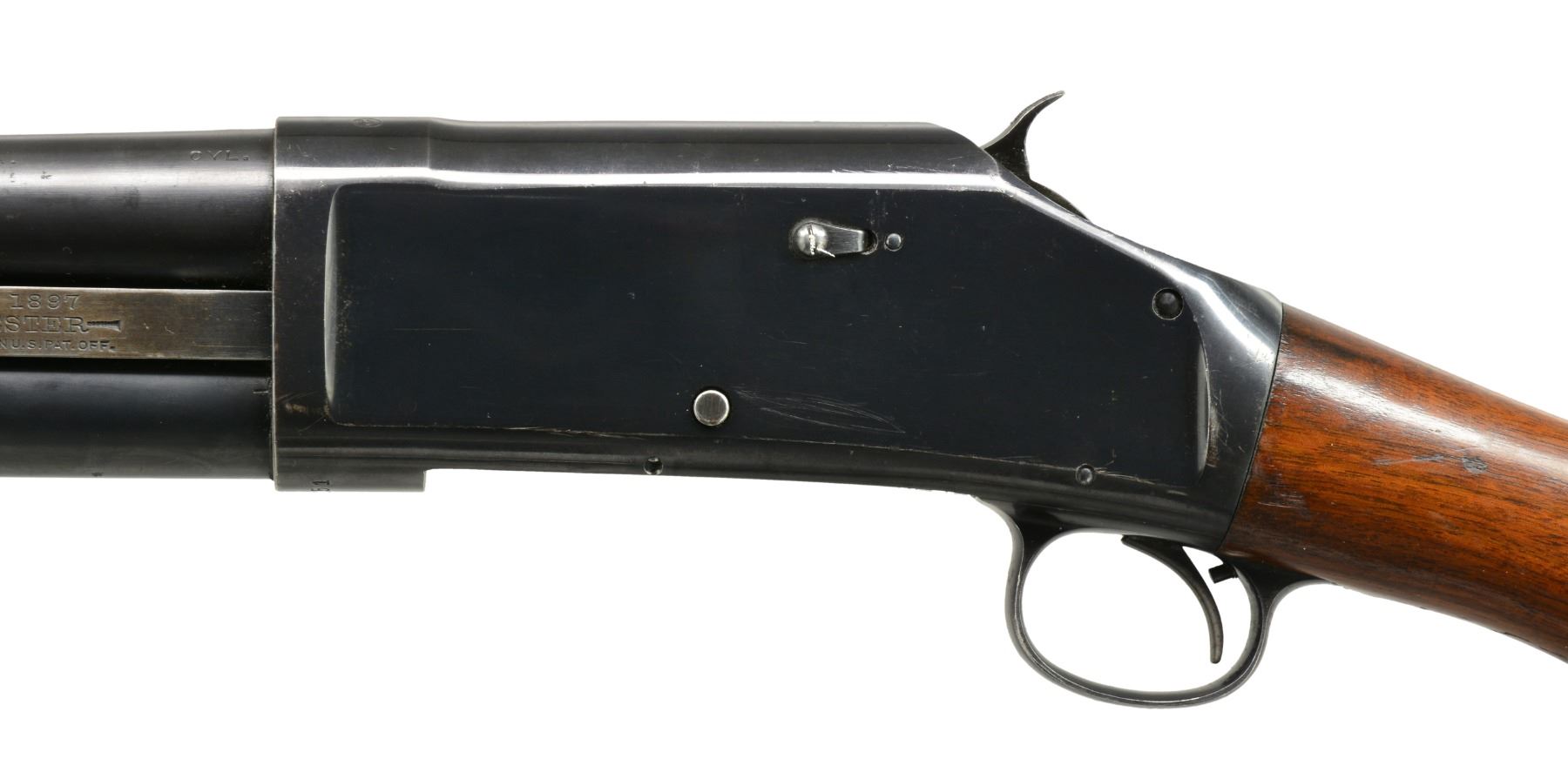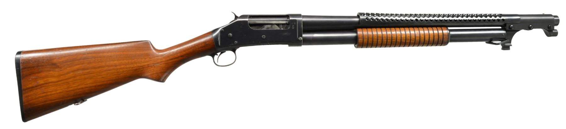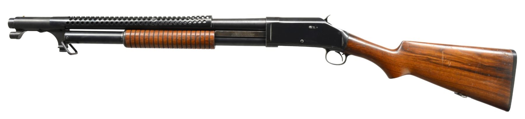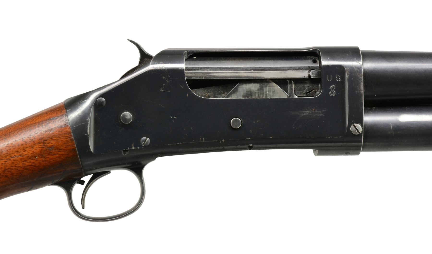 Cal. 12 Ga., 2 3/4". S# E669351. Bbl. 20 1/8". Solid frame. Receiver marked on top w/ "WP" proof. Marked on right side ahead of ejection port "US" w/ flaming bomb. Bbl. marked w/ "WP" proof on top & "CYL" on top left. Bbl. marking include "MANUFACTURED BY THE WINCHESTER REPEATING ARMS CO. NEW HAVEN CONNECTICUT USA " w/ patent date & "12 GA.". According to "COMPLETE GUIDE TO COMBAT SHOTGUNS" by Canfield, "Stocks & barrels may not have martial markings". Unmarked reproduction bayonet lug w/ metal perforated handguard. Handguard has 6 rows of perforations & brass bead front sight. Unmarked walnut stock set w/ high comb. Hard rubber checkered Winchester buttplate. Factory installed swivel in butt. CONDITION: stock set has original finish w/ light wear, scratches & handling marks. Metal retains 80% original blue w/ wear, scattered scratches & sm. spots of peppery oxidation. Bbl. has noticeable line of thin finish approx. 1/8" behind handguard. Brass bead sight on bayonet lug appears to be incorrect style & what appears to be a casting line is visible on bayonet lug. (20-1194/RW). MODERN. $2,000-3,000.