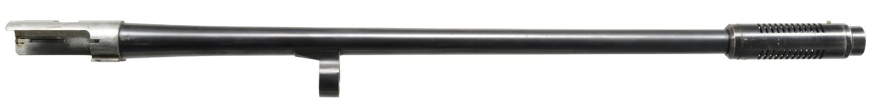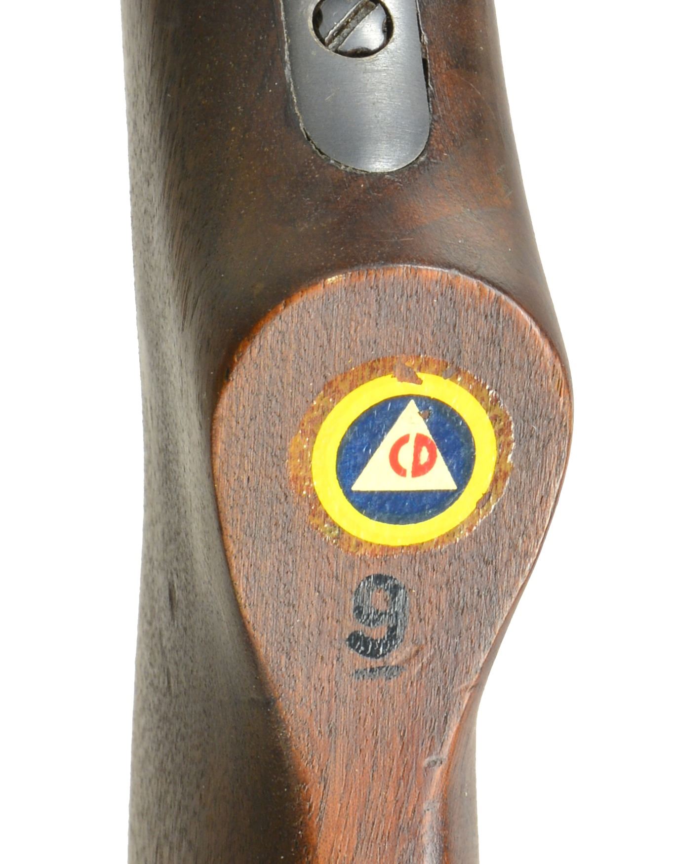 SHOTGUN. Cal. 12 Ga., 2 3/4". S# 489160. Bbl. 20". Later production gun w/ oil finished stocks & brushed blue "military finish". Receiver marked on left side "Remington U.S." w/ flaming bomb & "MILITARY FINISH". Bolt marked "MODEL 11". Bbl. markings include "REMINGTON ARMS CO", patent dates & "12 GA. FOR 2 3/4 OR SHORTER SHELLS CYL.". Steel bead front sight. Plain walnut stock set. Buttstock is marked below cheek area w/ crossed cannons & "FJA". Brown plastic Remington buttplate. Pistol grip has added circular "CD" decal & "9". Forend has grasping grooves. UNATTACHED ACCESSORIES: 26" bbl. including Lyman Cutts Compensator w/ spreader tube & steel bead front sight. Bbl. marked "Remington Arms 12 GA FOR 2 3/4" SHELLS, U.S." & flaming bomb. CONDITION: stock set has very nice original finish w/ crisp markings & light handling marks. Forend has 1" crack at bottom rear. Buttstock had QD swivel stud no longer present w/ missing chip in edge of hole. Metal has 80% blued finish w/ light wear & scattered scratches. Mag. cap has been fitted w/ swivel stud. Very good shiny bore w/ sm. streaks of fouling. (20-1196/RW). CURIO. $600-900.