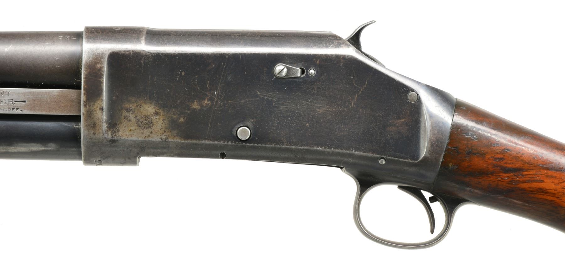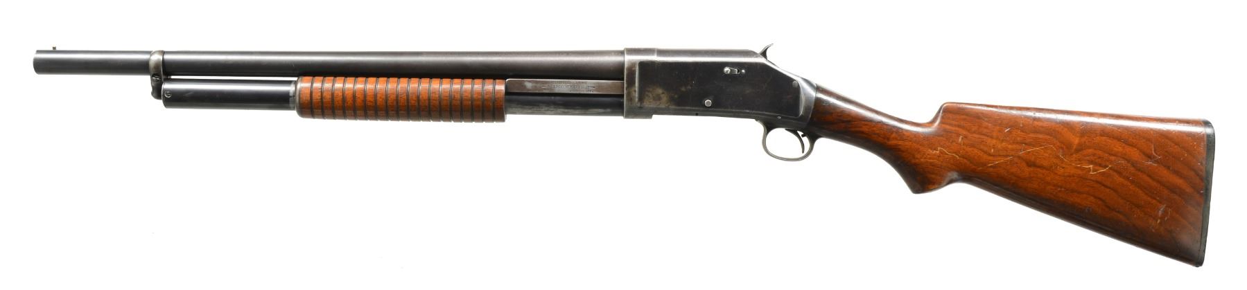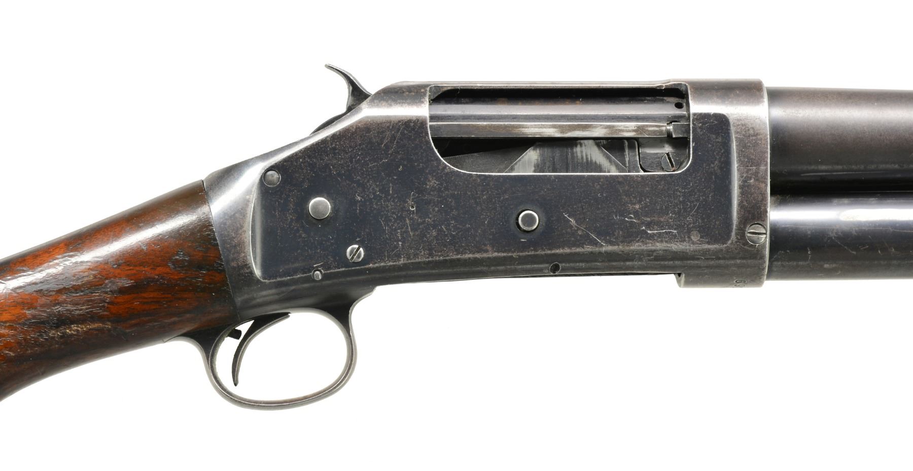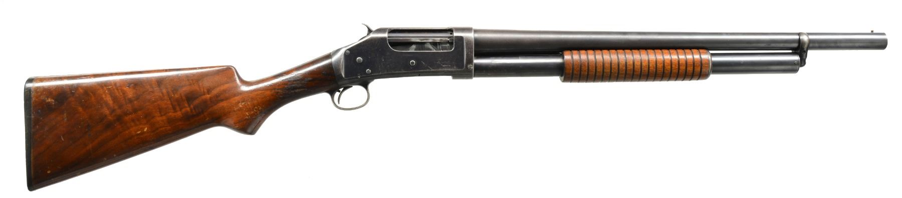 Cal. 12 Ga., 2 3/4". S# E691365. Bbl. 20" plain w/ fixed cyl. bore choke & brass bead. Grooved rnd. forearm & pistol grip stock of nicely grained walnut w/ original hard rubber buttplate. Mfg. 1919. CONDITION: 70% dull fading blue showing spots of freckling & areas of wear. Forearm has moderately worn finish showing handling marks. Stock shows areas of finish wear, numerous dents, scratches & handling marks. Buttplate has sm. chip at toe. Bore is clean & bright. (20-681/DS). CURIO. $600-900.