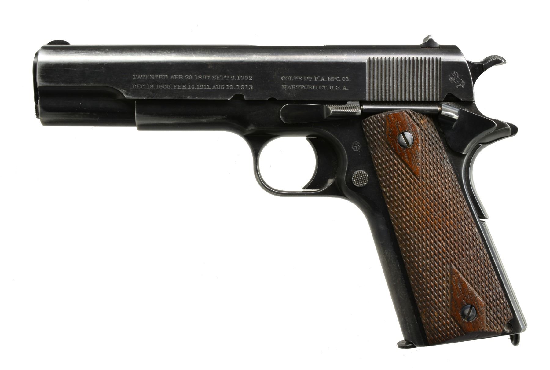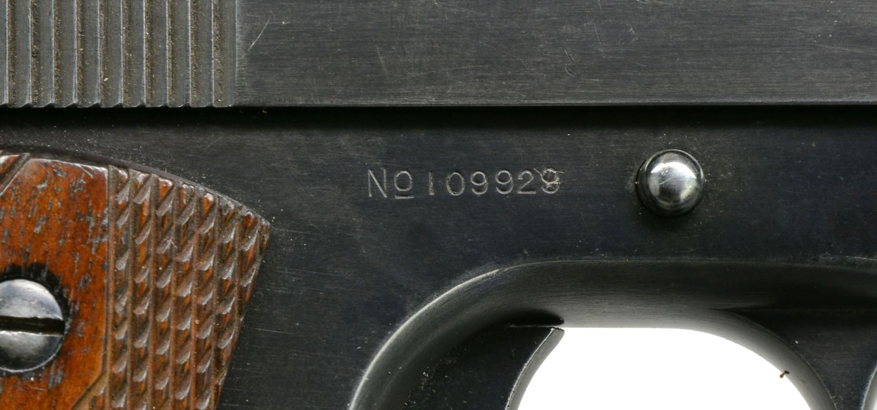 Cal. 45 ACP. S# 109929. Bbl. 5". Mfg. 1915 as part of 500 piece contract shipped to Brooklyn Navy Yard for Naval Militia. Special Navy & USMC contracts from 1915-1918 yet only this model has Navy marked slide. Frame has circled "GHS" inspector initials & "H" provisional acceptance mark (also on slide). Later Colt Type 6 bbl. w/ "G" in front of lugs plus later checkered slidelock w/out milling cut; all aspects correct to pistol. MAGS: 1 very good WWII General Shaver 7 rd. w/ deep swedged pins of Singer style but w/ normal spot welded seam at spine. UNATTACHED ACCESSORIES: 1 Colt refinished coin style key chain 3 point screw driver. CONDITION: good plus overall appearance as refinished w/all markings especially well preserved. Typical hand & holster wear throughout. Matching exterior bbl. wear w/ very good to excellent bore. Good plus grips w/ medium diamond top wear. (20-345/NW). CURIO. $2,500-4,000.