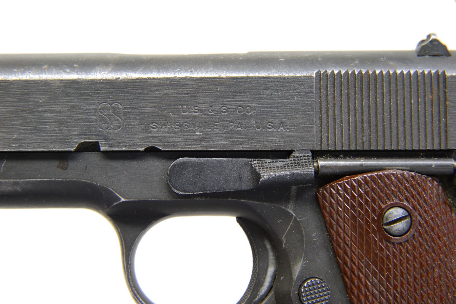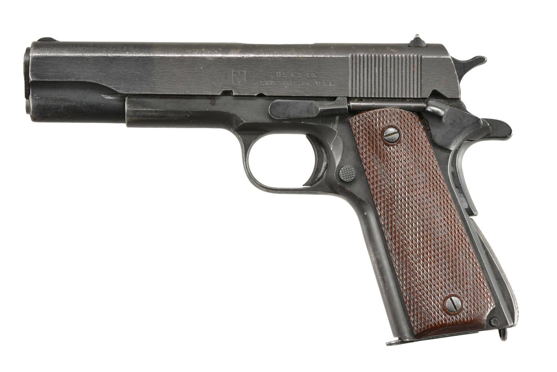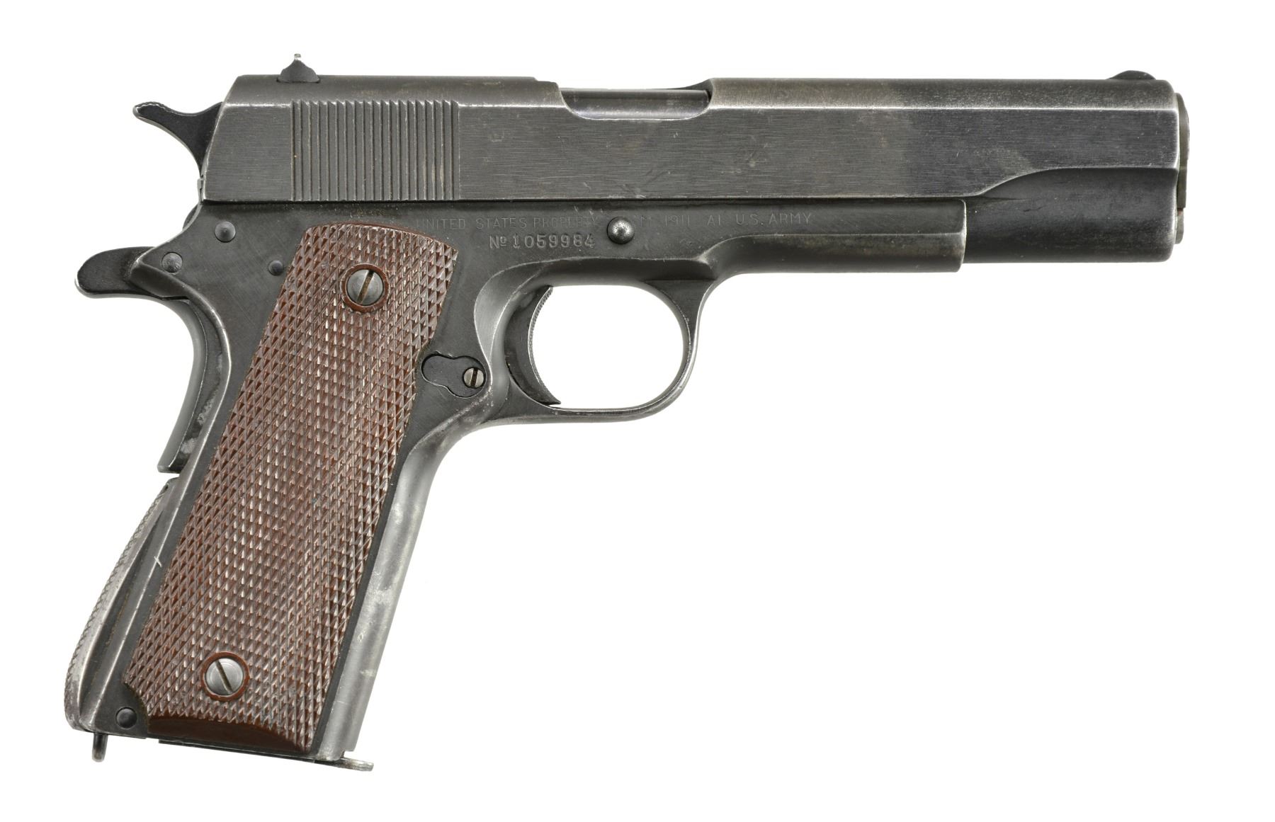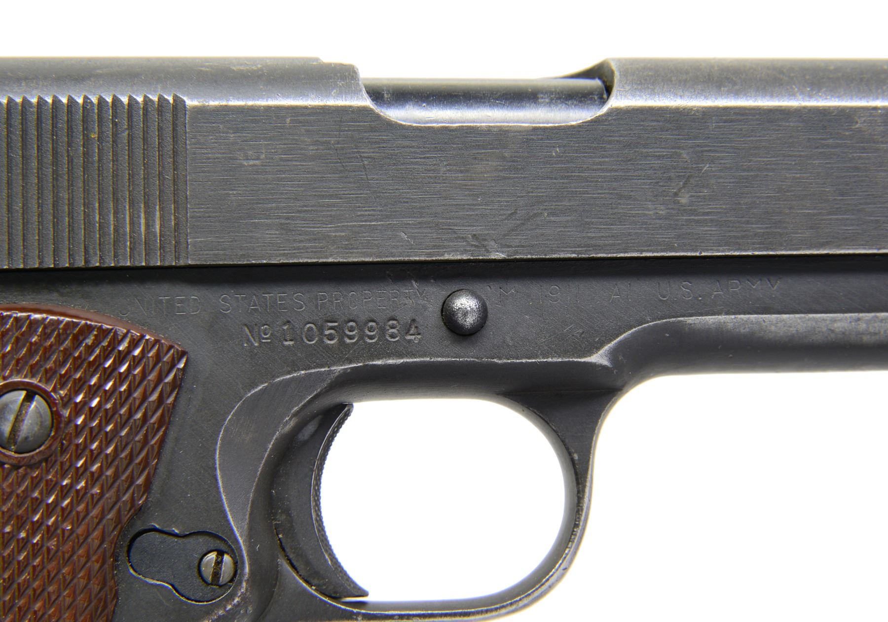 PISTOL. Cal. 45 ACP. S# 1059984. Bbl. is High Standard 5"; correct for later models. Highly sought model mfg. 1943 w/ all correct features except mag. as noted. Approx. 55,000 mfg. in Swissvale, PA. "P" firing proofs, Keyes Fibre "5" & Star marked plastic grips w/ small rings around screws, "R.C.D." inspector markings plus all other correct features. Finish has 2 tone (black / grey) appearance near front of slide. MAGS: 1 good plus 7 rd. Scovill ("S" on top of lip) as used in Colts ("C-S" on bottom of lip) having some spots of light pitting. CONDITION: very good overall appearance w/ typical high point wear most noticeable on front strap; minimal wear on grip safety. Typical scratch from improper slide stop installation. Hand wear to butt area of grips; especially left. Wear on front sight blade plus metallic marks to its serrations. Near excellent bore. (19-4615/NW). CURIO. $2,000-4,000.