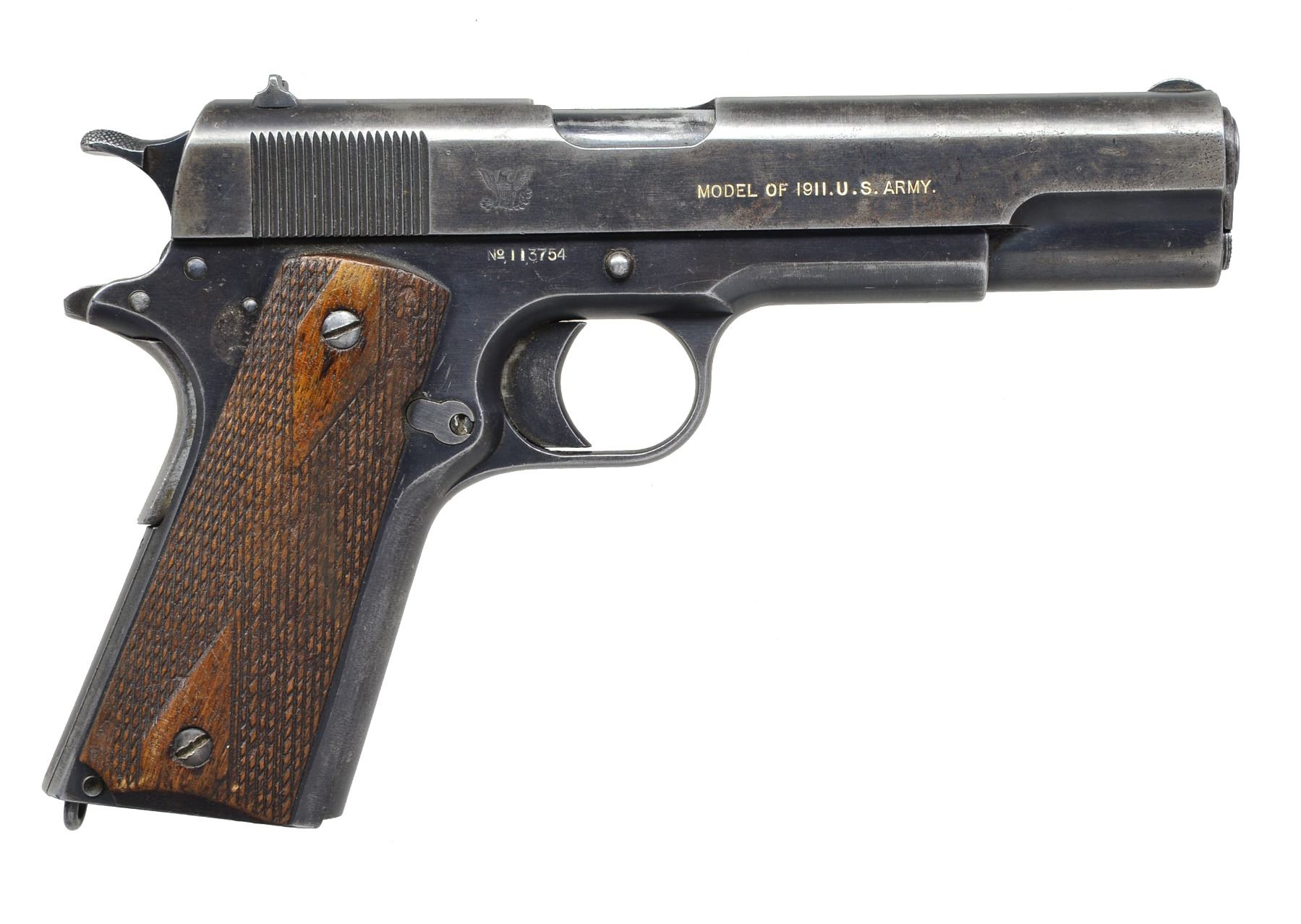 Cal. 45 ACP. S# 113754. Type II Springfield bbl. 5" properly marked w/ "S" on right side of lug & "P" on left plus "M" on rear of hood. All appropriate small parts "S" marked. All features are period & correct. Slide has proper tapered semi circular front sight w/ flat top U shaped fixed rear sight. Rear left side of slide has ordnance bomb w/ bullseye & cannonball inspection mark. Proper long beavertail rounded spur hammer. All sm. parts are believed to be proper. 2 Piece checkered walnut lg. diamond grips. Serial number indicates production period April 1914 to April 1917. MAGS: 5 total; 7 rd. detachable; 4 are Springfield Armory w/ case colored upper & niter blue lower body w/ sides that clip under the base; 1 is Colt production 2 tone w/ pin base. UNATTACHED ACCESSORIES: Mills canvas mag. pouch dated Oct. 1918. 20 Rnd. box of 45 ACP ball ammo. from Frankford Arsenal, lot # 325; box is partially opened. CONDITION: retains 60% dull fading blue showing sm. dents & spots of very light pitting, markings have added white filler. Grips have dark worn appearance, checkering shows some chip & worn diamonds. Bore is dark w/ worn rifling. (20-1153/DS). CURIO. $1,000-1,500.
