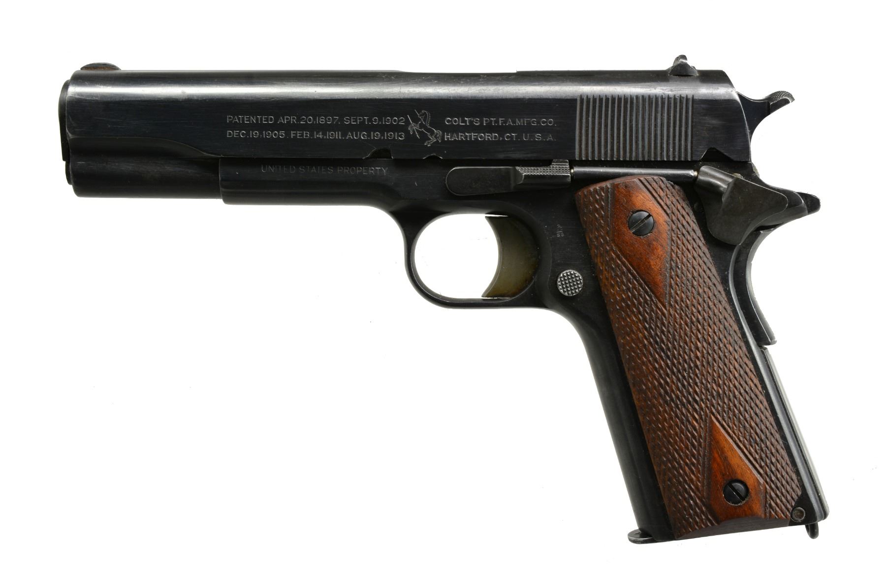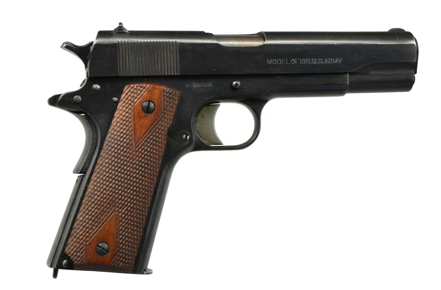 Cal. 45 ACP. S# 395591. Bbl. 5". Mfg. 1918 as part of Army contract. S8 proofed w/ replacement parts to include: type 18 High Standard bbl., commercial reproduction dbl. diamond grips, extractor & parkerized safety tab w/out undercut. MAGS: good 2 tone American Pin 7 rd. CONDITION: very good refinished appearance w/ slide markings well preserved. Frame has occasional cloudy areas, occasional light prior marks & restamped serial #. Trigger has gray almost in the white appearance plus finish loss on mainspring housing & frame pins. Very good bore w/ appearance of light fouling in corners of grooves. (19-5985/NW). CURIO. $1,000-1,500.