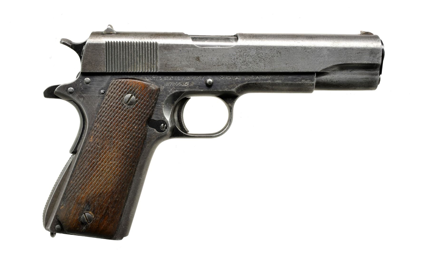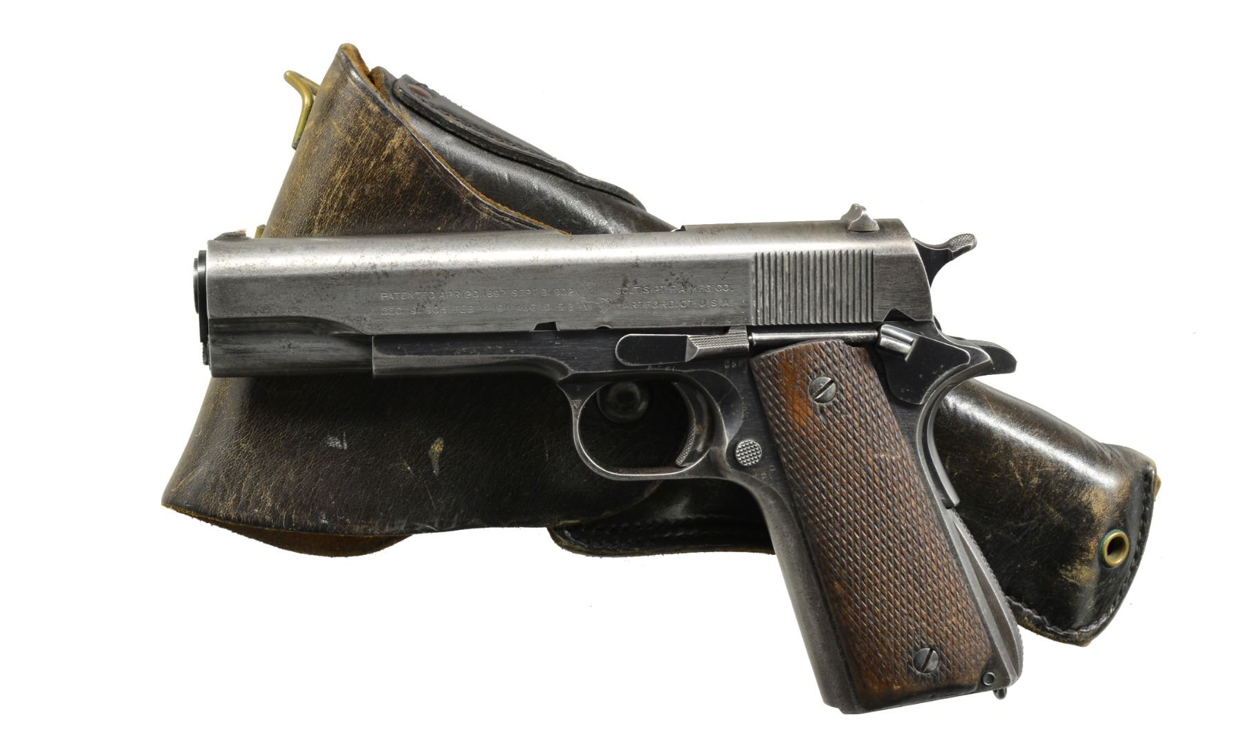 Cal. 45 ACP. S# 720516. Bbl. 5". Mfg. 1941 (4,696 units) along w/ 500 units by Singer; both Army contract. Matching numbered slide w/ modified front sight having squared face & thin layer of copper added to top rear half yielding sm. copper aiming point at rear. U notch rear sight. High Standard bbl. instead of Colt Type 6. All checkered controls w/out milling cuts for slide lock or safety tab. Coarse checkered arched mainspring housing. Fully checkered walnut grips. CSR inspector marks by slide stop & disconnector. Left side of trigger guard has "T" over "VP" proof; right side w/ "69". MAGS: 2 7-rnd. blued mags marked "Colt/45 Auto" on baseplate. UNATTACHED ACCESSORIES: good black snap latch flap holster w/ brass web belt hooks plus belt loop. CONDITION: fair overall appearance w/ no finish remaining on slide that has light pitting & stained appearance plus extractor protruding at rear. Significant wear in grip area w/ front strap having cleaned light pitting. High point wear & scratches throughout mixed w/ areas of light oxidation. Noticeably worn grips; especially near butt & most noticeably on right. Stripped lower right grip screw bushing. Fair bore w/ wear & even frosted appearance. (20-437/NW). CURIO. $1,000-1,500.