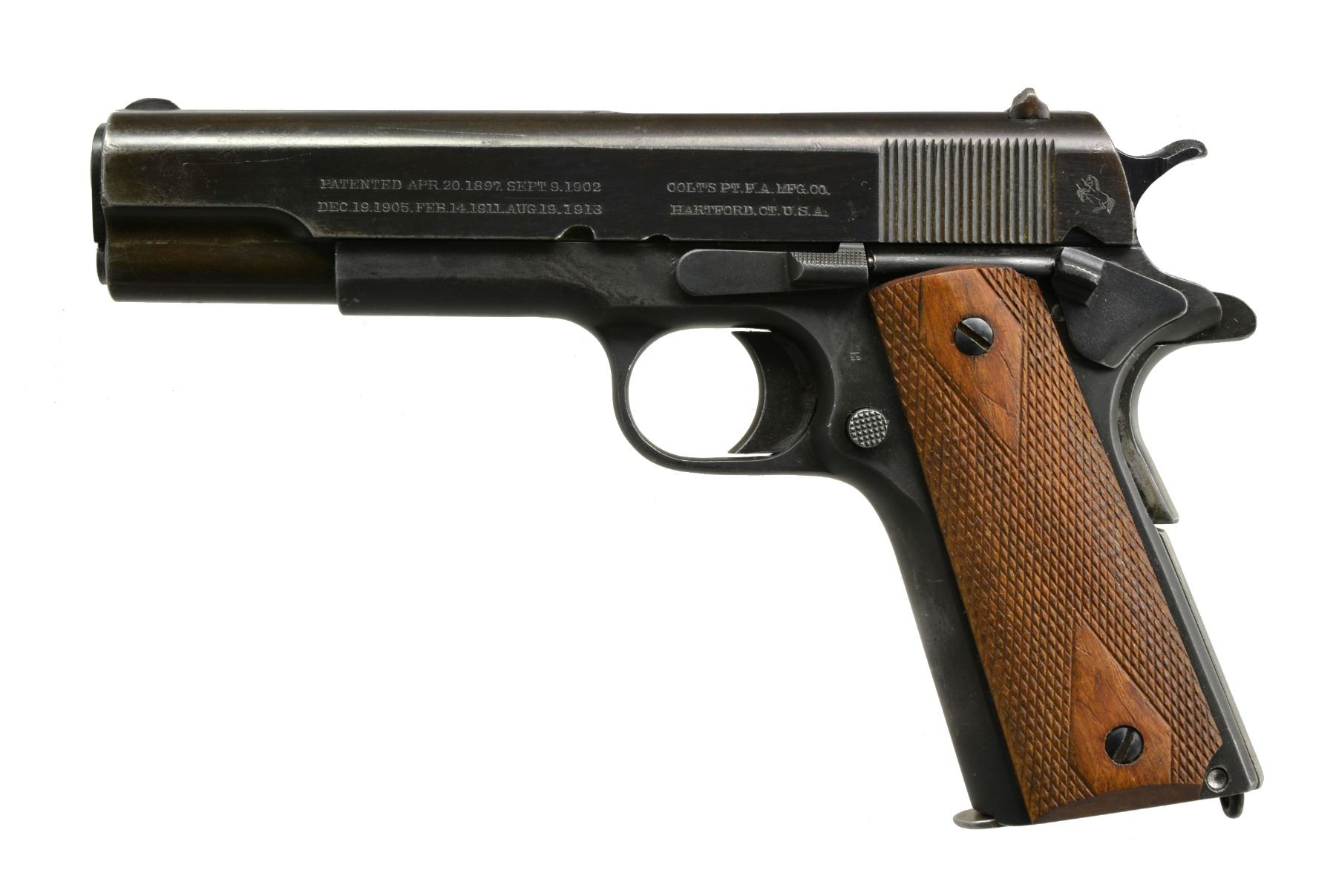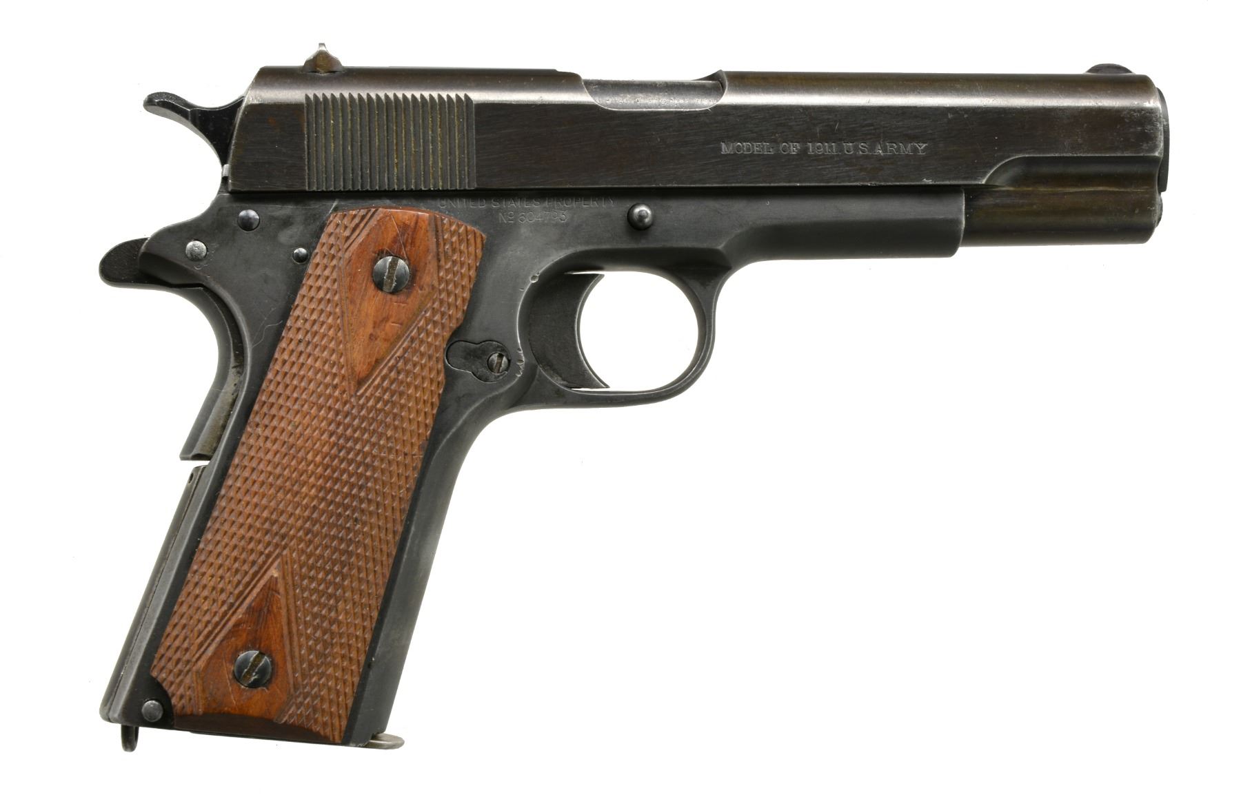 Cal. 45 ACP. S# 604793. Bbl. 5". Mfg. 1919 as part of Army contract. All correct features for model except earlier safety tab w/ milled undercut & Type 4 bbl. used before S# 450000. Does not have "H" provisional acceptance mark on frame. "S5" proof & "8" assembly # at lower left of trigger guard. Slide has dark blued finish & frame has faded black parkerized finish. Commercial replacement dbl. diamond walnut grips. MAGS: 1 fair Ridson 7 rd. CONDITION: good overall mismatched appearance; frame appears original finish w/ thinning in grip area & at some high points. Slide sits slightly forward on frame w/ refinish over some light pitting near muzzle. Noticeably light trigger pull yet hammer does not follow slide. Very good grips w/ some diamond top wear on left. Good to very good bore w/ frosting. Mag. housing pin is in the white. (19-5988/NW). CURIO. $900-1,400.