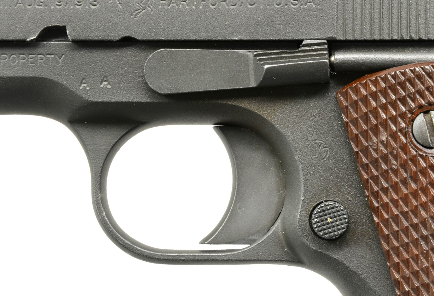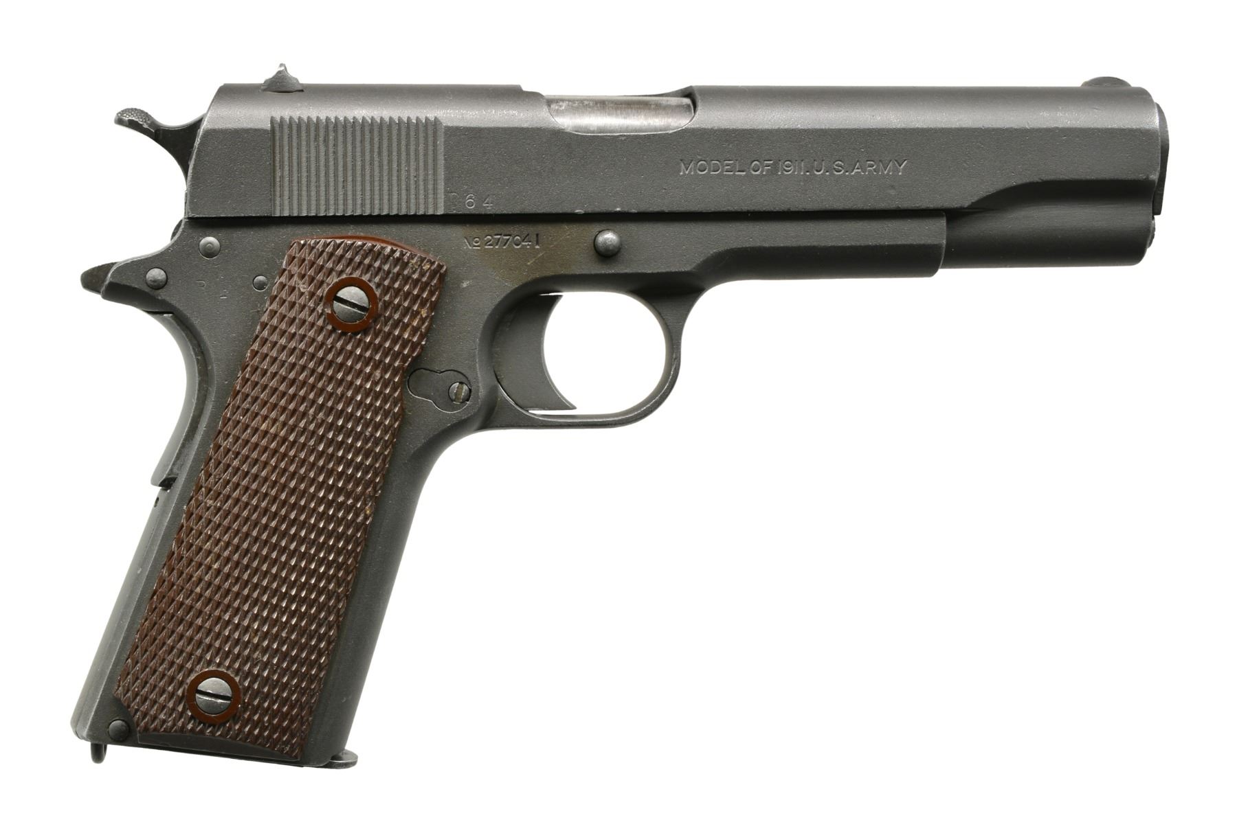 Cal. 45 ACP. S# 277041. Bbl. 5". Mfg. 1918 for Army & later reworked by Augusta Arsenal having "AA" mark above left front of trigger guard & "RF" on right side of frame below hammer pivot; standard "JMG" inspector mark. Slide has "H" provisional marking at rear, "RF" behind left cocking grooves & "D64" in front of right cocking grooves. Checkered Coltwood grips; Type 5 sm. ring hollow backed on left & ribbed Type 7 lg. ring on right. Proper Colt Type 4 bbl. Later production grooved slide stop & safety tab. Later Type D borderless checkered hammer. All parts other than bbl. are parkerized. MAGS: 1 good 2 tone American Pin 7 rd. CONDITION: very good overall appearance w/ slight high point wear plus function wear on bbl. at port. Like condition; grips & good bore w/ even light frosting. (20-18/NW). CURIO. $900-1,400.