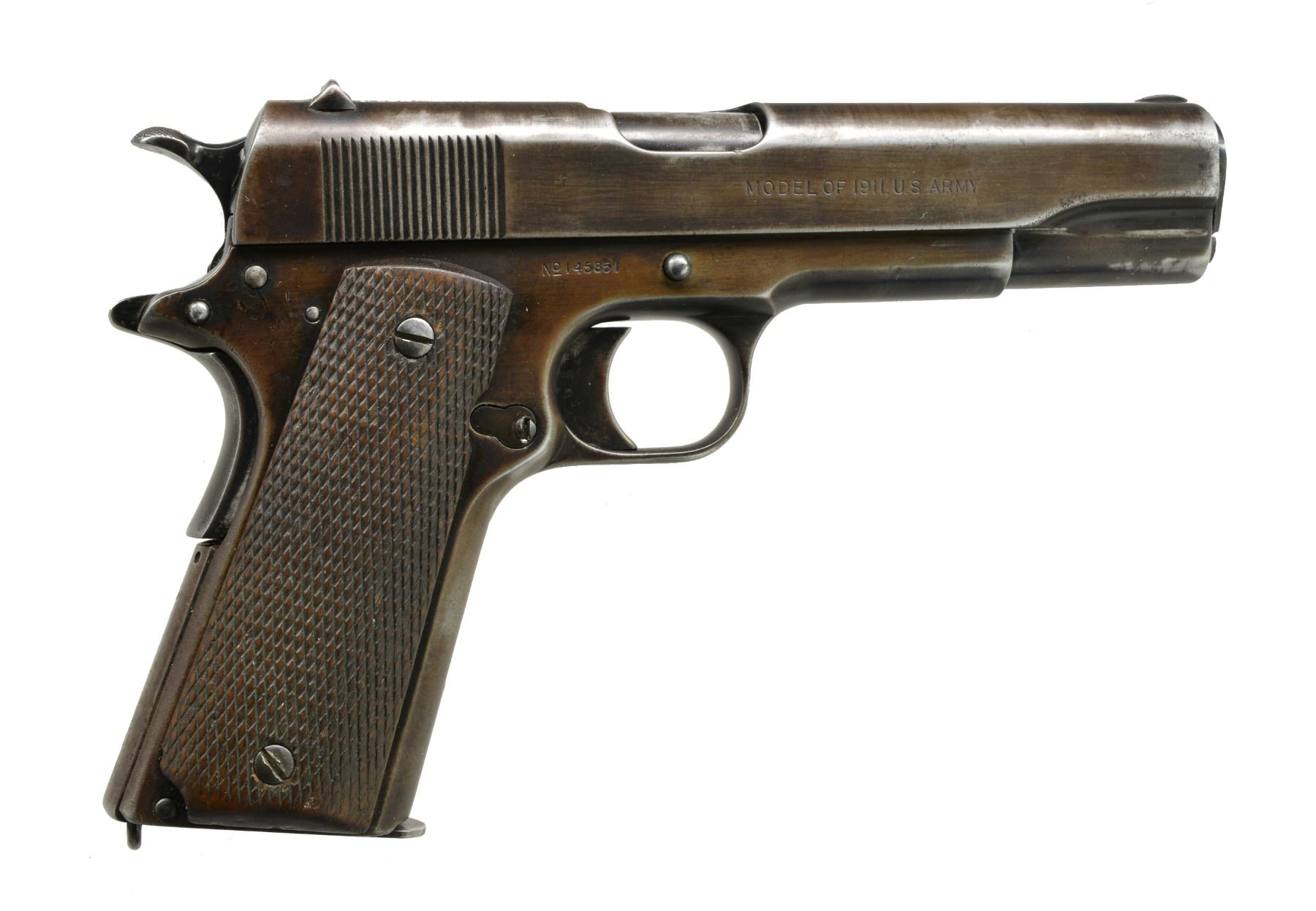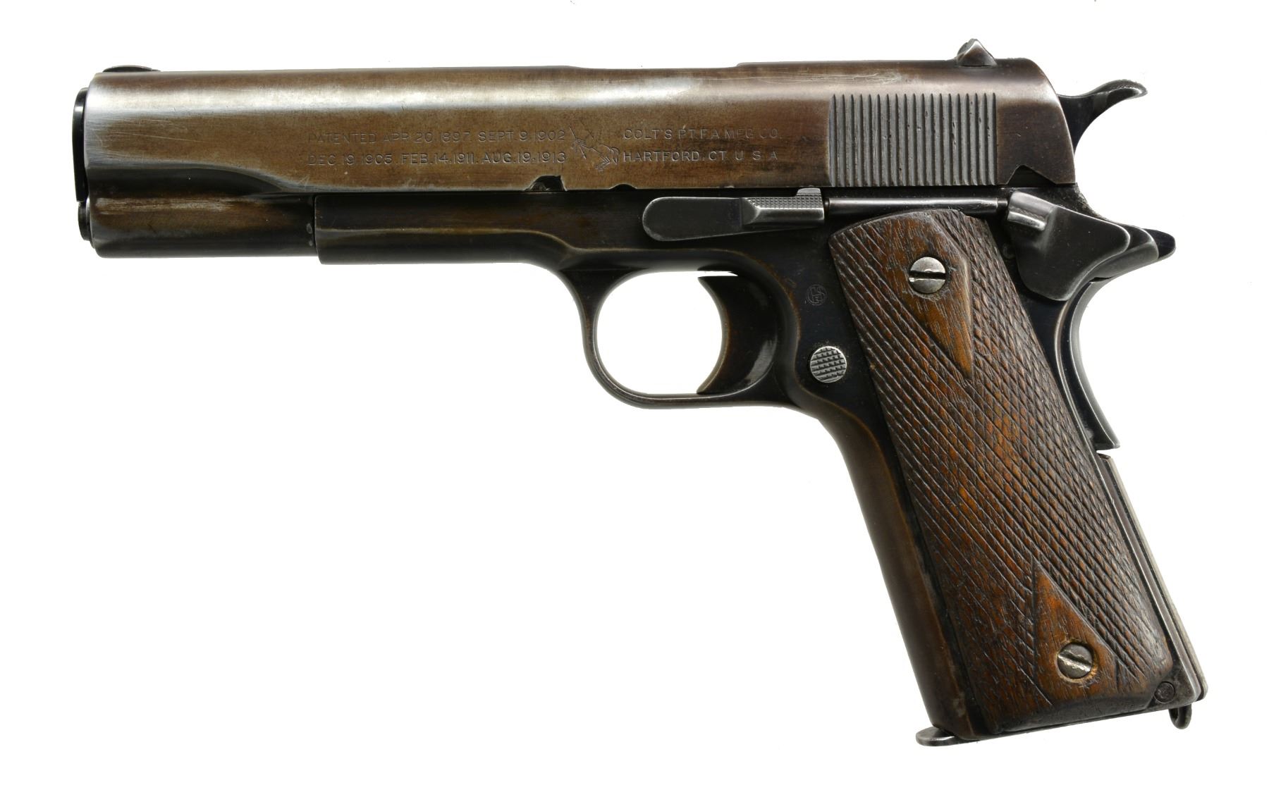 Cal. 45 ACP. S# 145851. Bbl. 5". Mfg. 1917 under Army contract. All correct features except bbl. is Colt w/ "G" in front of lugs but void of any other marks plus mismatched grips; dbl. diamond left, full checkered right. "H" provisional inspection mark on frame & rear of slide. MAGS: 1 fair 2 tone Colt 7 rd. CONDITION: generally good appearance as refinished w/ thinning in grip area along w/ peppery oxidation on mainspring housing. Slide has abundant holster & use wear. Medium exterior bbl. wear along w/ circular punch marks on each side of bbl. lugs to retain link pin; good bore w/ traces of light frosting. Noticeably hand worn grips; more on left. (20-346/NW). CURIO. $900-1,400.